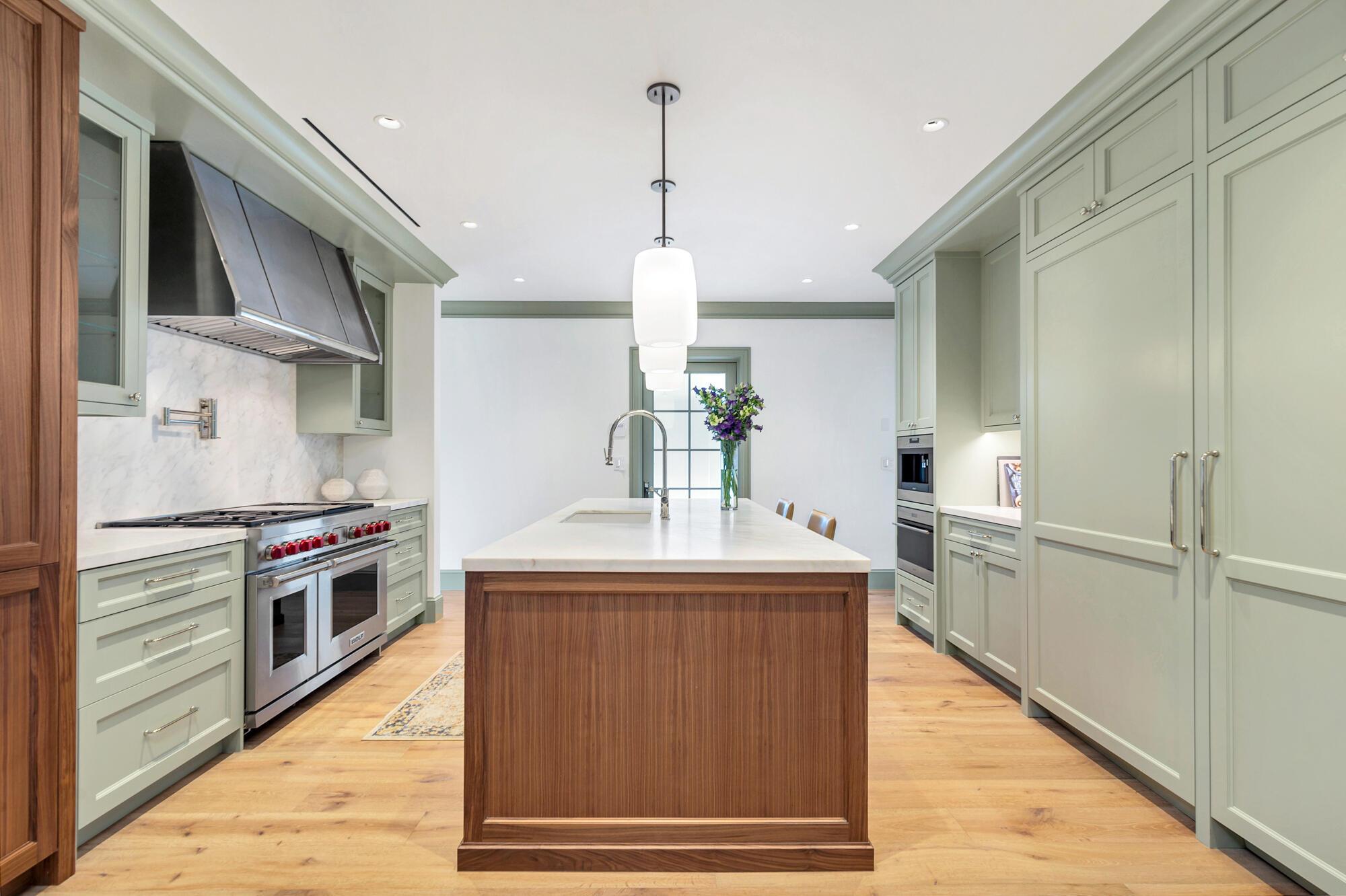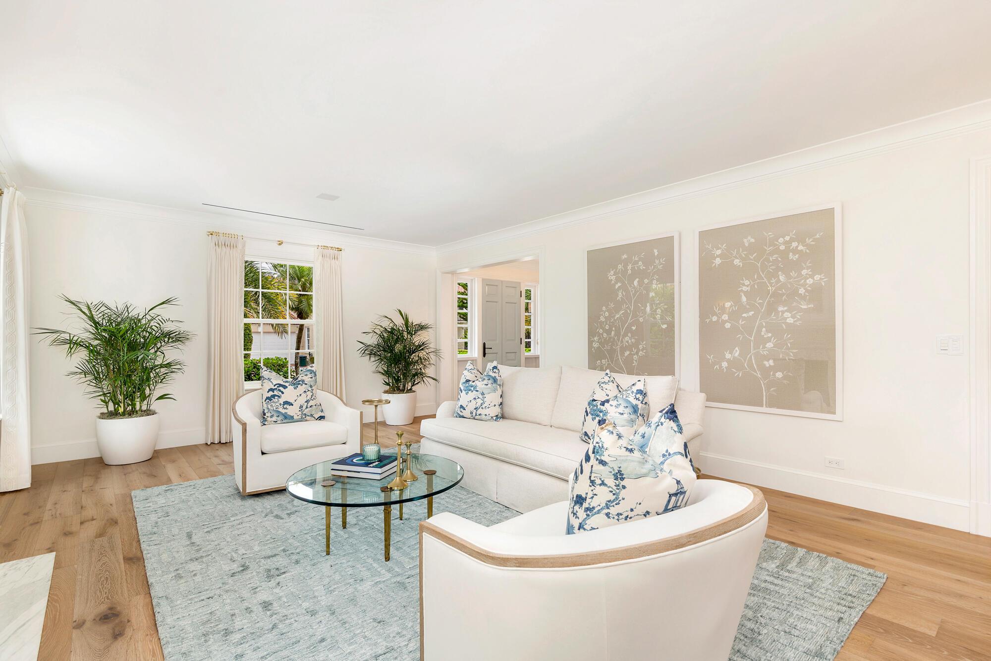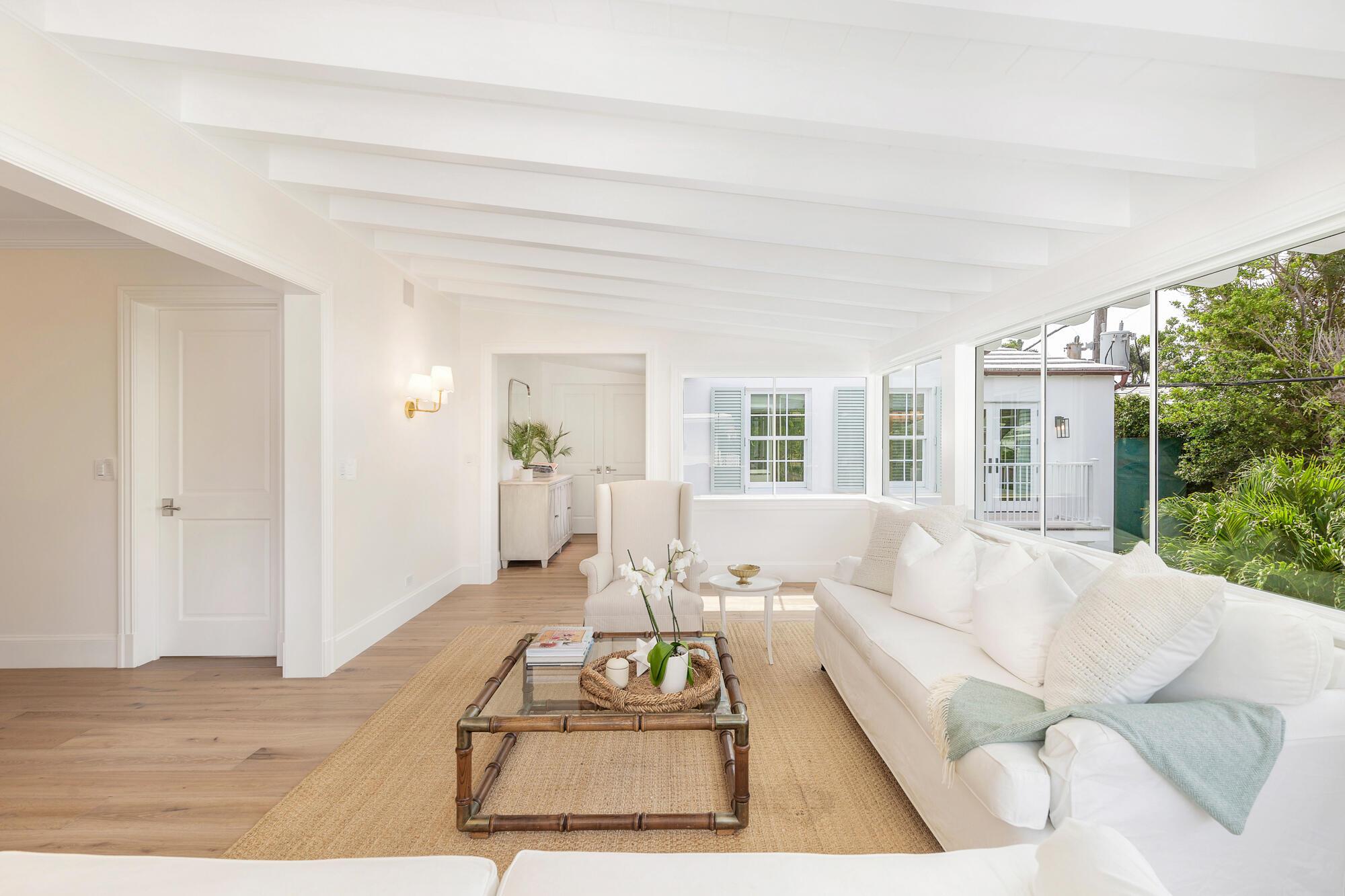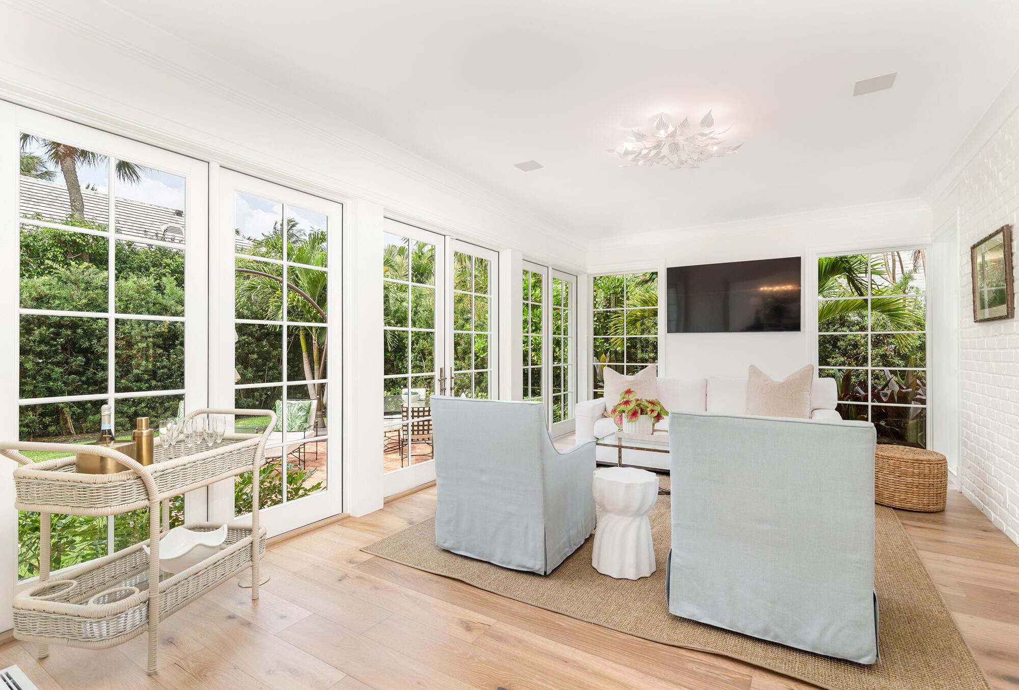 Located on a desirable in-town street, this 4,500-square-foot Palm Beach Island residence was originally designed by Gustav Maas and reimagined by Smith Kellogg Architecture with interiors by Carolyn Roy of CR Studio.Upon entering, the foyer opens to a formal living room with a fireplace, which flows into a bright sunroom overlooking the backyard. Adjacent is a dining room with a bay window that frames views of the pool and landscaped grounds.The kitchen is equipped with top-of-the-line appliances, including a full-size Sub-Zero refrigerator and freezer, gas range, and custom range hood, and pendant lighting reclaimed from the Netherlands. A walk-in butler's pantry with a wine refrigerator and additional storage sits directly behind. A door leads from the kitchen to the backyard