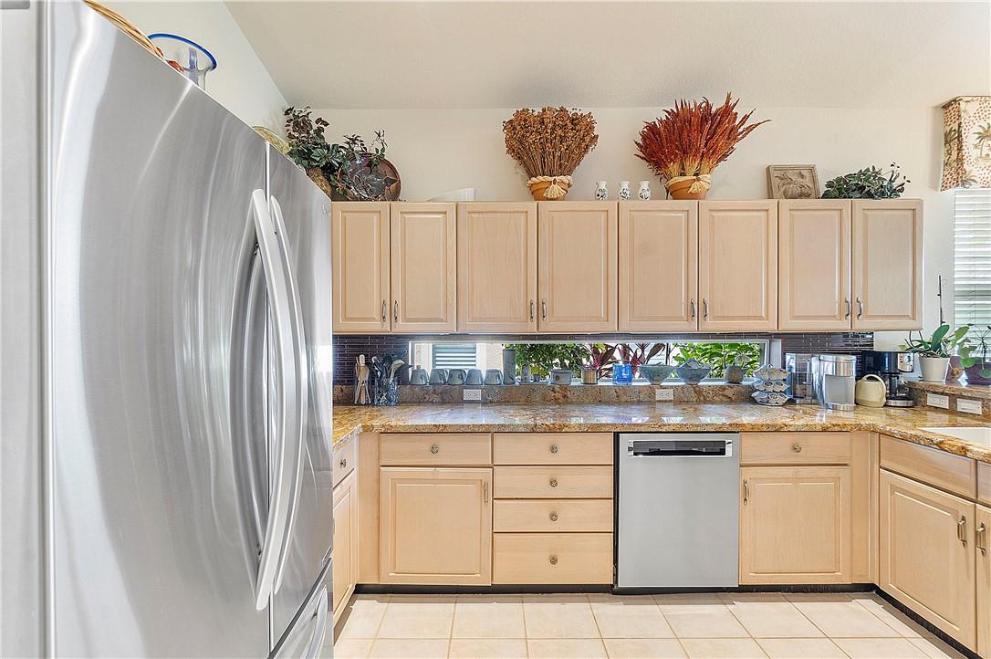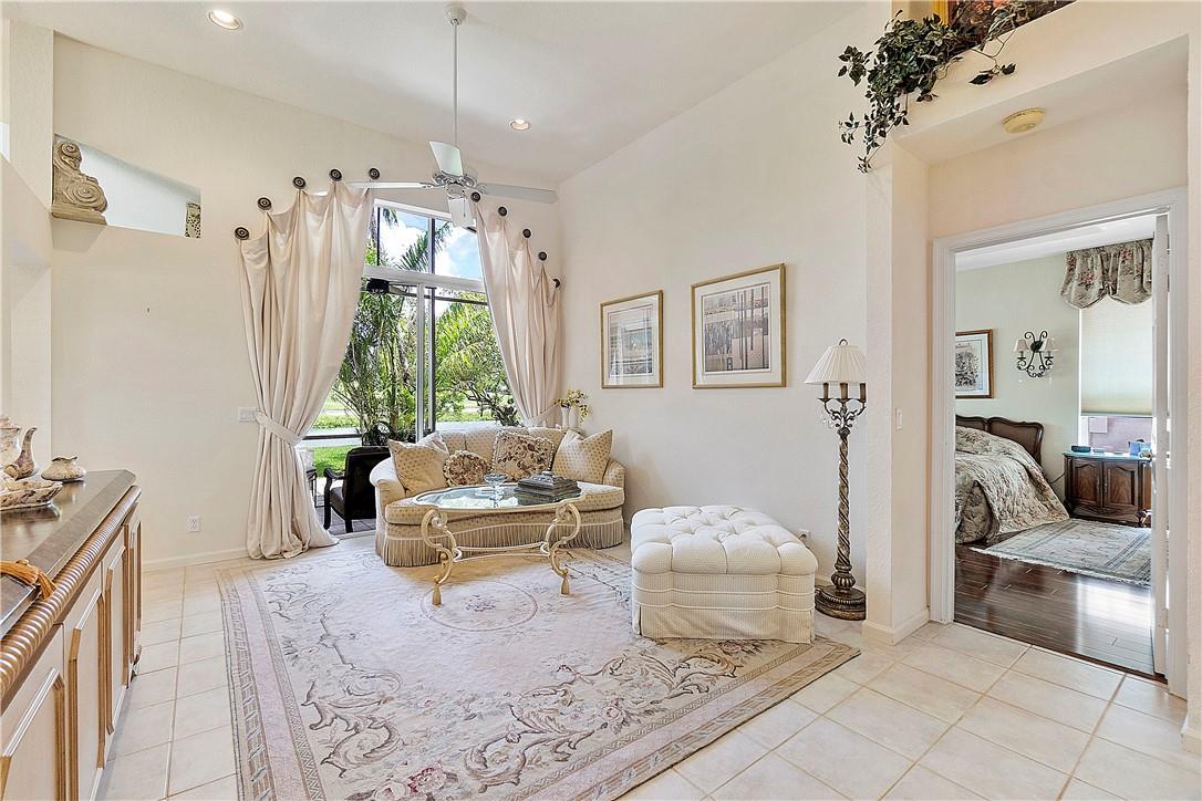 Welcome home in this 3 brs and 2 bath retreat on the lake and golf course. 2019 Roof. Impact Glass Front Door. As you step inside, you'll be greeted by beautiful tile floors throughout the main areas, while the bedrooms boast stylish laminate flooring. The house features a formal dining room and formal living room, perfect for hosting guests and creating lasting memories. A cozy family room provides a relaxing space for everyday activities. Prepare meals with joy in the spacious kitchen, equipped with granite countertops, ample cabinets, and a convenient pantry with pull-outs. The large primary suite is a true retreat, featuring two walk-in closets to accommodate your wardrobe. In the primary bathroom, indulge in luxury with a separate tub and shower, as well as two vanities.