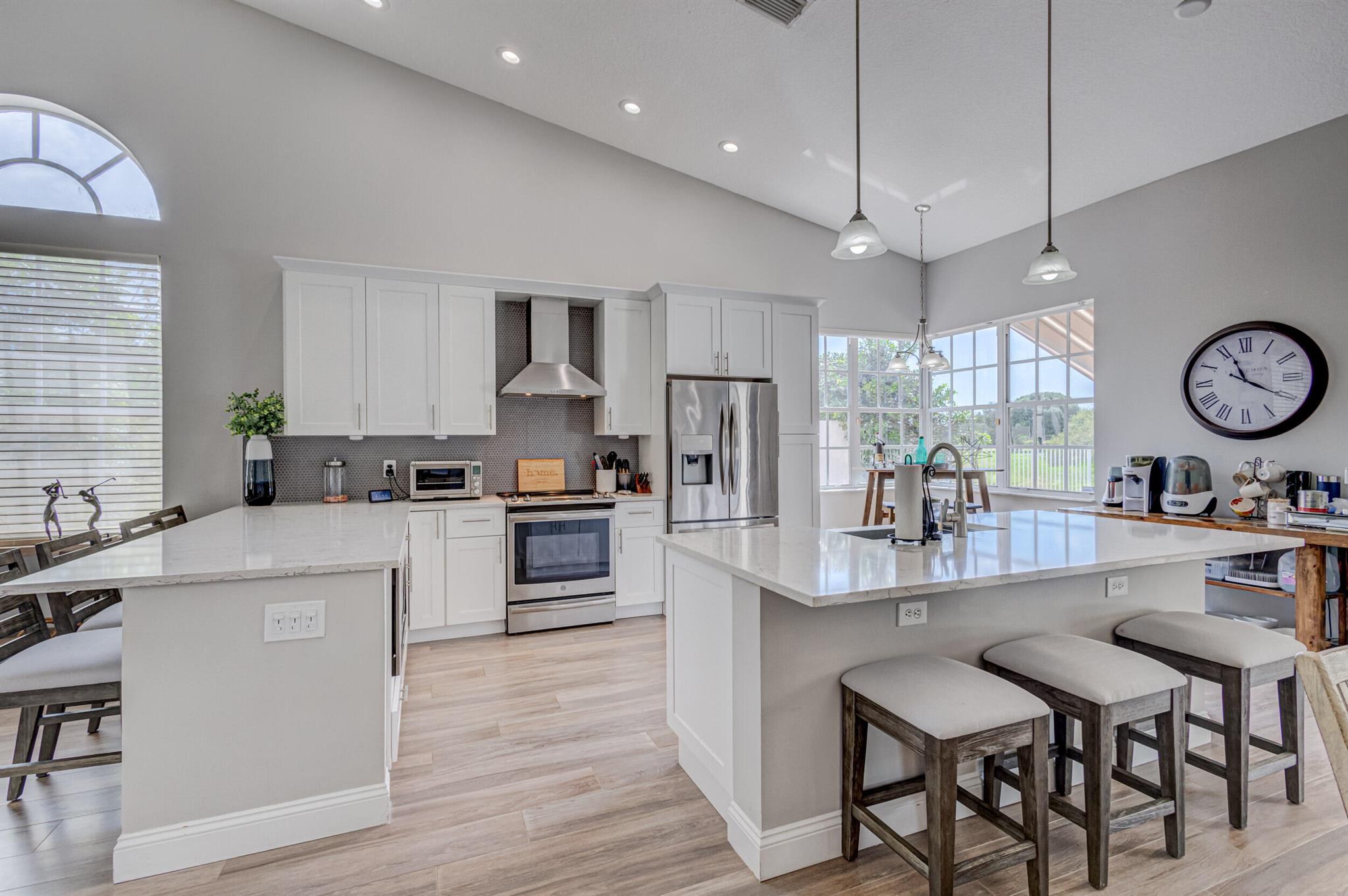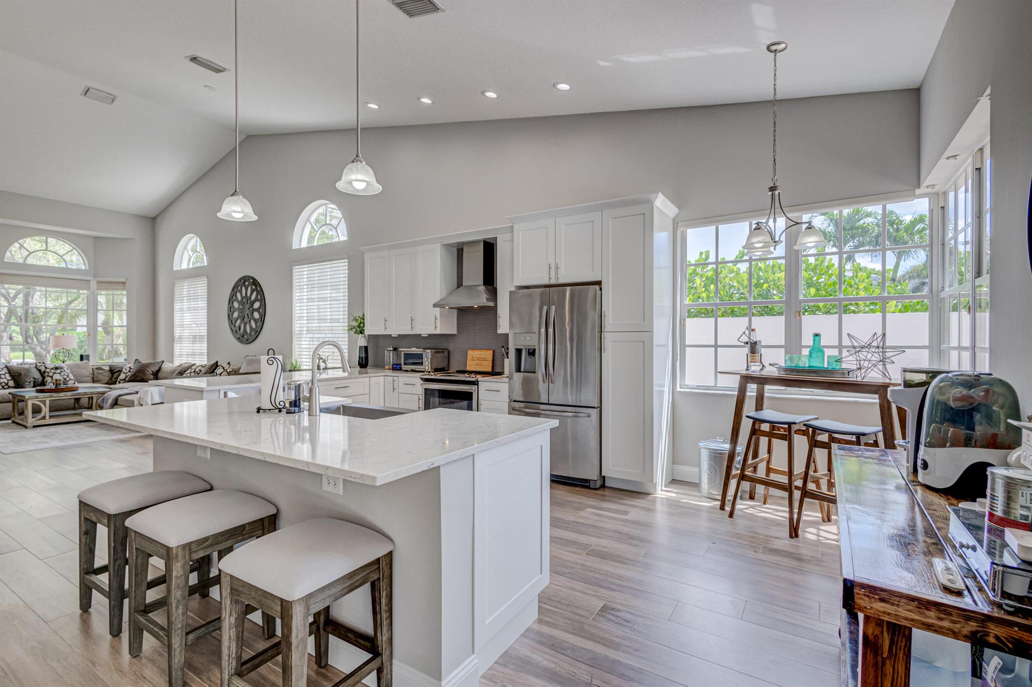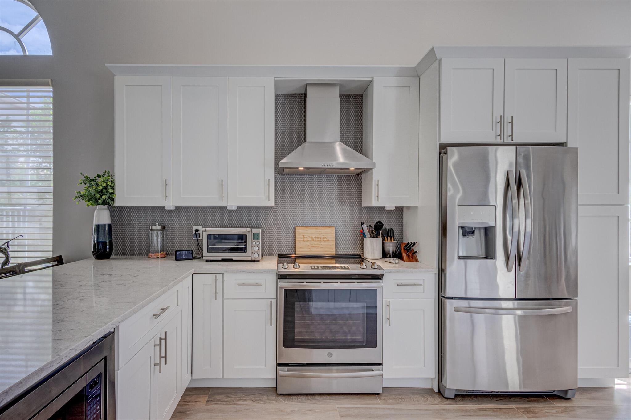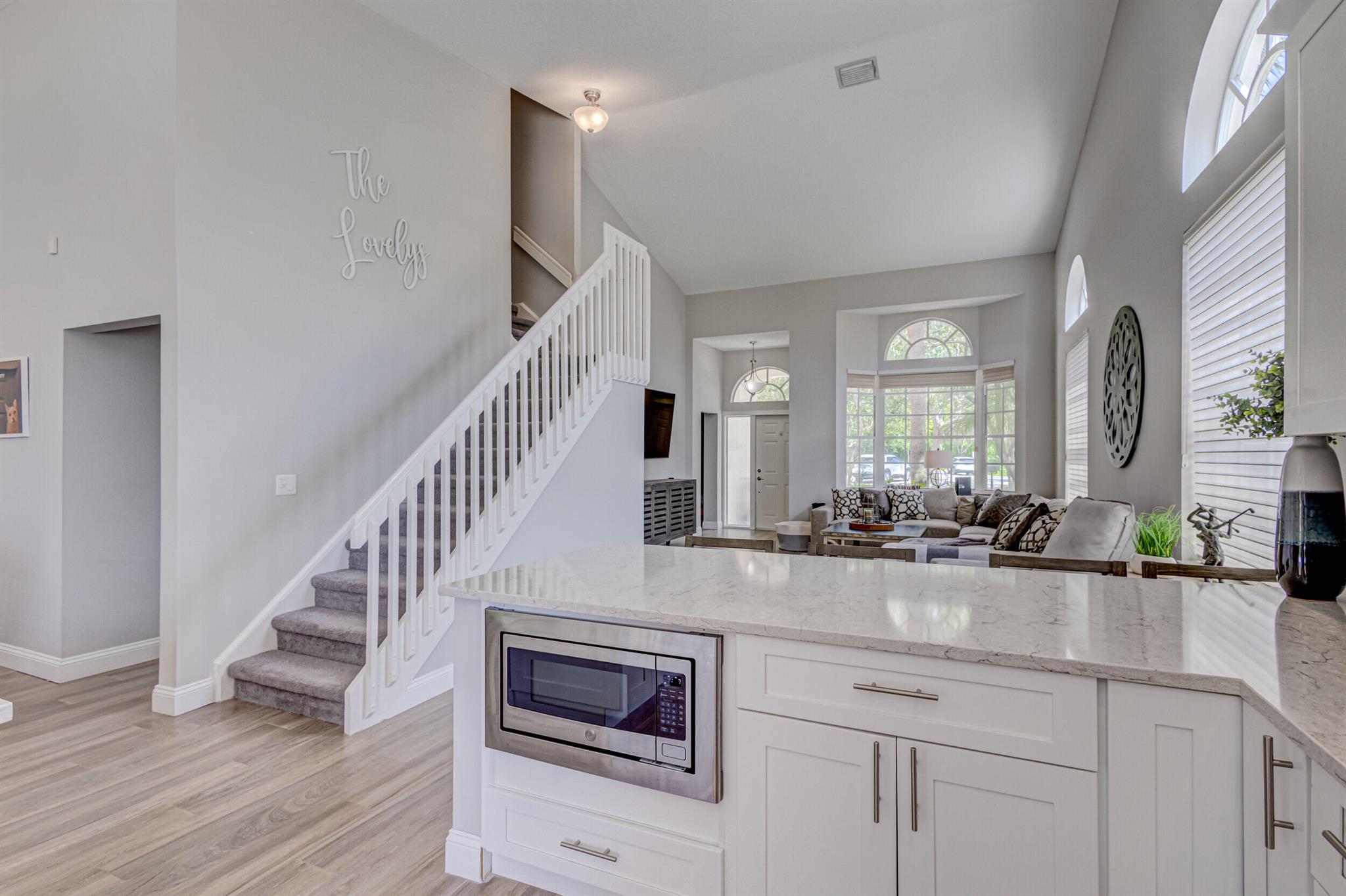 Spectacular 4 bedroom, 2.5 bath, 2 car garage corner lot with beautiful lake and golf views located in the private gated community of The Classics at Bear Lakes! This inviting open floor plan offers all new interior paint, tons of natural light, and renovated powder room with custom vanity. With over 2,100 SF, your 1st floor living area boasts luxury wood look tile floors and knockdown ceilings. Stunning kitchen completely renovated with 42'' cabinets capped with crown molding, elegant Argento Quartz counters extended throughout for an abundance of bar seating, decorative tile backsplash, GE stainless steel appliances with decorative hood, built-in microwave drawer and oversized single bowl sink. Separate breakfast area and oversized dining/family room with hurricane impact sliders