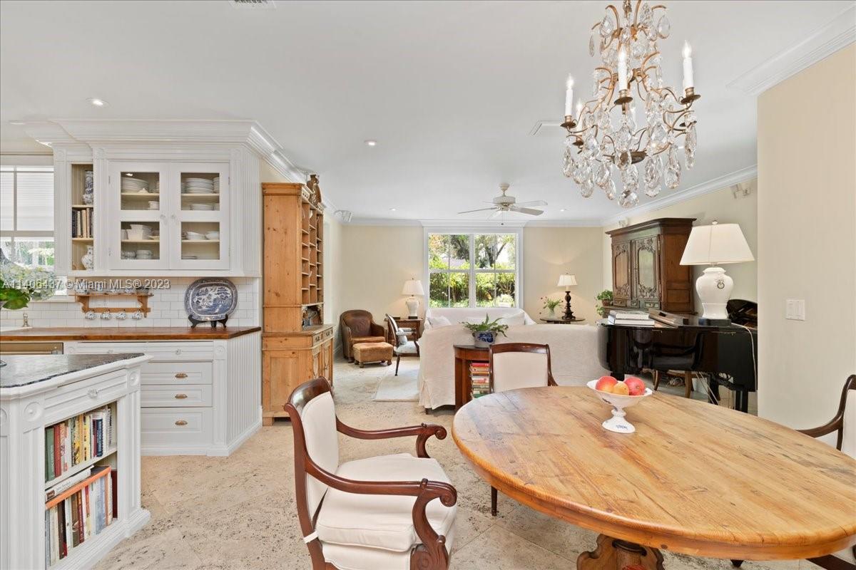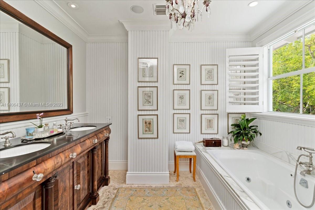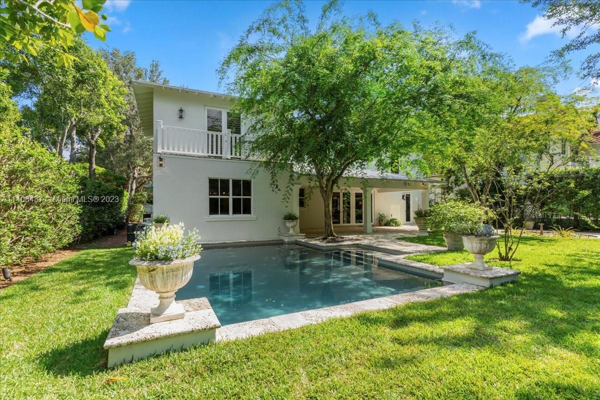 Introducing one-of-a-kind Anglo-Caribbean style, 2-story home in the highly desired High Pines. Nestled in tropical foliage of nearly 10,000 sqft lot, this home offers a timeless style that is both fresh & classic with refined architectural details which are a must see. Ground floor features sizable office, guest room with en-suite bath, living room with fireplace, charming dining room & family room with access to outdoor loggia overlooking pool and garden, offering an idyllic scene for alfresco entertainment. Gourmet kitchen is equipped with top-of-the-line appliances showcasing center island with lapis lazuli marble top. Upstairs Primary suite features private balcony overlooking pool and spa-like en-suite bathroom. Additional bedrooms are oversized with balconies overlooking the garden.