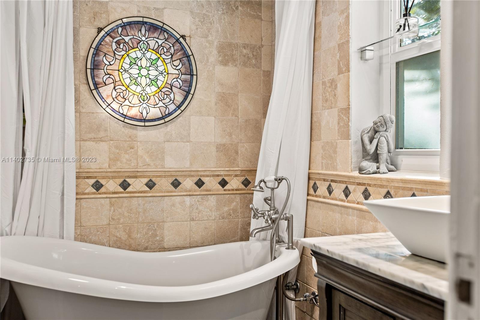 Elegant 2 bedroom / 2 bath home with a lot of character. Tastefully designed interior with a beautiful kitchen featuring a professional gas stove, ss appliances, and custom cabinetry. Wood flooring, exposed wood beams and fireplace. One bath has a unique claw bottom tub and the other is an oversized primary bath. New impact windows/doors. Your private tropical oasis awaits. Enjoy your private fenced resort-inspired backyard w deck & jacuzzi/spa and two under cover outdoor living spaces great for entertaining. Chicago brick surrounding the home plus a coral retaining wall. Incredible location, 1 1/2 blocks from Southlake, approximately 1 mile from the beach and Downtown Hollywood. Some furnishings available for sale. Chandelier in foyer does not convey/will be replaced.