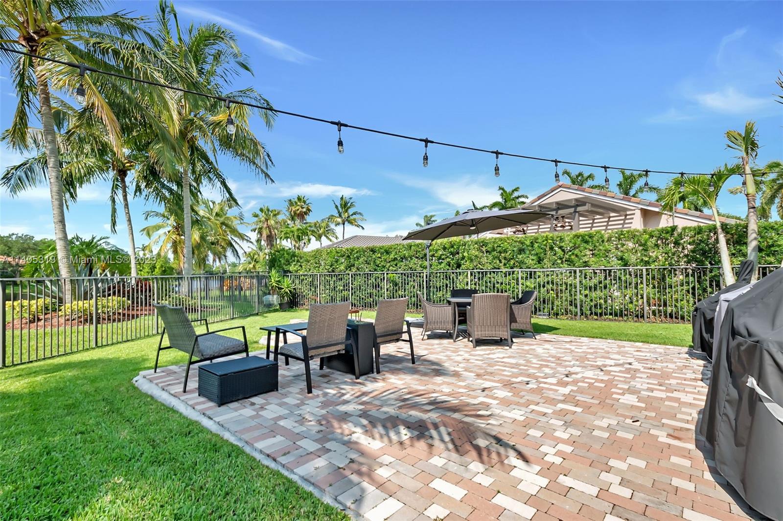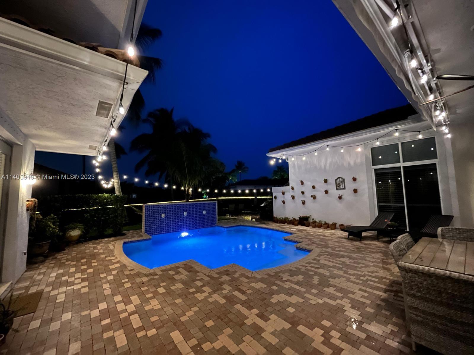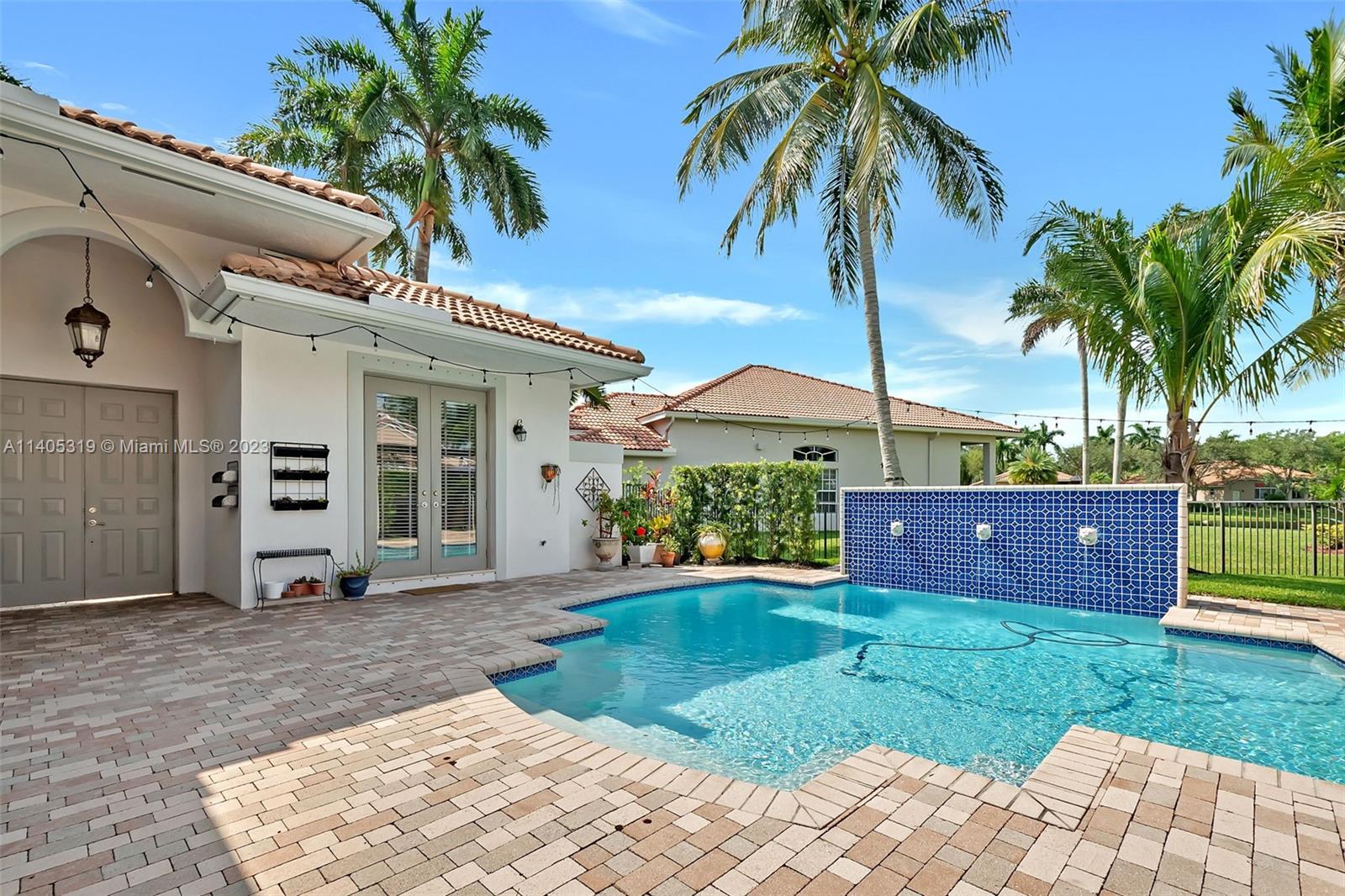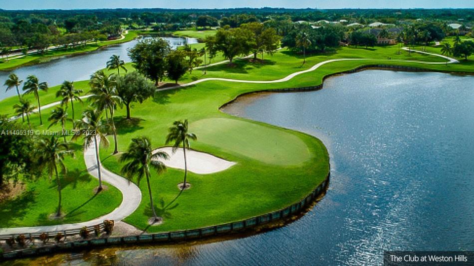 Discover luxury living in this beautiful "courtyard model" home nestled in a cul-de-sac in the prestigious Weston Hills golf community. The home has a main house with 3 beds/3 baths and an additional 4th room and bathroom located in the guest house. The pool was resurfaced in 2020 and has a serene waterfall. Elegant wood-looking floor tiles adorn the entire home. The designer kitchen boasts white quartz countertops, white wood cabinets, a smart double oven, a 60" refrigerator, an electric stove top with an outside venting range hood, a bar with a wine cooler, and an oversized island—great for entertaining. The master bedroom features a pool-view sitting area. Plantation shutters and remodeled bathrooms add to the allure. Near a community park just a short walk away. Weston A+ Schools.