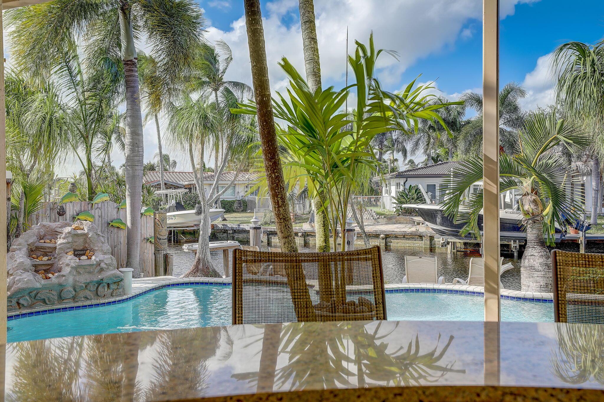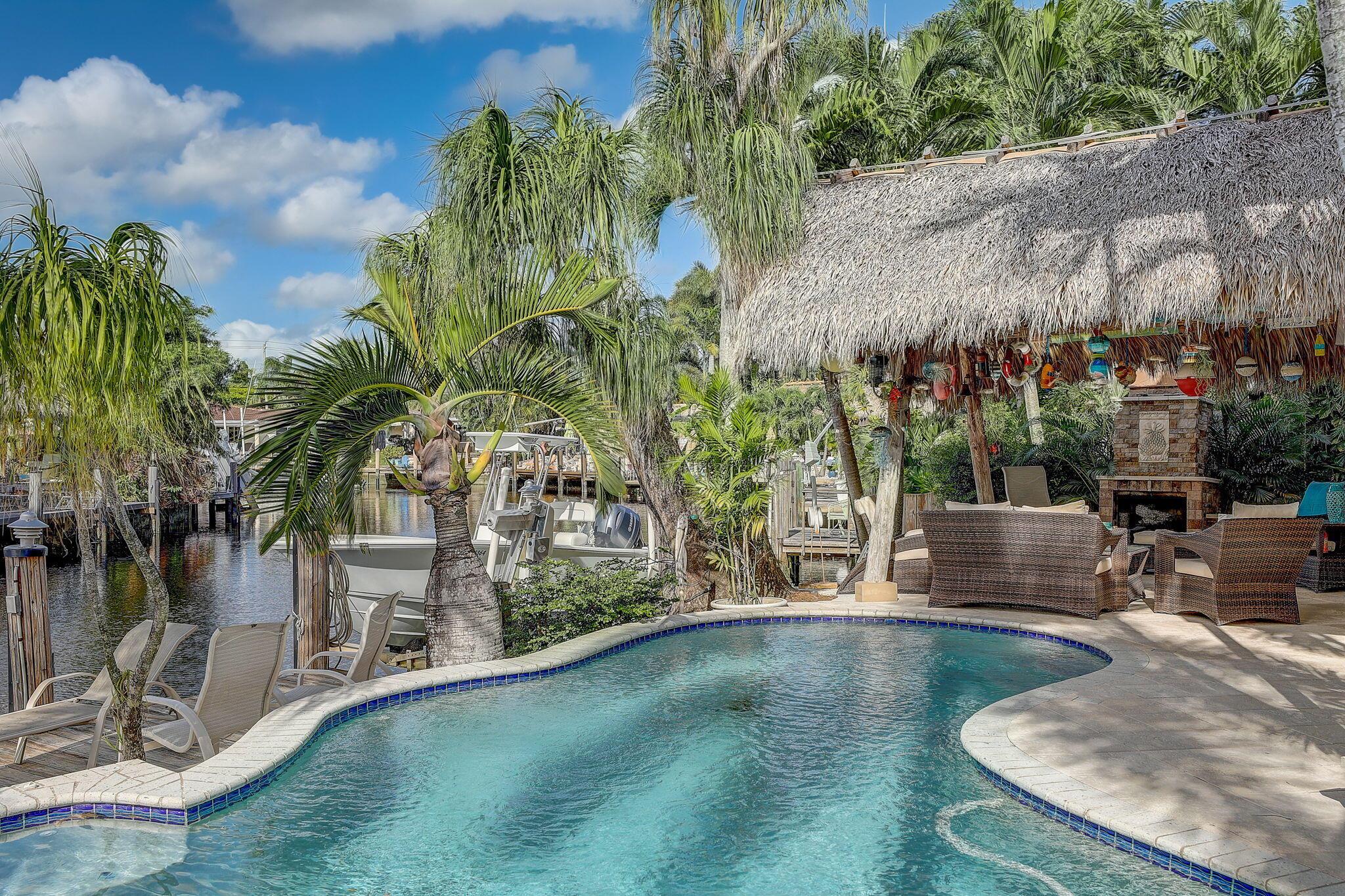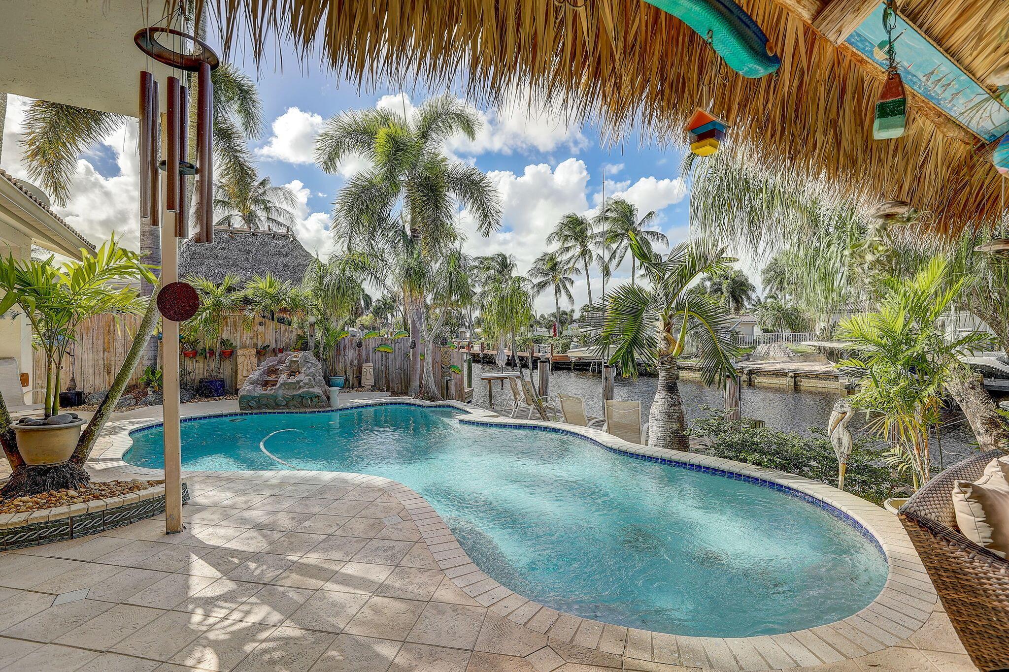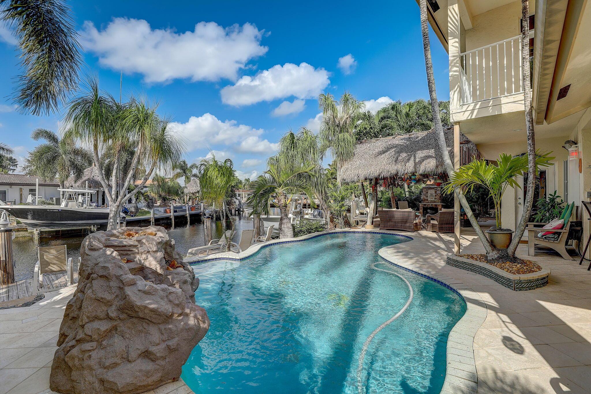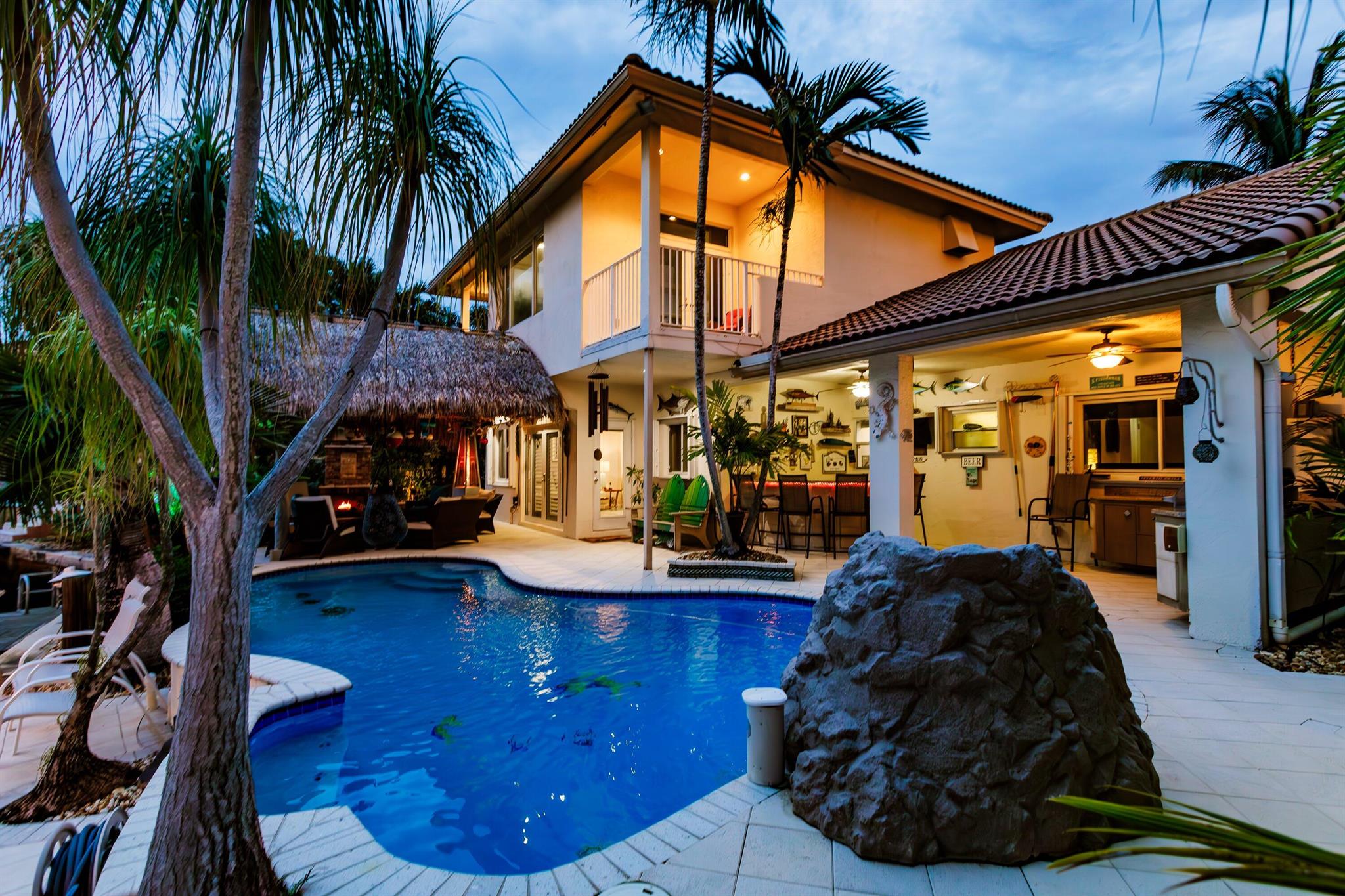 WATERFRONT CUSTOM BUILT HOME / ROOF 2006 / TWO AC: Main Floor = 3yrs / Master = 7yrs. OUTSIDE is private OASIS, TIKI SITTING AREA, full bar, outdoor kitchen, fishing station, HEATED POOL w/ natural gas, and a real fireplace! Acclaimed CYPRESS HARBOR. SPACIOUS OPEN CONCEPT: Living Room, Dining Room, Family Room & gas fireplace, 10' CEILINGS. Amazing detail w/walls of large windows and sliders to make it light and bright; recessed lighting, gorgeous 2-tier granite kitchen peninsula, tons of cabinets, kitchen pantry. PRIVATE MASTER SUITE: 30'x20' w/10' ceilings, 2 private balconies, 2 walk-in closets, double sinks and showers, oversized Jacuzzi tub; separate AC Zone; 4 Camera SECURITY SYSTEM. The plans for Pompano Beach improvements are already approved by the City and HOME VALUES WILL...