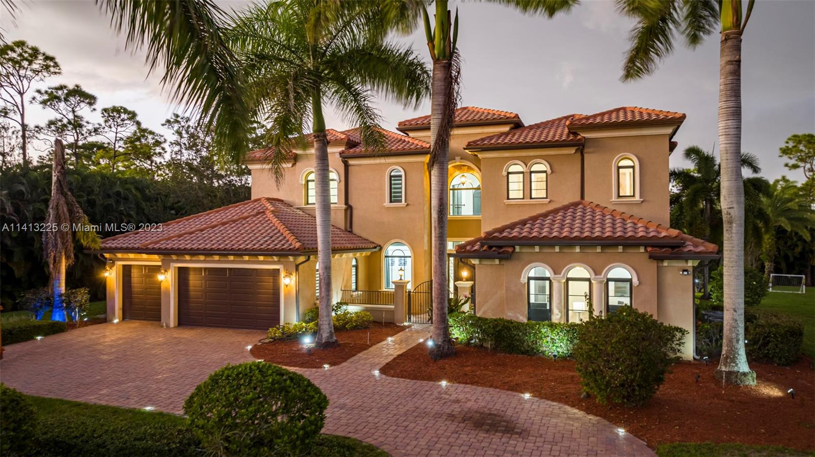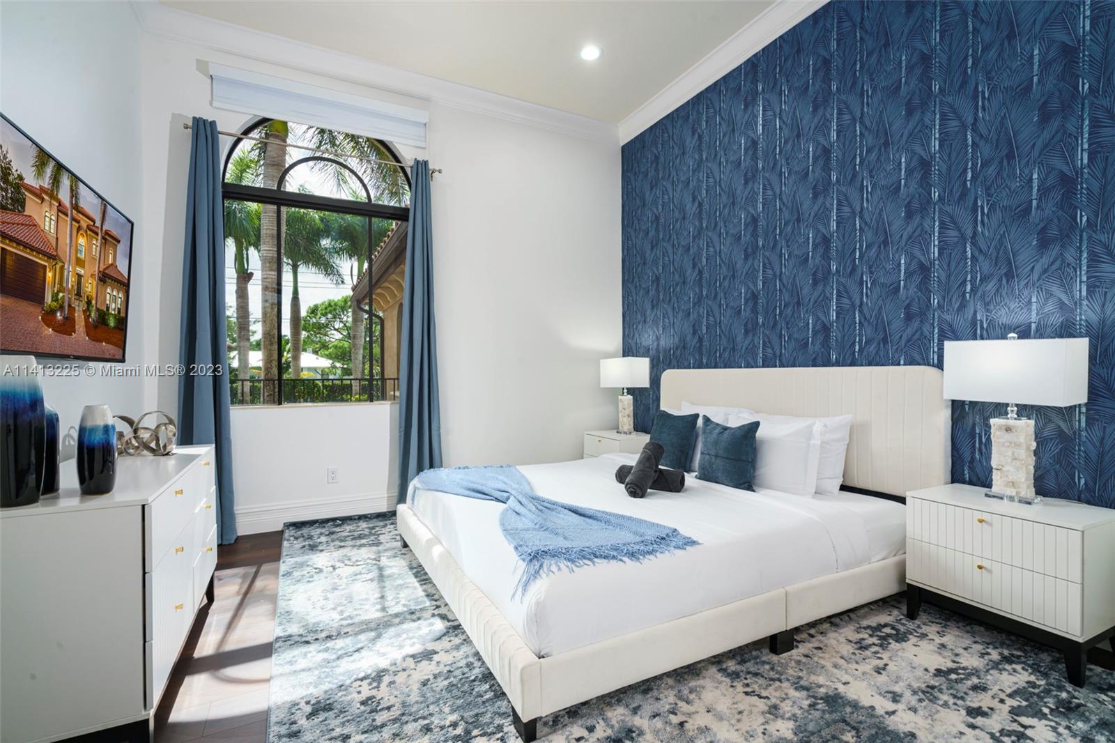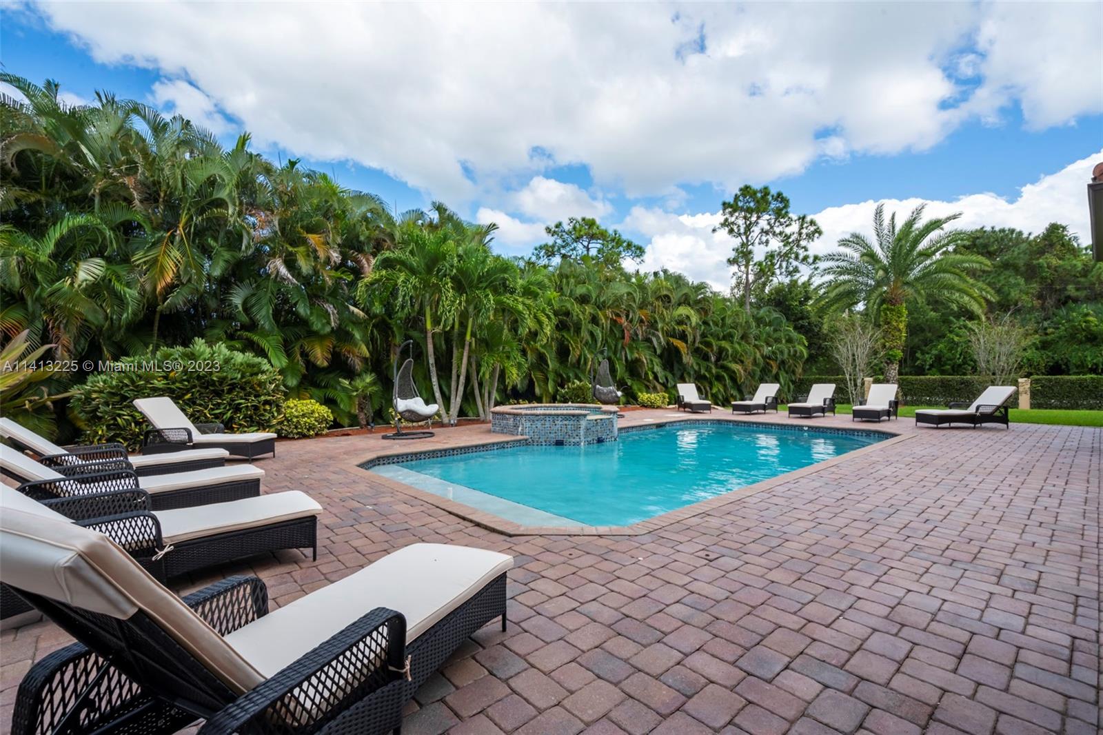Spacious 6,000 sq ft modern home on 1.16 acres. 8 bedrooms, 5 bathrooms, cinema, game room, private outdoor paradise. Custom Mediterranean design with luxurious features. Twin bridal staircases, courtyard, pool with spa. Equipped chef's kitchen, wood cabinets, granite counter, breakfast bar. In-law/nanny suite, cabana bath, office, wet bar. High ceilings, laundry. Upstairs with separate wings, ensuite bedrooms. King-sized primary suite with sitting/office area, balcony. Custom walk-in closet, palatial bath. Impact windows, sliders. 5,848 sq ft home with 3 zones, 4 HVAC units.