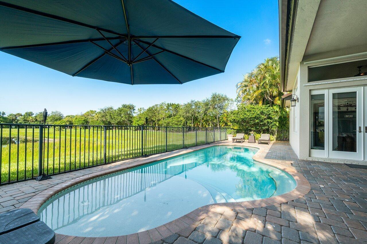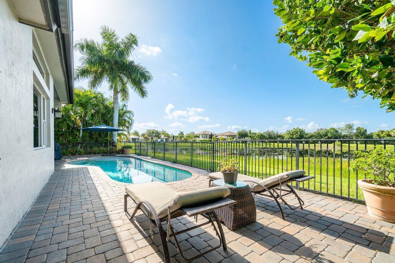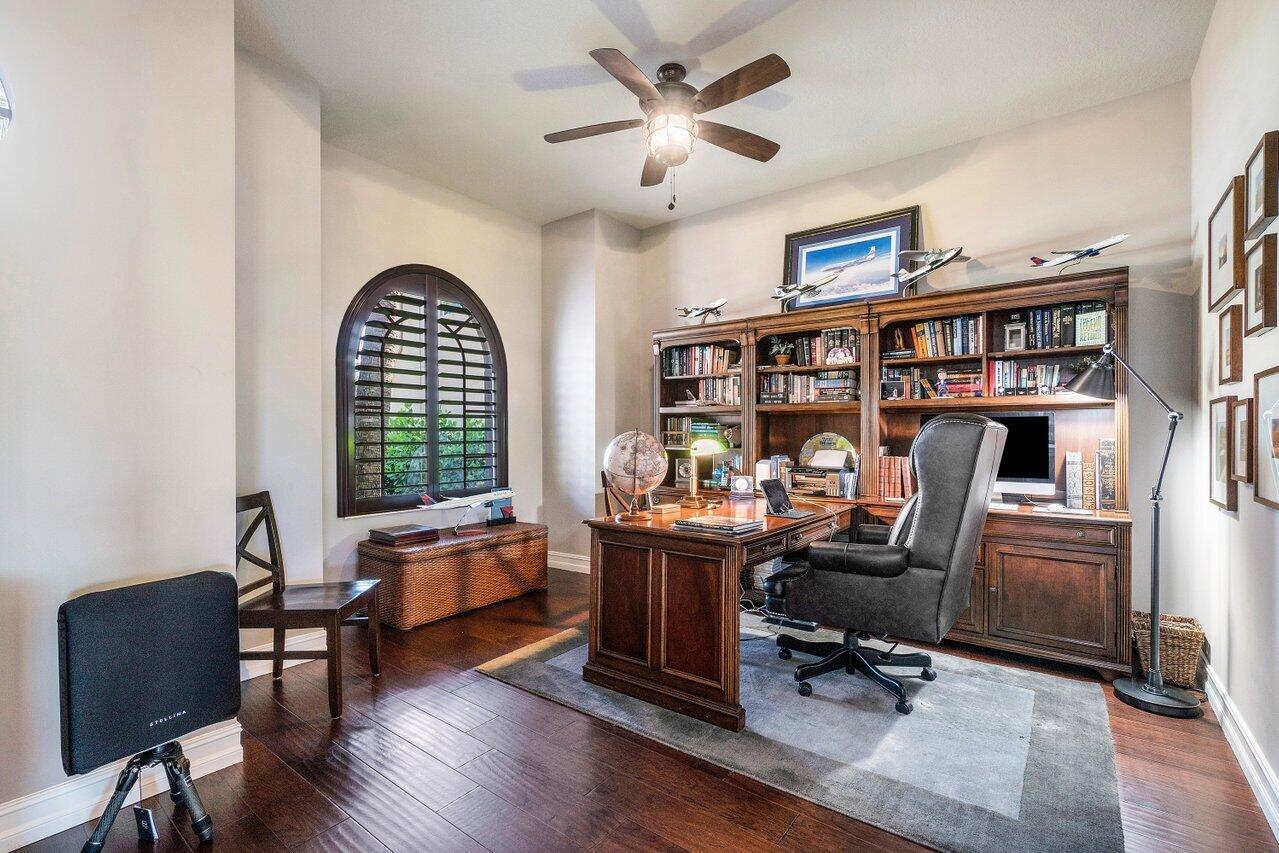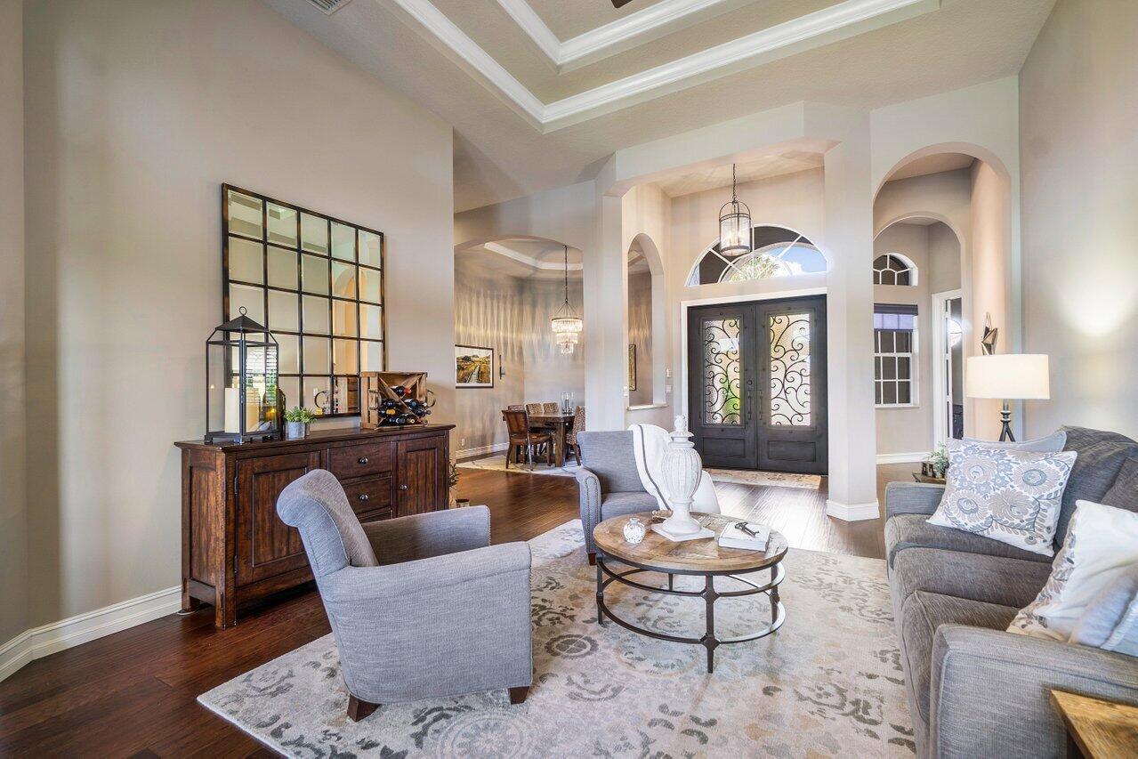 This IMMACULATE and welcoming home has remarkable custom features! Gorgeous wood flooring, decorative tray ceilings, crown molding, custom lighting, window treatments, volume ceilings, custom closets and an amazing cul-de-sac lot! Professionally landscaped for beauty and privacy. Fully fenced backyard, private pool with sun ledge, lake view, covered & open patio areas. 4-bedroom + office with a split floor plan, formal rooms & great room. Office overlooks lush landscaping. Elegant kitchen with 48'' cabinets, granite, backsplash, stainless steel appliances, double sink, double oven, cooktop & pull-out shelves. Open to a bright family room and spacious breakfast nook. This is the perfect gathering area. French doors (impact glass) lead out to the lanai and pool. See supplement for more!