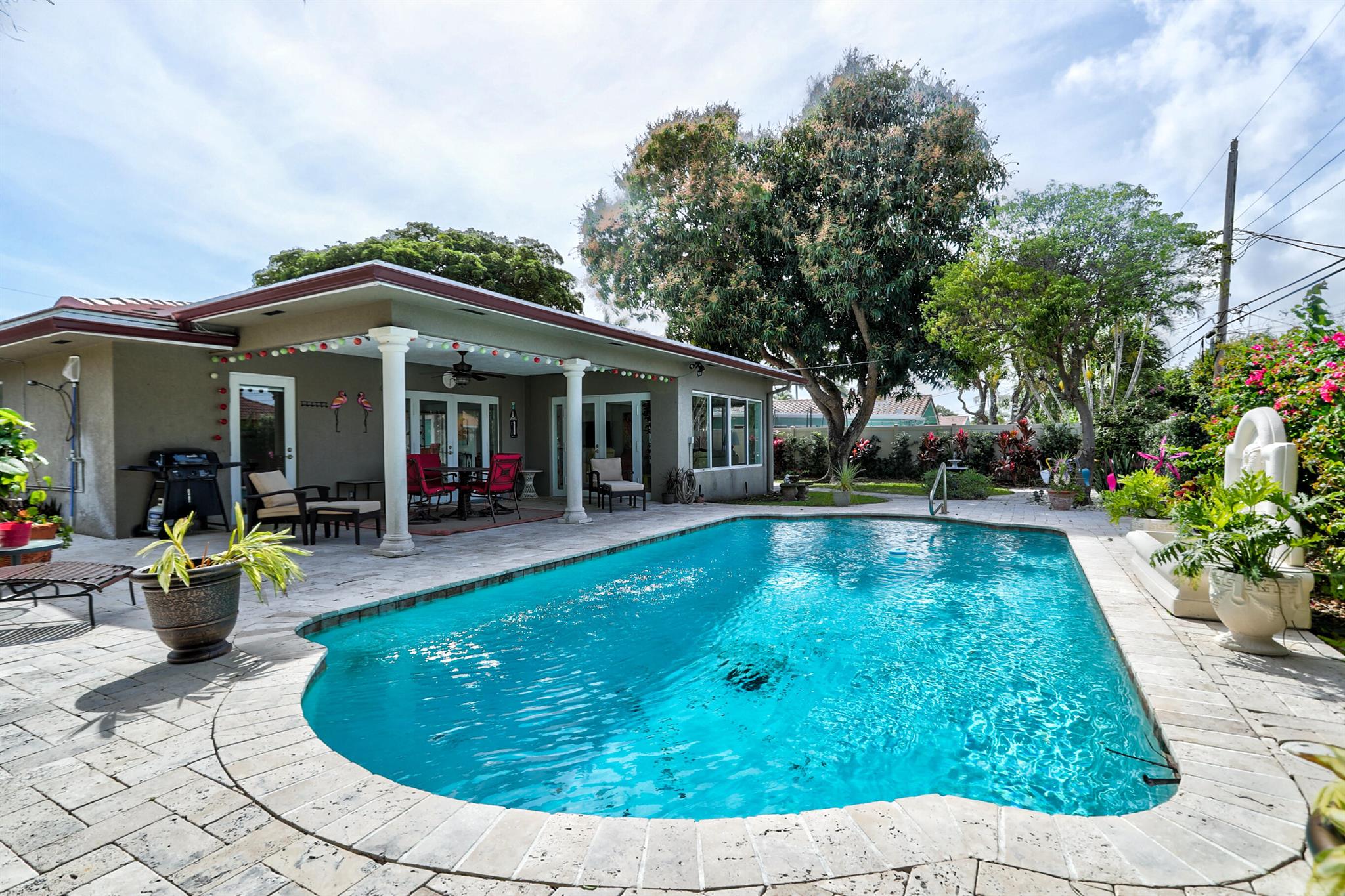 Tastefully renovated 2 bedroom, 2 bath + bonus room with private heated, salt water swimming pool. Everything you expect and need when you're heading to Sunny South Florida! This spacious and ideally located single family home is less than a stones throw from the intracoastal and local beaches and is situated on a large and welcoming lot with sweeping circular driveway and luscious greenery. Open family room, kitchen and dining area with an abundance of charm. Fully air-conditioned with attached 2 car garage, covered porches, modern kitchen and much more. Washer/dryer inside off of kitchen. Photos were taken prior to leasing to tenant in 2021. Impact glass and newer roof (2018).
