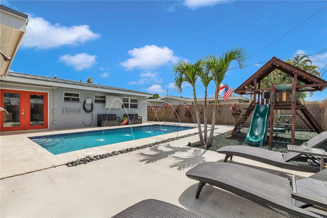 Your new home awaits you in Fort Lauderdale, Florida. Live in this turn key adorable home with a 2022 metal roof, beautiful new bathrooms, open kitchen, new luxury vinyl flooring and impact windows and doors. Enjoy summer nights by the heated saltwater pool, a custom playground area with rubber chip flooring, a lounge area, a separate outside bathroom and shower off the pool. The main home features 3 bedrooms and 2 full bathrooms. A big bonus is an attached 1/1 studio apartment with it's own entrance & little yard. Park your car under a covered car port and enjoy a circular driveway and a side driveway for all of your toys. All Tv's, floating entertainment center and patio furniture stay with the home. No HOA. Close to the beach, 595, Florida turnpike and more!