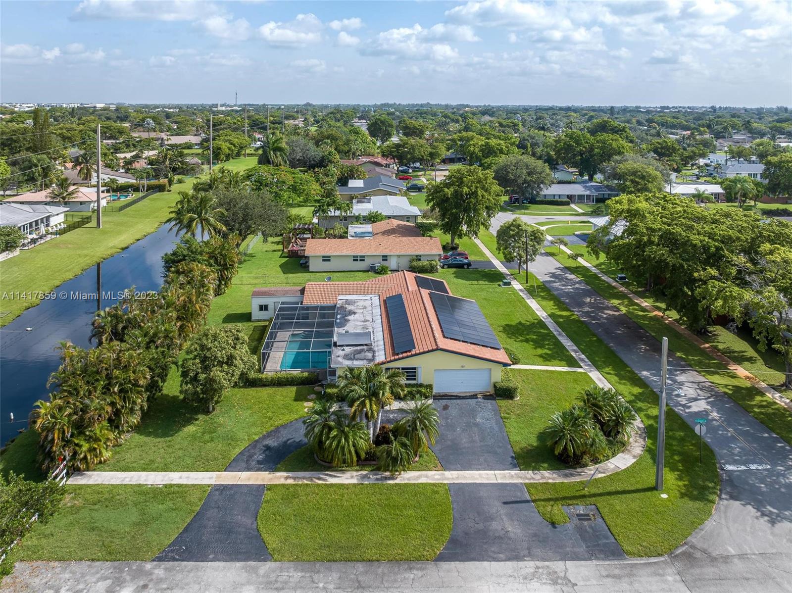 Welcome to your dream home in South Florida! This spacious single-family residence features 4 bedrooms, 2 bathrooms, 2,143 sqft of living space, and a 2 car garage. Enjoy the tranquil canal waterfront views from your own backyard, complete with a pool. Updated kitchen boasts granite countertops and stainless steel appliances, while the updated cabana-style bathrooms lead out to the patio/pool area. With a new roof, newer A/C, accordion shutters, a hurricane-rated garage door, and solar panels, this home is both secure and energy-efficient. The 17,809 sqft lot offers privacy and serenity in a quiet neighborhood and has space for boat or RV. Conveniently located near shopping, dining, and entertainment. Walking distance to Liberty Tree Park. Don't miss out on this incredible opportunity!