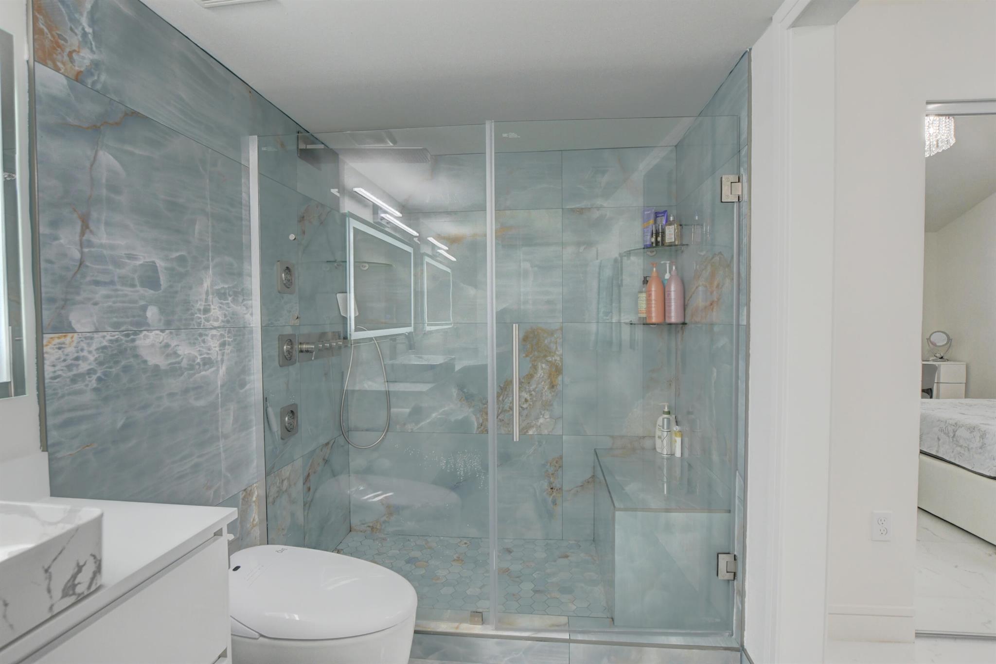 NEW LISTING - 2023 TOTAL REMODEL. NICEST 2 STORY TOWNHOME IN BOCA .OVER $100,000 IN UPGRADES. MODEL HOME. NEW ROOF.LOW INSURANCECustom 3 BED, 3.1 BATH GARAGE townhome with a private 800 sq ft private screened patio. White tile floors throughout , freshly painted, flat ceilings (no popcorn), 2017 AC, LED fireplace, Newer hot water heater. Custom kitchen with wood shaker cabinets, SS appliances,reverse osmosis water system. Custom tile bathrooms with glass doors, LED lights, LED antifog mirrors, LED showerhead r systems, and custom toilets including an Ove smart toilet in the master suite. Ring doorbell and camera . New custom glass hurricane front door and 2 skylights . Every room has huge sliders or windows .Very light and bright home. Huge patio with 200 sq ft artificial tur