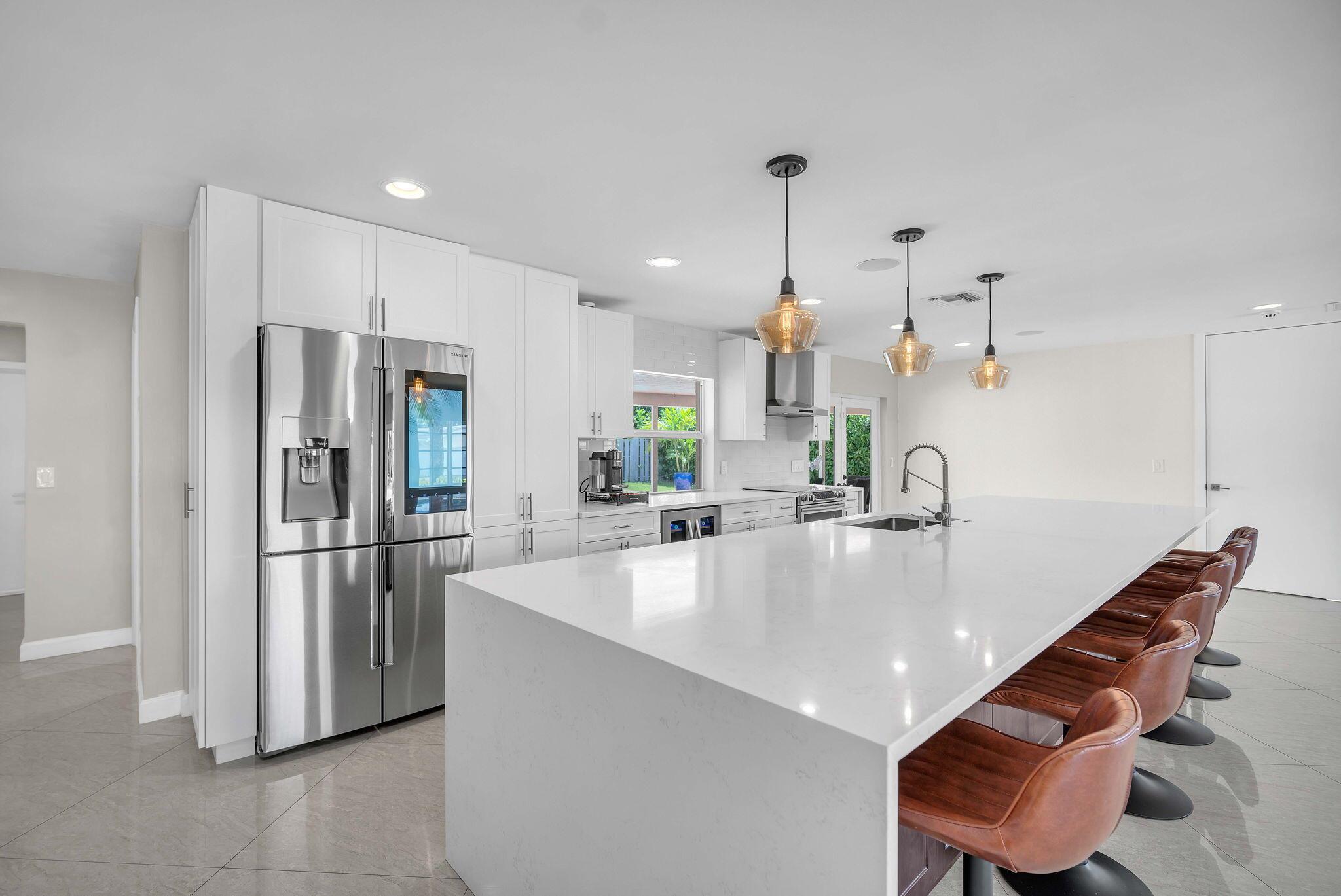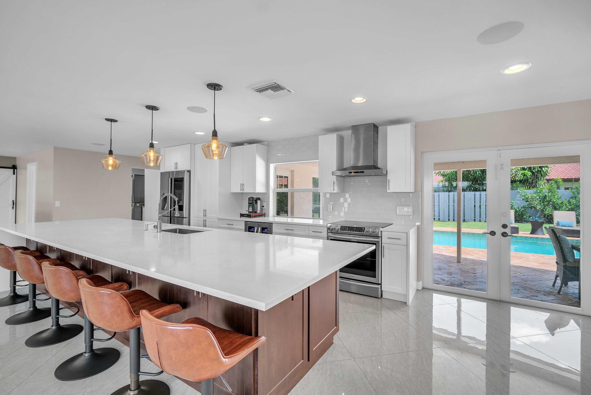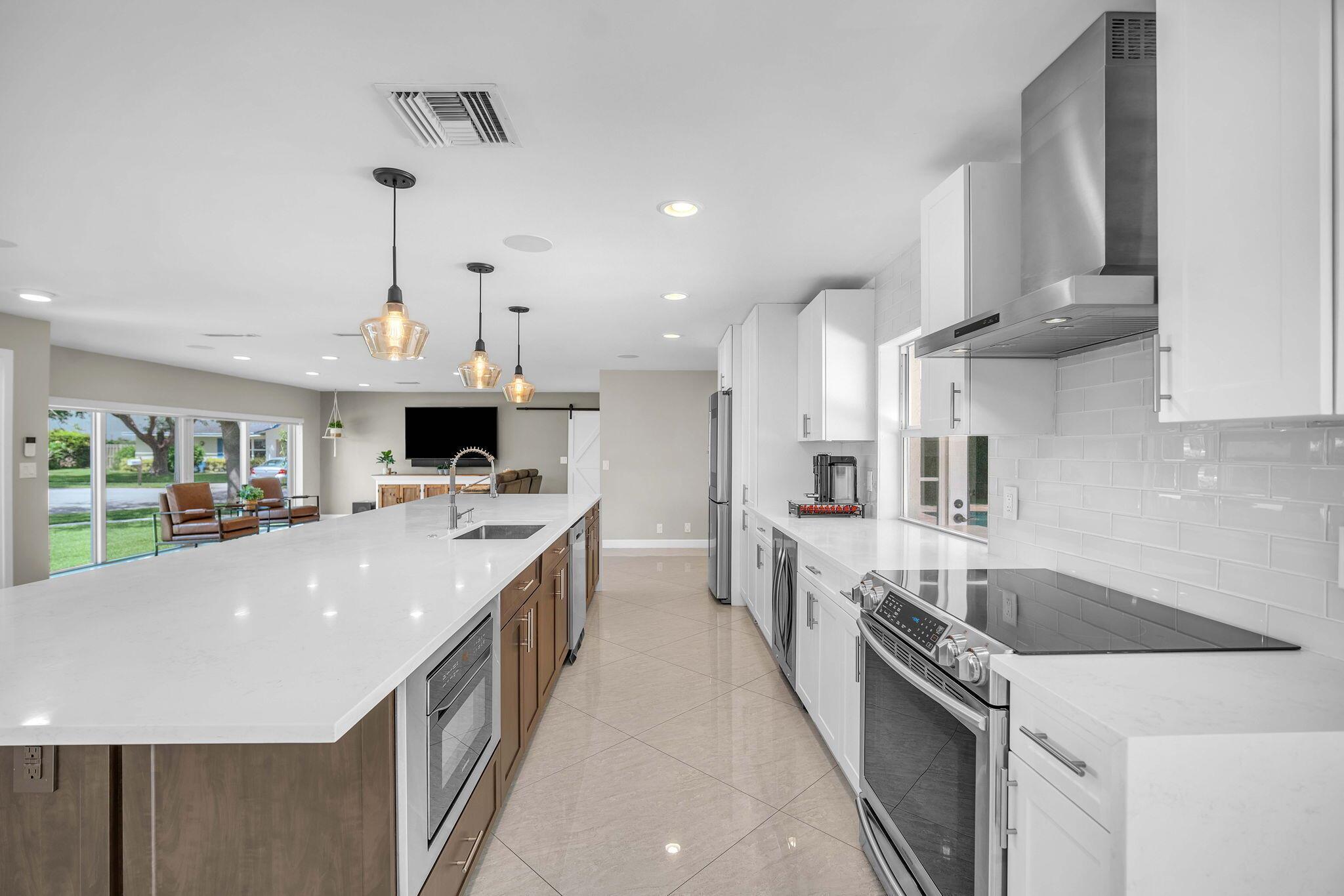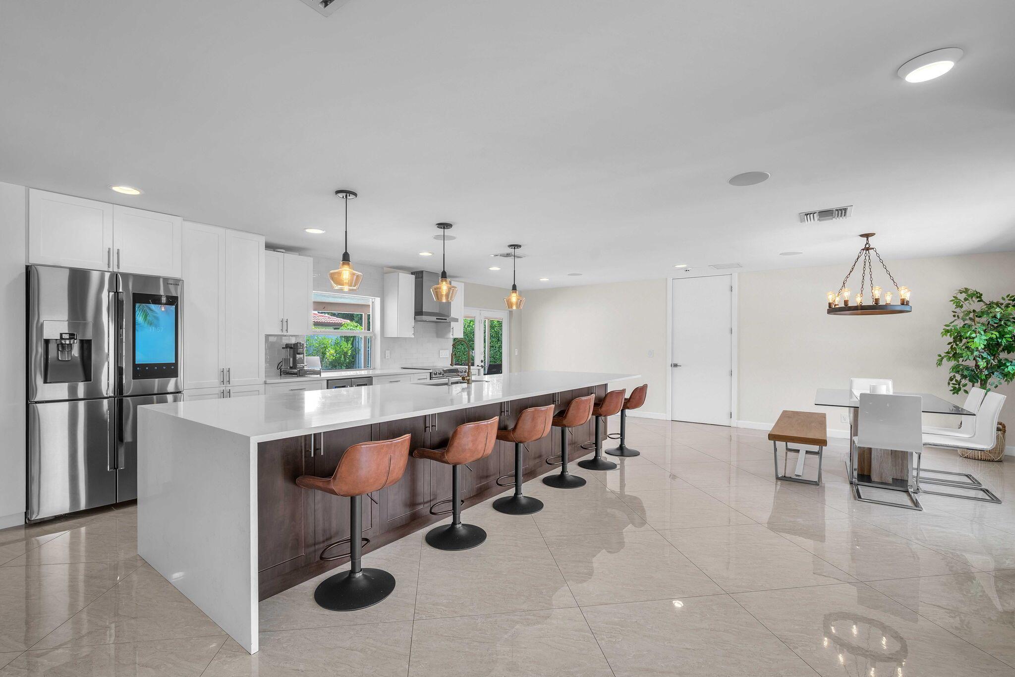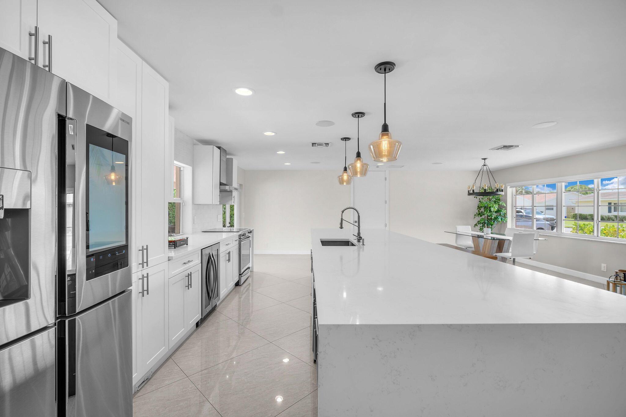 Welcome to your luxurious oasis in the highly desirable community of Boca Raton! This stunning 3 bedroom, 3 bath home has been completely remodeled to create a modern and inviting space. With its open design and abundant natural light, this house is perfect for entertaining. Inside, you'll be greeted by oversized, beautiful porcelain tile and elegant Calacatta Miraggio white quartz countertops on dark chocolate shaker cabinets at the impressive 15 ft kitchen island. The split bedroom plan ensures privacy, and each bedroom boasts a walk-in closet for added convenience.Prepare to be amazed by the special luxuries this home has to offer. Samsung appliances, including a cutting-edge Samsung Family Hub refrigerator, complete with built-in wifi, speakers, and an inside view camera.
