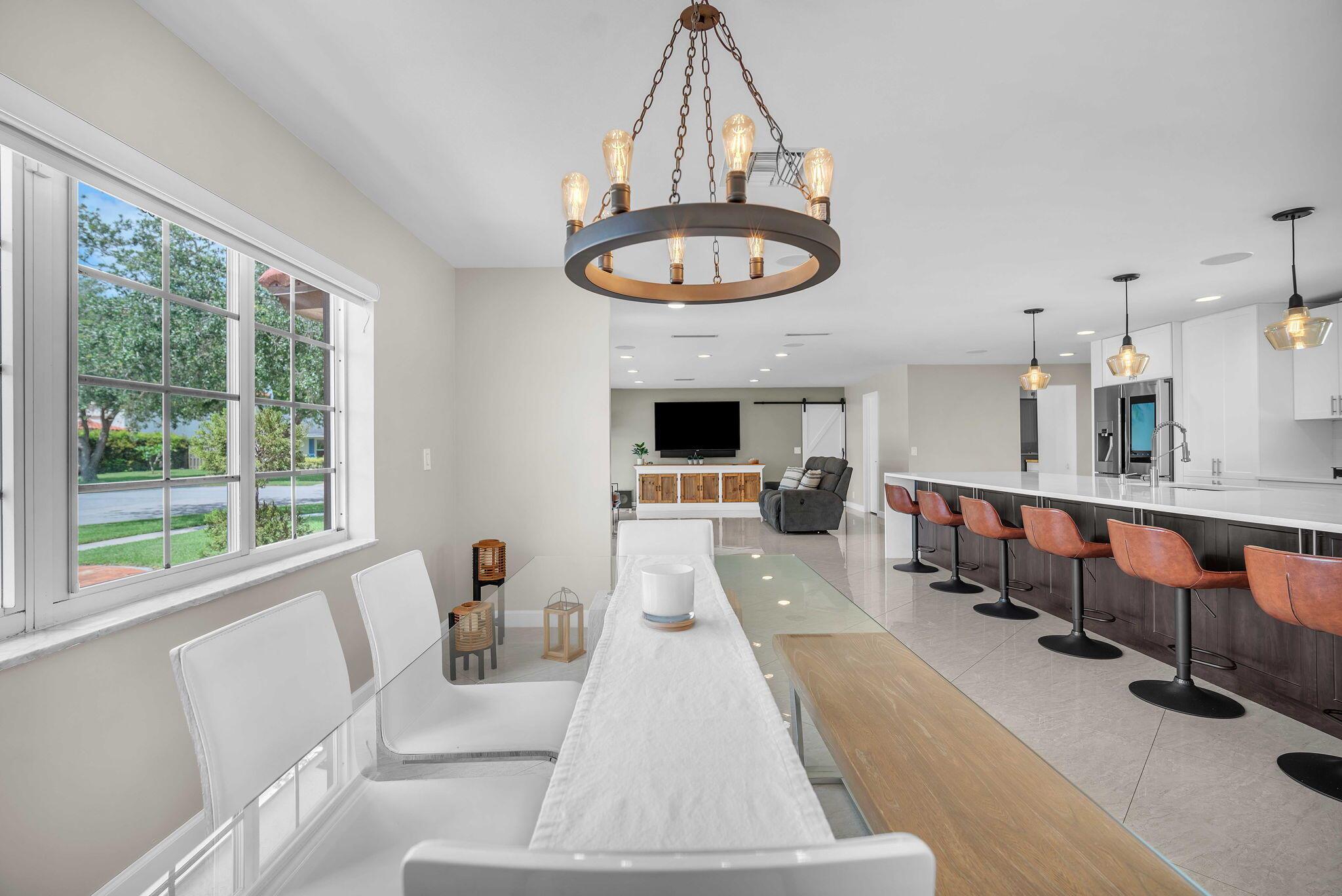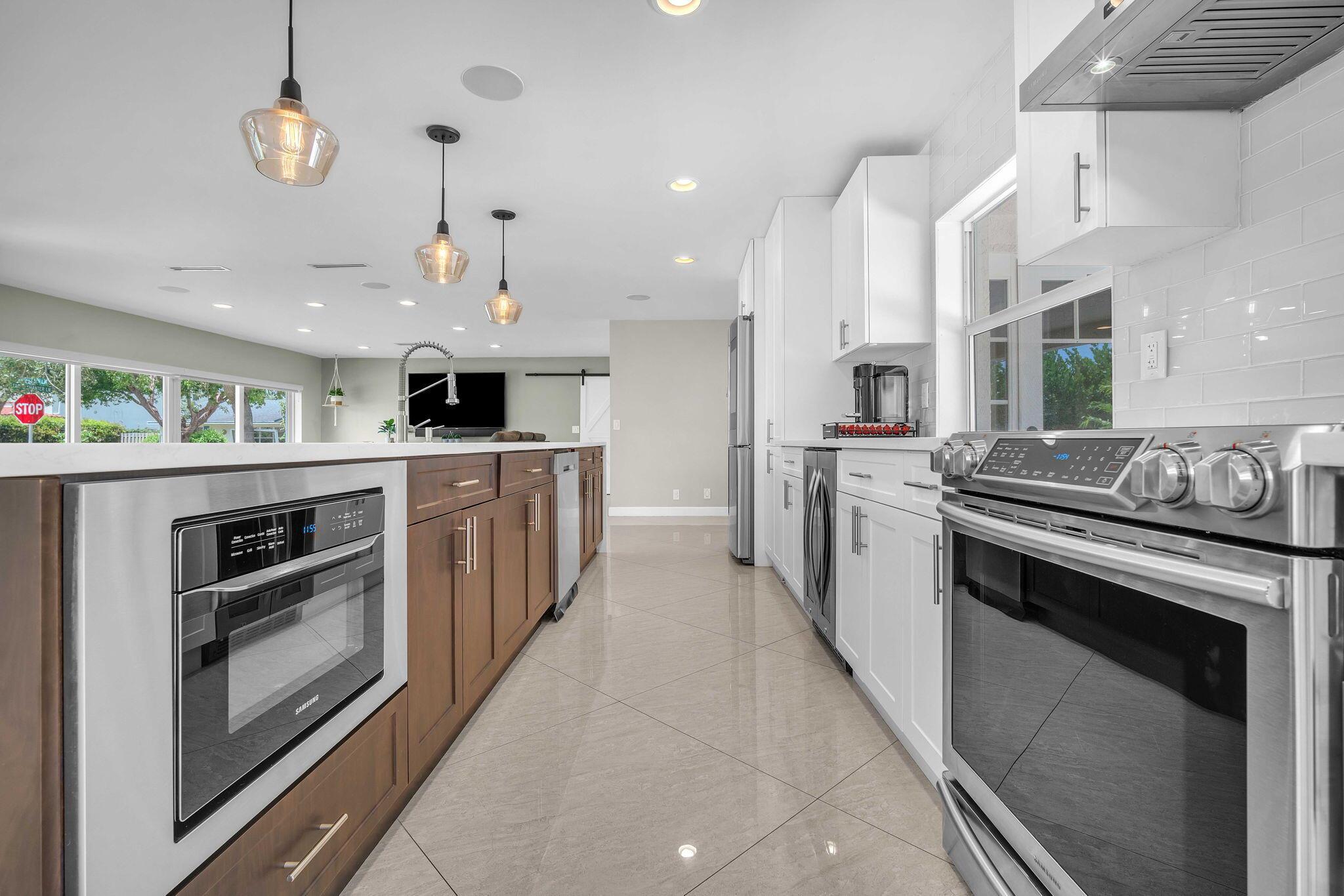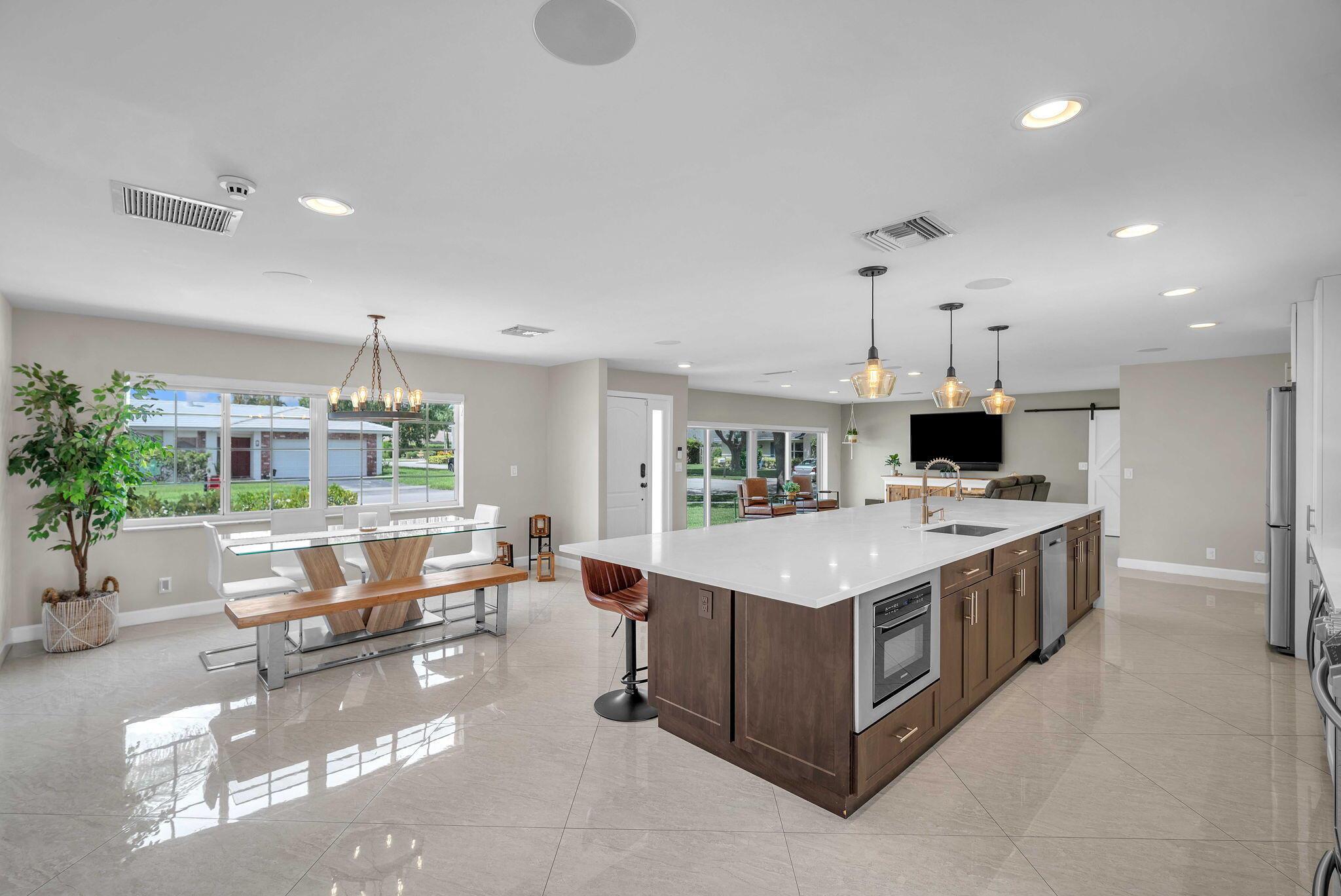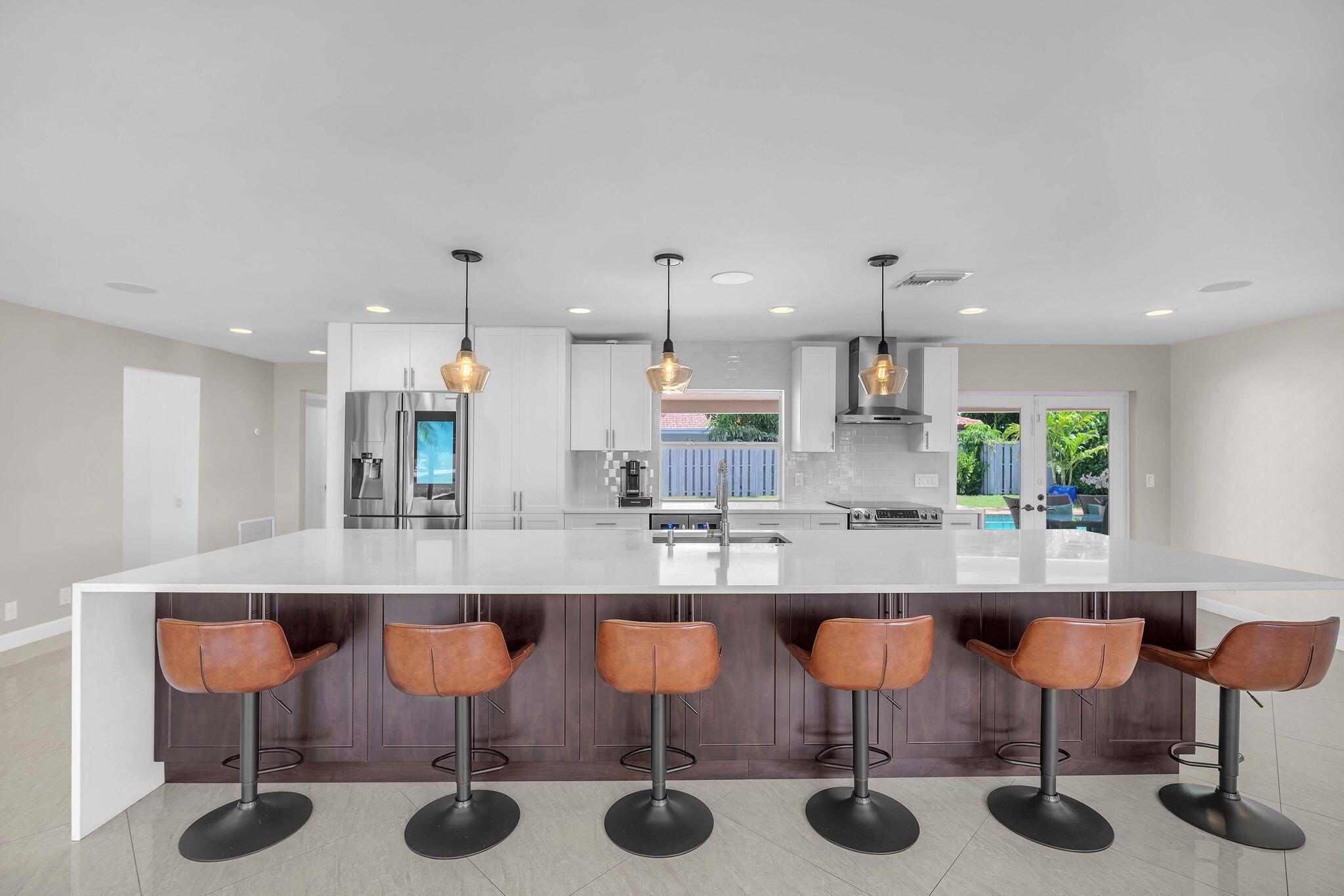 Welcome to your luxurious oasis in the highly desirable community of Boca Raton! This stunning 3 bedroom, 3 bath home has been completely remodeled to create a modern and inviting space. With its open design and abundant natural light, this house is perfect for entertaining. Inside, you'll be greeted by oversized, beautiful porcelain tile and elegant Calacatta Miraggio white quartz countertops on dark chocolate shaker cabinets at the impressive 15 ft kitchen island. The split bedroom plan ensures privacy, and each bedroom boasts a walk-in closet for added convenience.Prepare to be amazed by the special luxuries this home has to offer. Samsung appliances, including a cutting-edge Samsung Family Hub refrigerator, complete with built-in wifi, speakers, and an inside view camera.