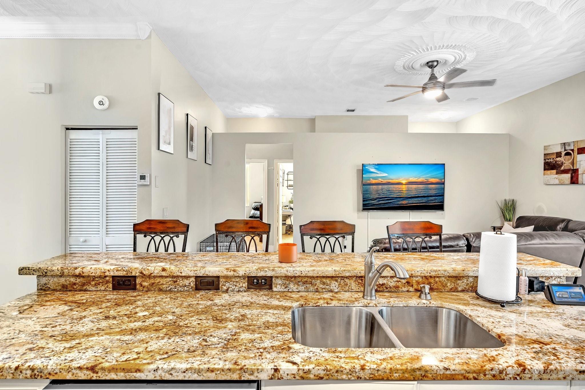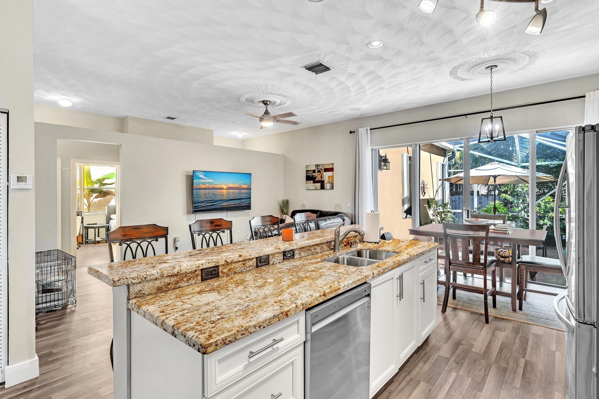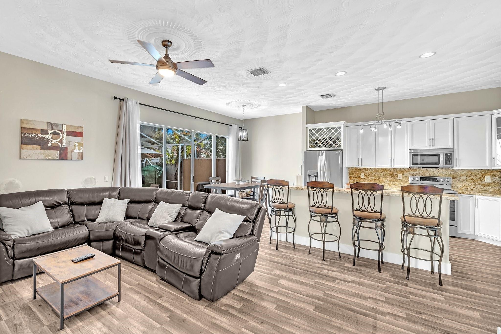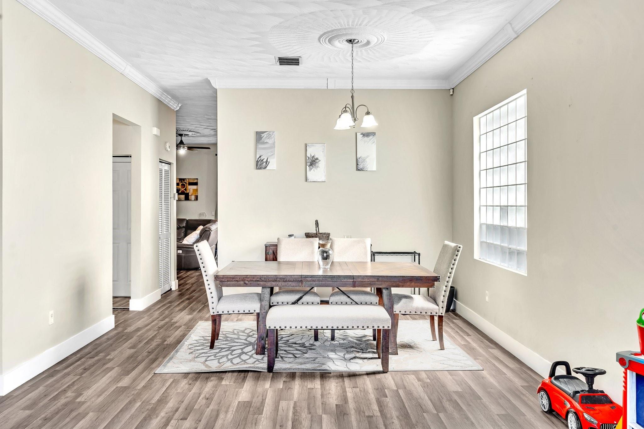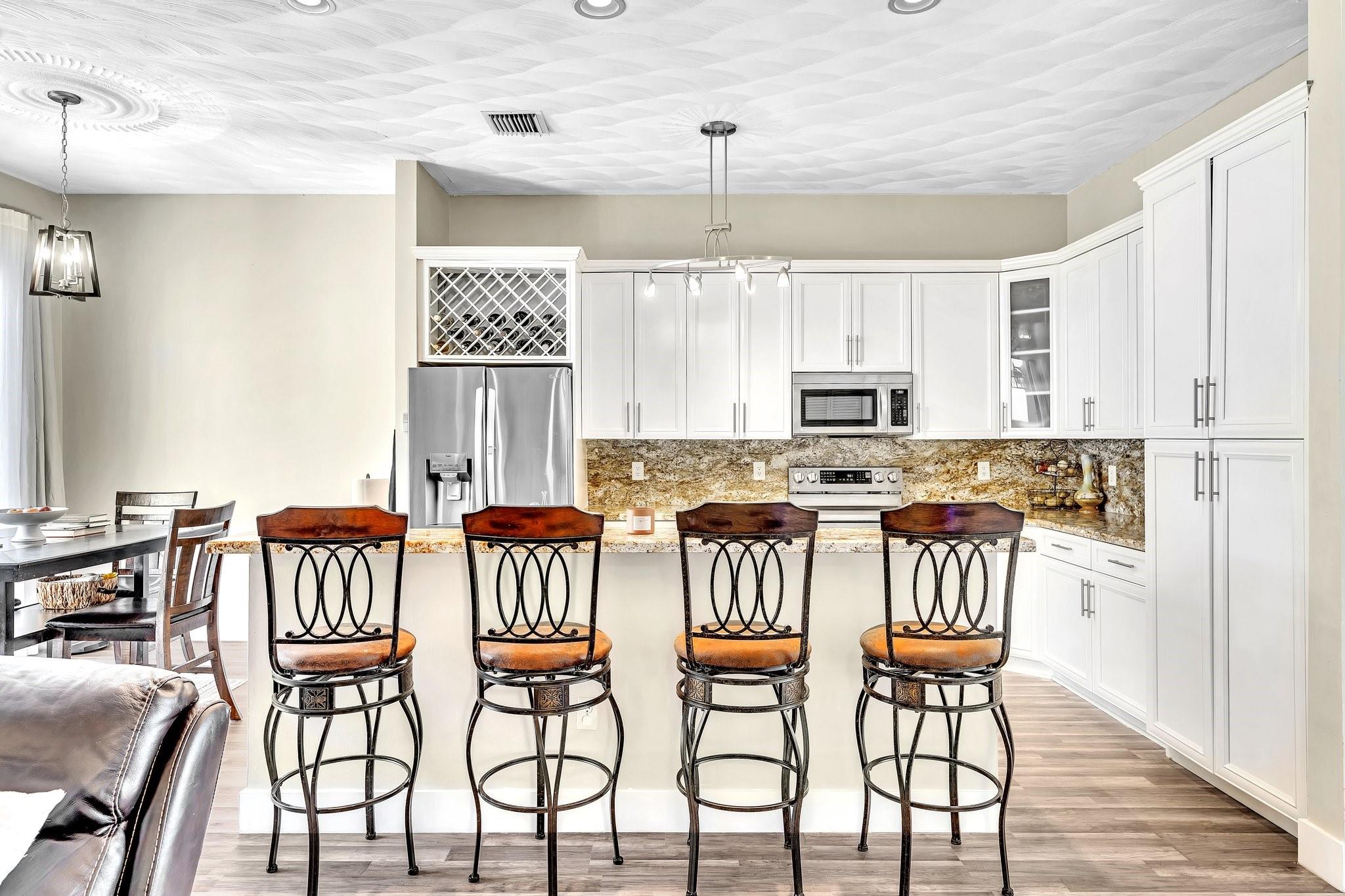 Welcome home! This exquisite 4-bedroom, 2-bathroom residence boasts an array of upgrades and a lush backyard filled with fruit and vegetable trees such as bananas, mangoes, strawberries, peppers, eggplants, spinach, and much more! Nestled in the sought-after Canary Bay community, this home offers a serene and family-friendly environment. With modern features, including a beautifully upgraded kitchen with granite countertops and all-new appliances, this home is truly a gem! The interior features 11-foot ceilings, new floors throughout the living and dining areas, two modern bathrooms with updated fixtures, a new water heater and electrical panel, a newer A/C unit for optimal comfort, and accordion storm shutters. Don't miss the opportunity to make this your home!