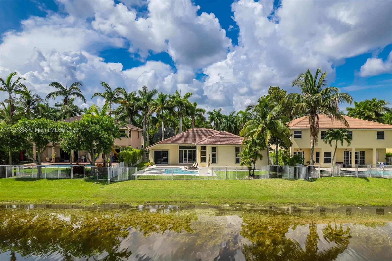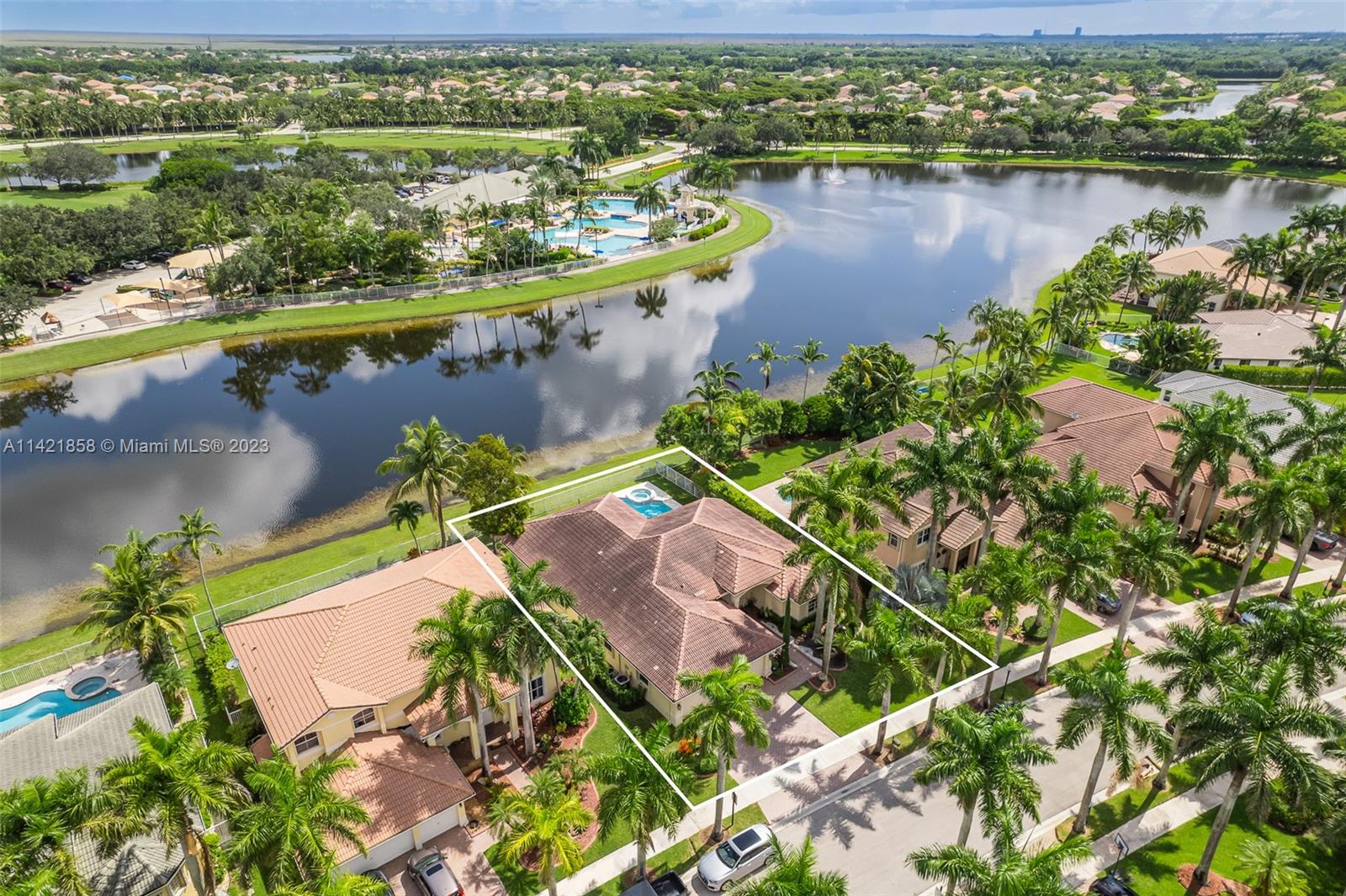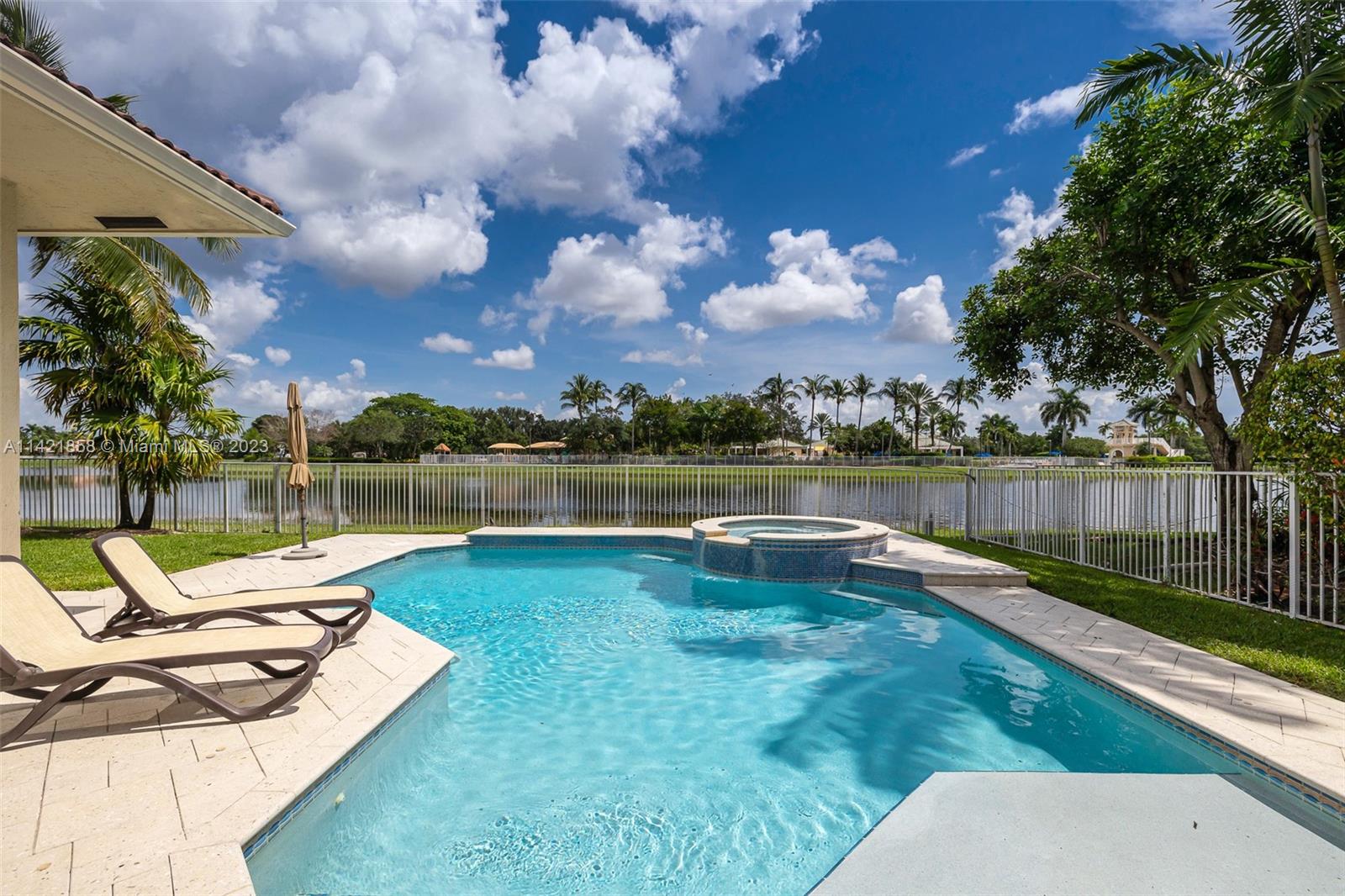 Spectacular premium location in Savanna, The Cove. Quiet royal palm tree street. Location, location, location. This water view home, has lots of natural lighting and an open, bright floor plan. Located in Gated Community of Savanna, 4 bedrooms, 3 bathrooms, 3 car garage, vaulted ceilings, laundry room, accordion shutters and an amazing lake view. Primary bedroom has 2 walk-in closets. Pool area is private. Stunning backyard with covered patio. Fabulous resort-style amenities for the entire family; clubhouse with heated lap pool, resort pool, kids pool, water slide, playground, soccer field, basketball court, hockey rink, BBQ area, miniature golf, and much more. 24 hour guarded gated community near to Weston Regional Park, Publix, restaurants and stores. Excellent A+ schools.