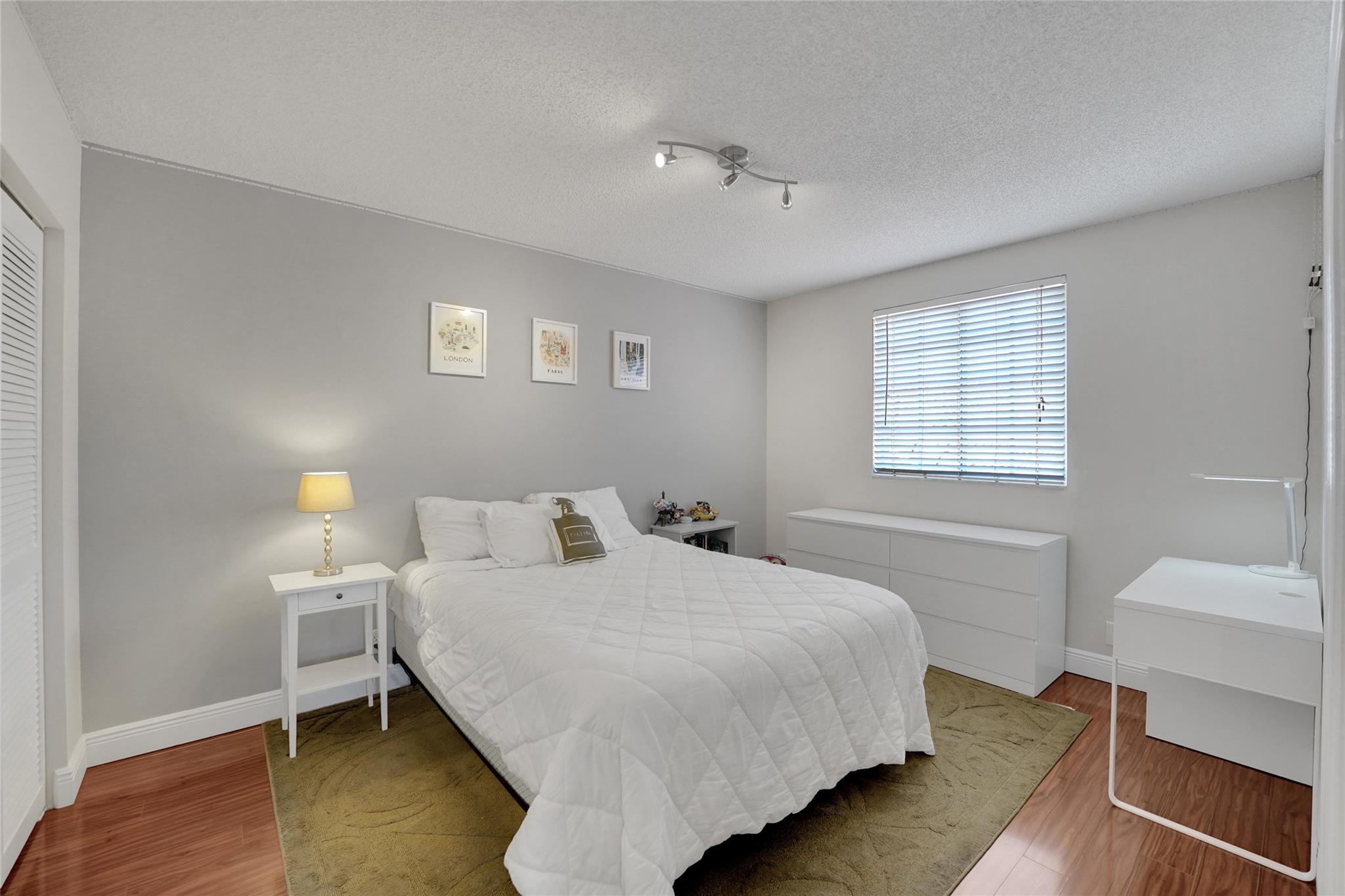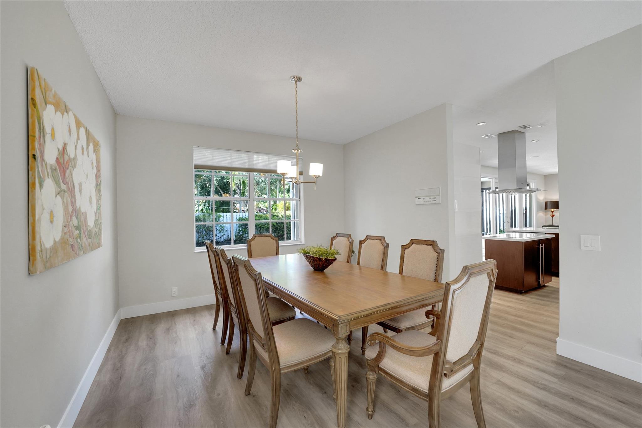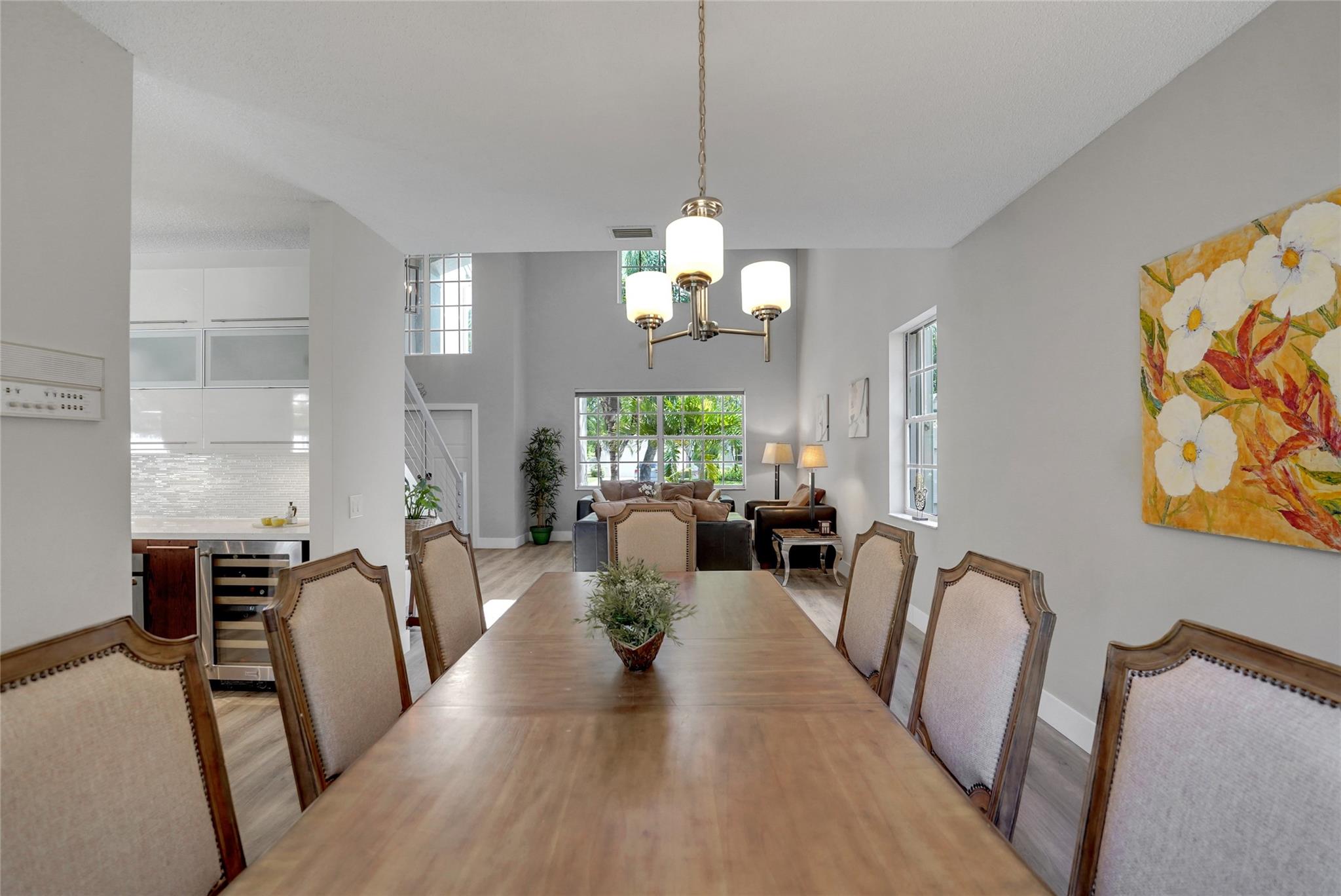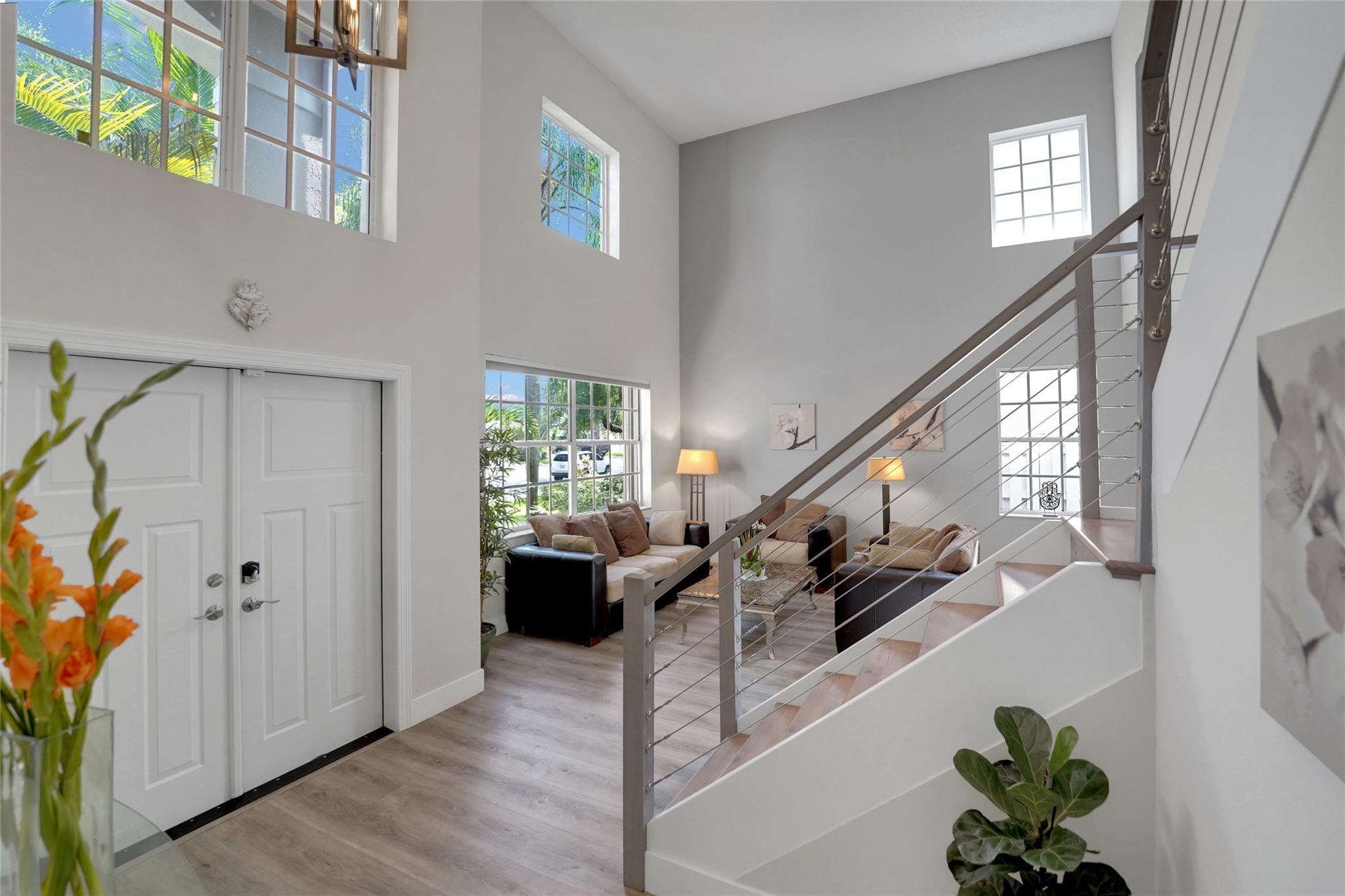 Welcome to a designed residence featuring a custom-designed kitchen with quartz countertops, a stove top island, a vented hood, and a refrigerated wine cellar. While a wood stairway with metal railings adds a touch of sophistication. Each bedroom has custom closets. Primary bedroom has a den, walk-in closets, and a beautifully remodeled bathroom. Recent updates include new vinyl wood flooring throughout the first floor, accordion shutters on accessible windows, and hurricane-proof glass on upper windows, ensuring both brightness and security. BRAND NEW ROOF installed in May 2023 provides peace of mind. This remarkable residence is located in a 24/7 guard-gated community with a pool and numerous amenities. Plus, it is surrounded by A+ rated schools. Don't miss out on this opportunity!