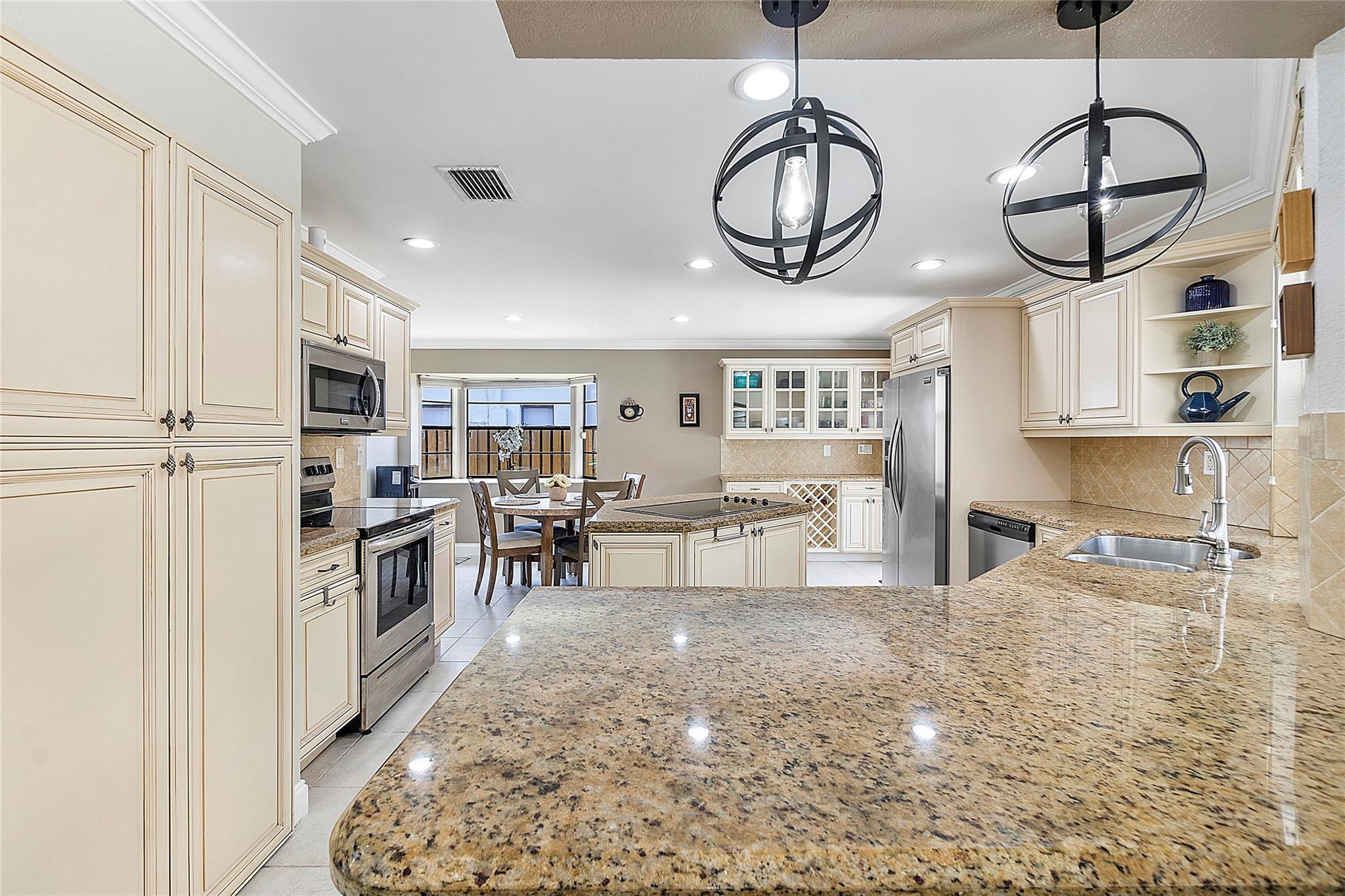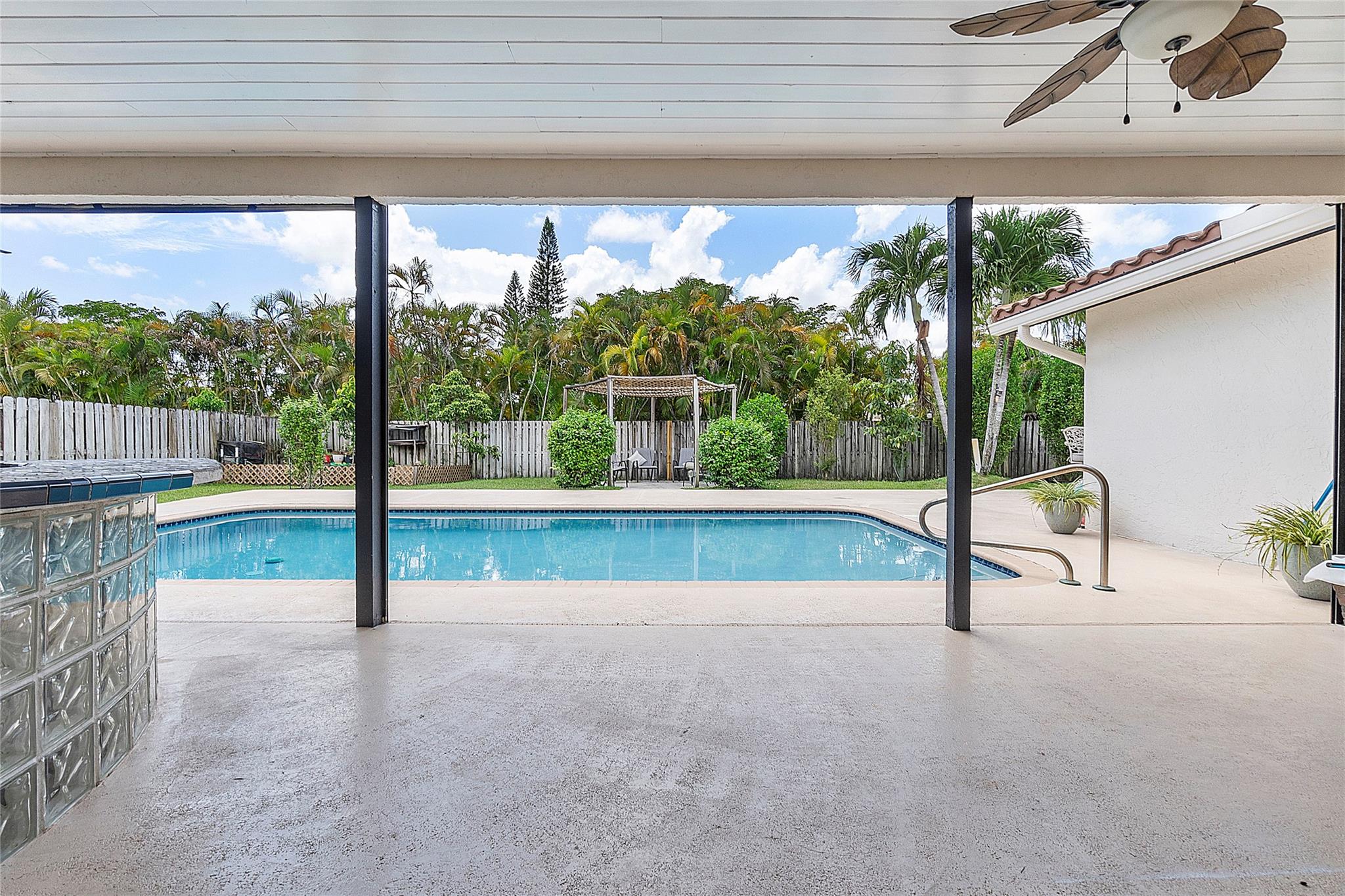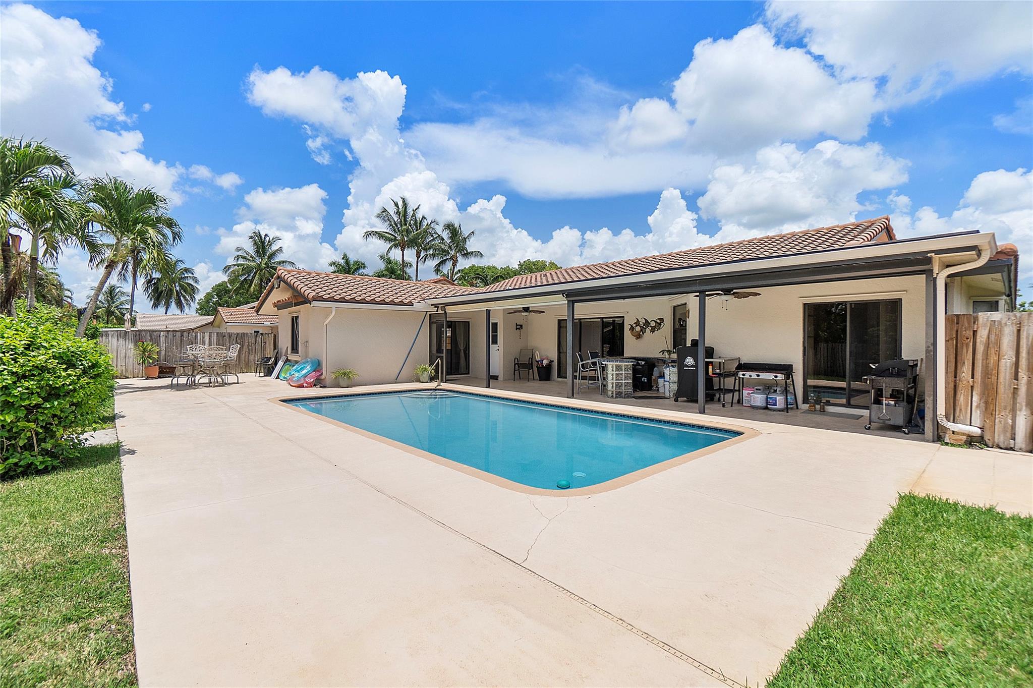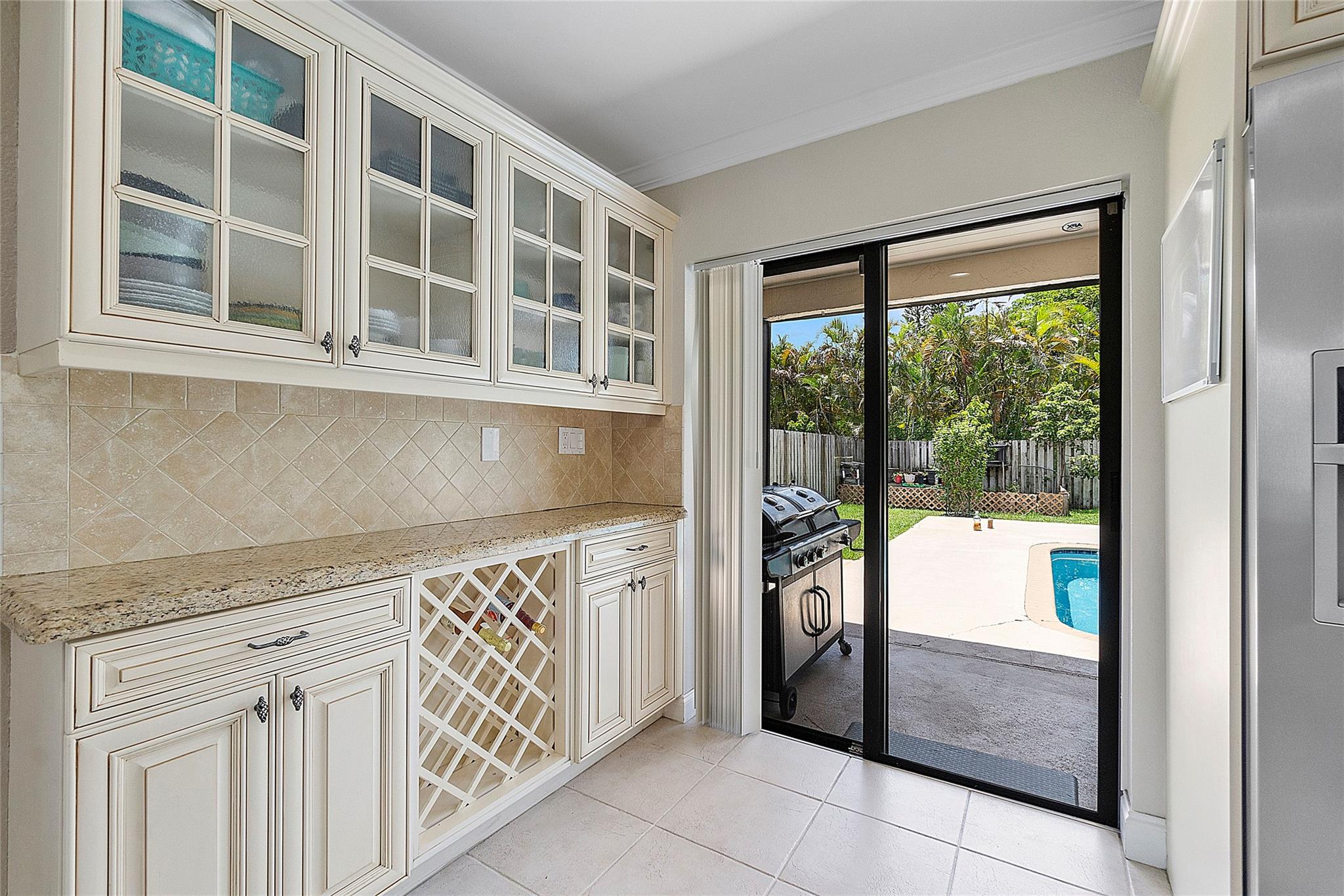 This remarkable 4 bedroom, 3 full bathroom oasis is in the Cypress Glen neighborhood of Coral Springs. No HOA! Enjoy outdoor lighting, resort style pool for entertaining any guests. Along with custom impact French doors, impact windows in the front and panel coverings for the back. Vaulted ceilings and recessing lighting for any mood desired. Custom cabinetry, center island with granite countertops, stainless steel appliances with oven and a built in wine cellar to inspire your inner chef. Crown molding all around, luxurious primary bedroom leading to the resort style bathroom. Secondary bathrooms are updated! Laundry room with a full size washer and dryer with deep sink, tankless water heater, impact garage door and cutting edge inverter AC. Come make this exceptional home yours!