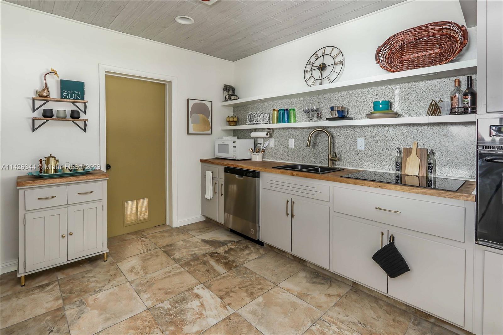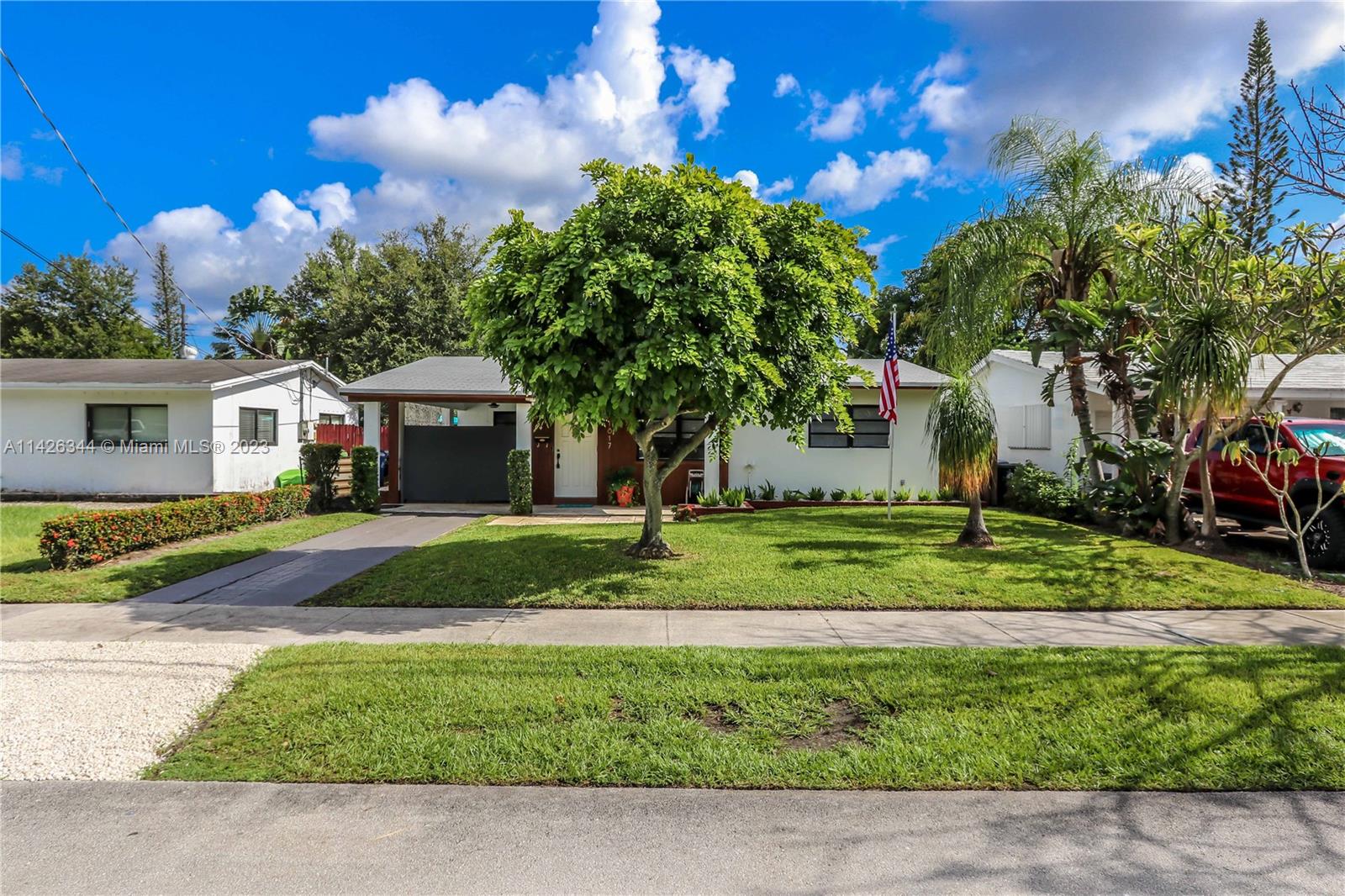 Mid-century ranch w/original cedar trim & breeze-block accents. Updated in 2023. 2/1 w/bonus room perfect for Airbnb, remote working or professional couple! Open floor plan w/plank ceilings, fireplace & LVT floors. New kitchen w/butcher block counters, new stainless/black appliances, trendy open shelving, gold-tone hardware (kitchen & bathroom). Separate pantry/laundry room. New roof w/10-yr trans warranty, electric, plumbing, fencing, fire alarms all permitted. New paint inside/out. Refreshed landscaping. Entertain in the "Carport Lounge" w/custom bar & retractable privacy wall, or on your new deck w/built-in firepit. Or opt for privacy in the cozy patio off the main bedroom. Hurricane shutters. Close to Las Olas, I-95, airport, beaches, 2 parks w/pool, & dog parks. FURNITURE INCLUDED.