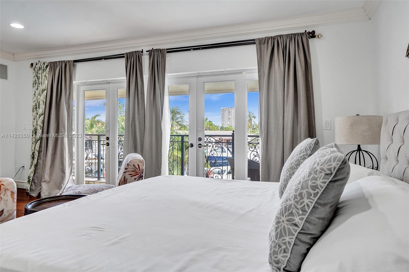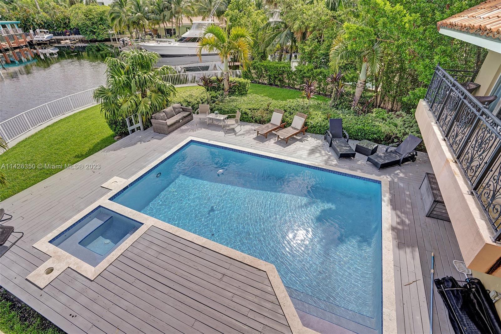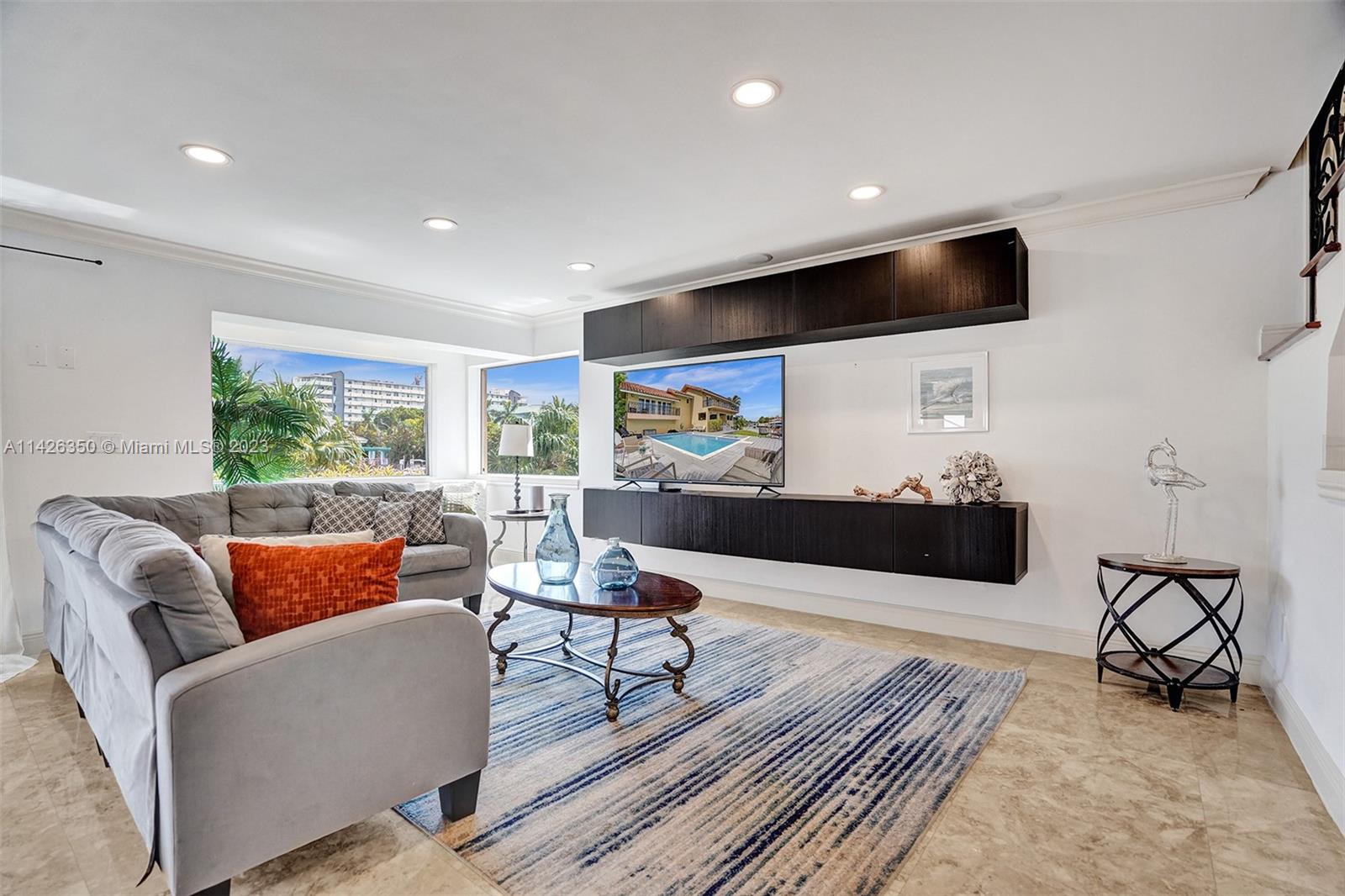 This incredible home is on private cul-de-sac street in a gated community on the water in desirable Eastern Shores. The home is completely renovated & furnished with Marble & wood floors throughout. Master level is in between the first & second story in it's own private wing with balcony overlooking pool, spa & the intercoastal. All bedrooms have own private bathroom with wraparound balcony. Huge kitchen with breakfast counter, stainless steel appliances, wine cooler & gas stove. Backyard is great for outdoor entertainment with heated pool, spa and plenty of room for outdoor activities, including a 65 foot boat dock that can dock a large boat or yacht. The sea wall is 180 feet long all around. NO HOA & just few minutes to beach & Oleta State Park. Short term rentals allowed 3 times yearly