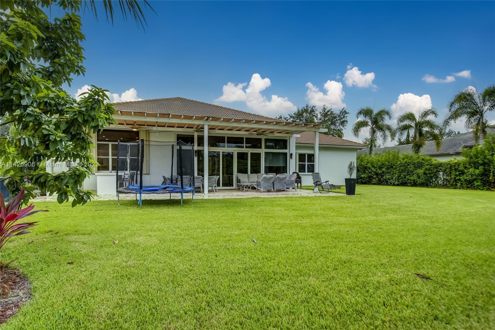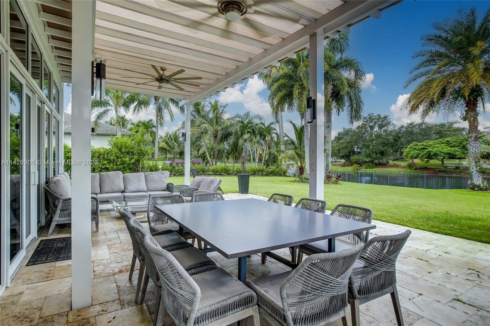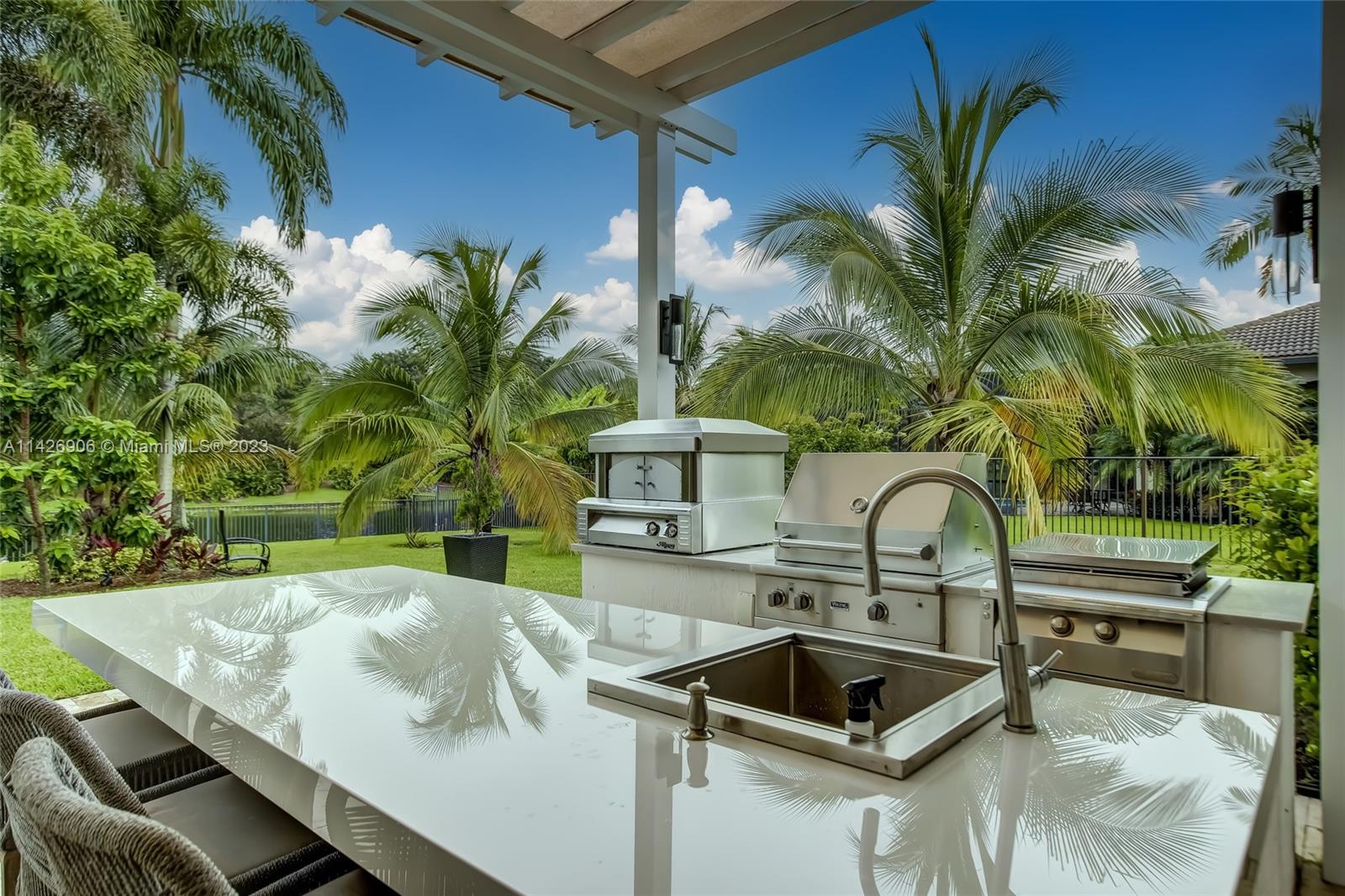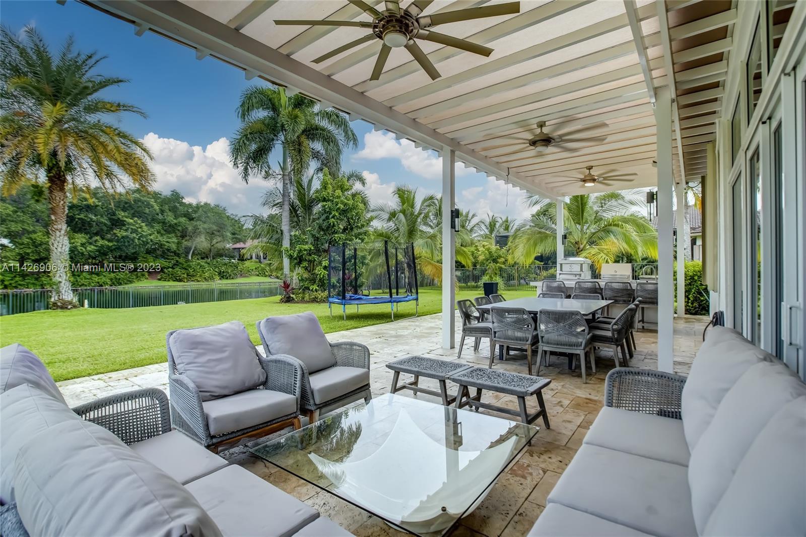JUST REDUCED TO SELL!! VERY MOTIVATED SELLER, THIS SPECTACULAR! 1 STORY HOME at The Exclusive IMAGINATION FARMS Guard GATED Community, this AMAZING High Ceiling Waterfront 4 Bed, 3 full baths, Updated Kitchen with Stone & Quarz Counter Top, Premium Brands Appliances with a Steamer Oven, Custom Wine Cellar with Cooling System, Icemaker & Wet Bar, UNIQUE A/C enclosed Patio with IMPACT GLASS & IMPACT Sliding Doors, ALSO IMPACT MAIN DOOR ENTRANCE 3 Car Garage with a/c, outdoor Cover Terrace with a Full Kitchen, Pizza Oven & Premium appliances, the Single Garage is set up as a Gym, Gym equipment included, Furniture & decorations & Art Pictures, except for Master Bedroom bed with 2 night stands, 1 Art Picture & part of Wine & Spirits inventory), accordion shutters throughout, LOW HOA.