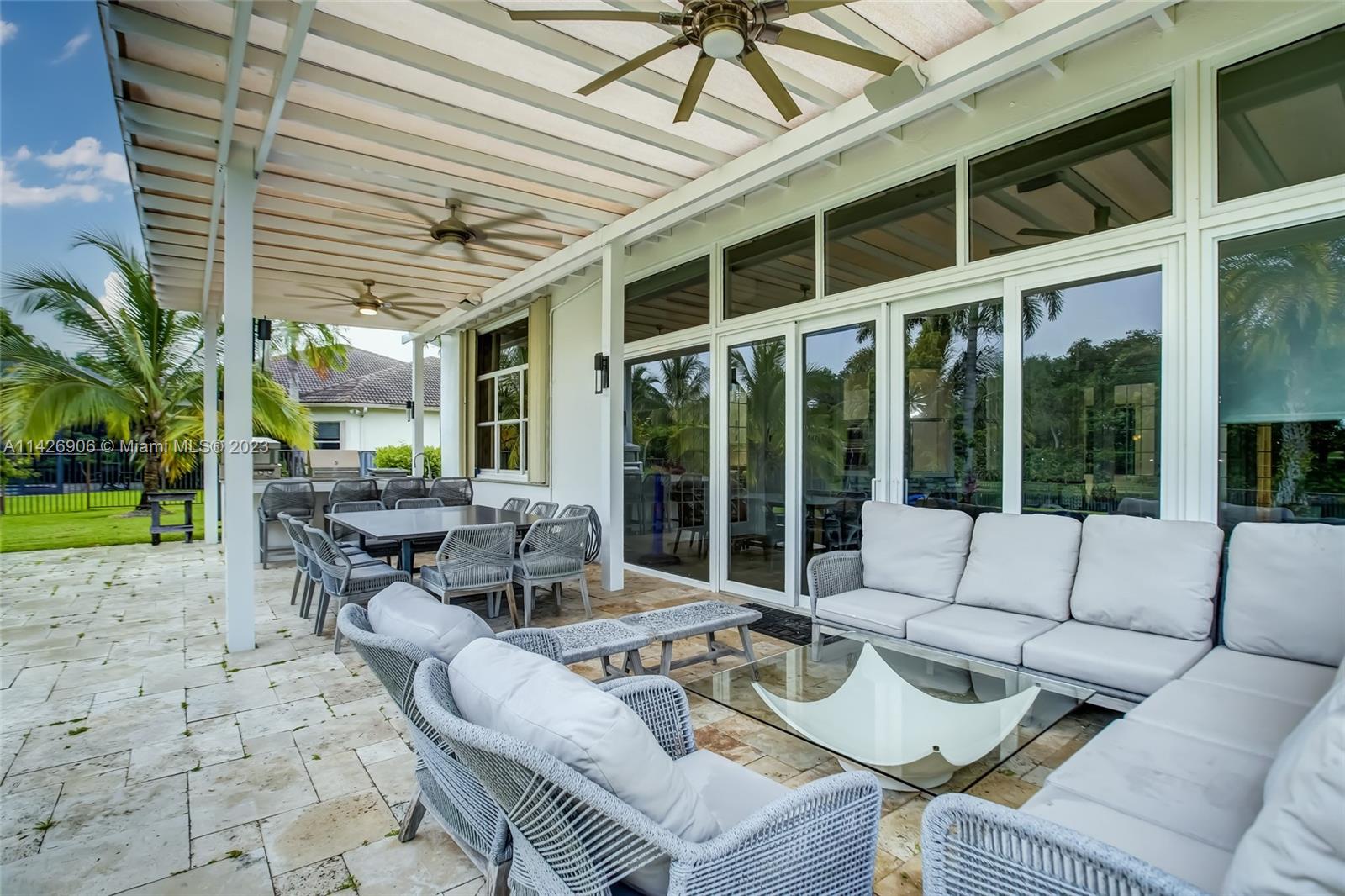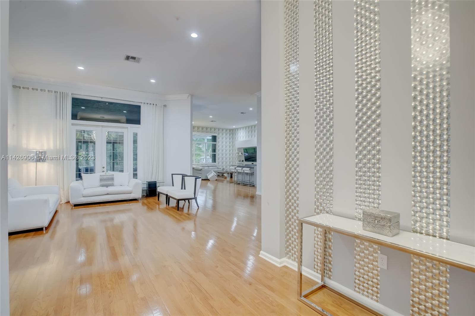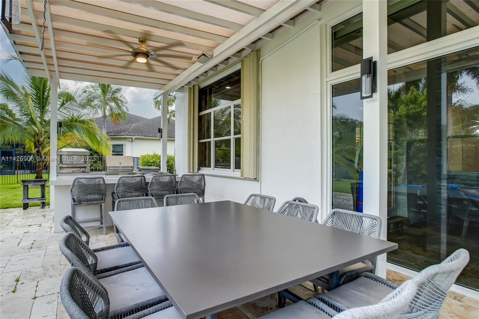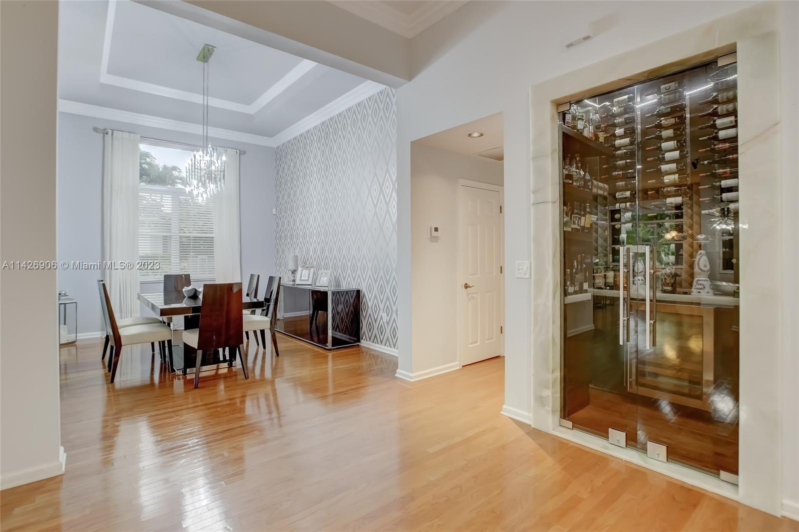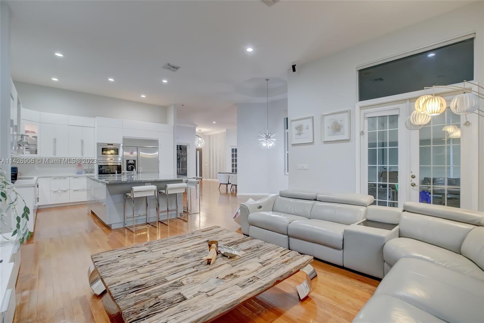 JUST REDUCED TO SELL!! VERY MOTIVATED SELLER, THIS SPECTACULAR! 1 STORY HOME at The Exclusive IMAGINATION FARMS Guard GATED Community, this AMAZING High Ceiling Waterfront 4 Bed, 3 full baths, Updated Kitchen with Stone & Quarz Counter Top, Premium Brands Appliances with a Steamer Oven, Custom Wine Cellar with Cooling System, Icemaker & Wet Bar, UNIQUE A/C enclosed Patio with IMPACT GLASS & IMPACT Sliding Doors, ALSO IMPACT MAIN DOOR ENTRANCE 3 Car Garage with a/c, outdoor Cover Terrace with a Full Kitchen, Pizza Oven & Premium appliances, the Single Garage is set up as a Gym, Gym equipment included, Furniture & decorations & Art Pictures, except for Master Bedroom bed with 2 night stands, 1 Art Picture & part of Wine & Spirits inventory), accordion shutters throughout, LOW HOA.