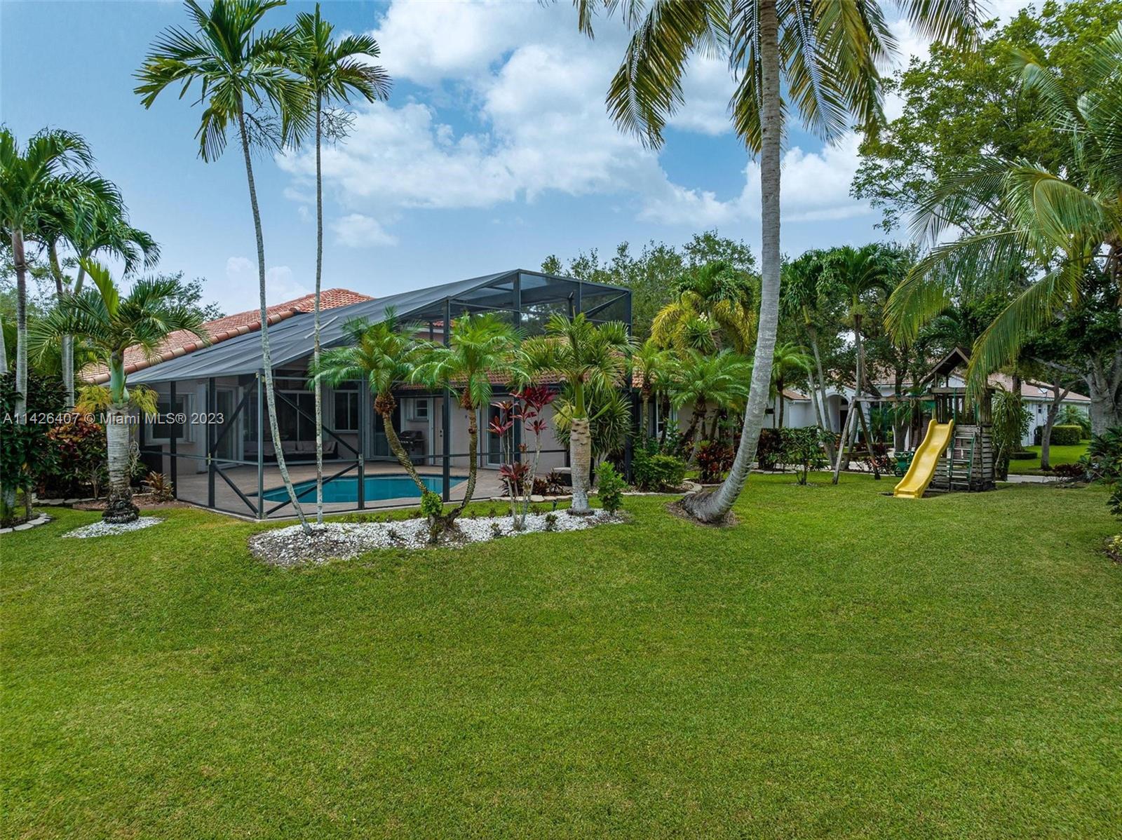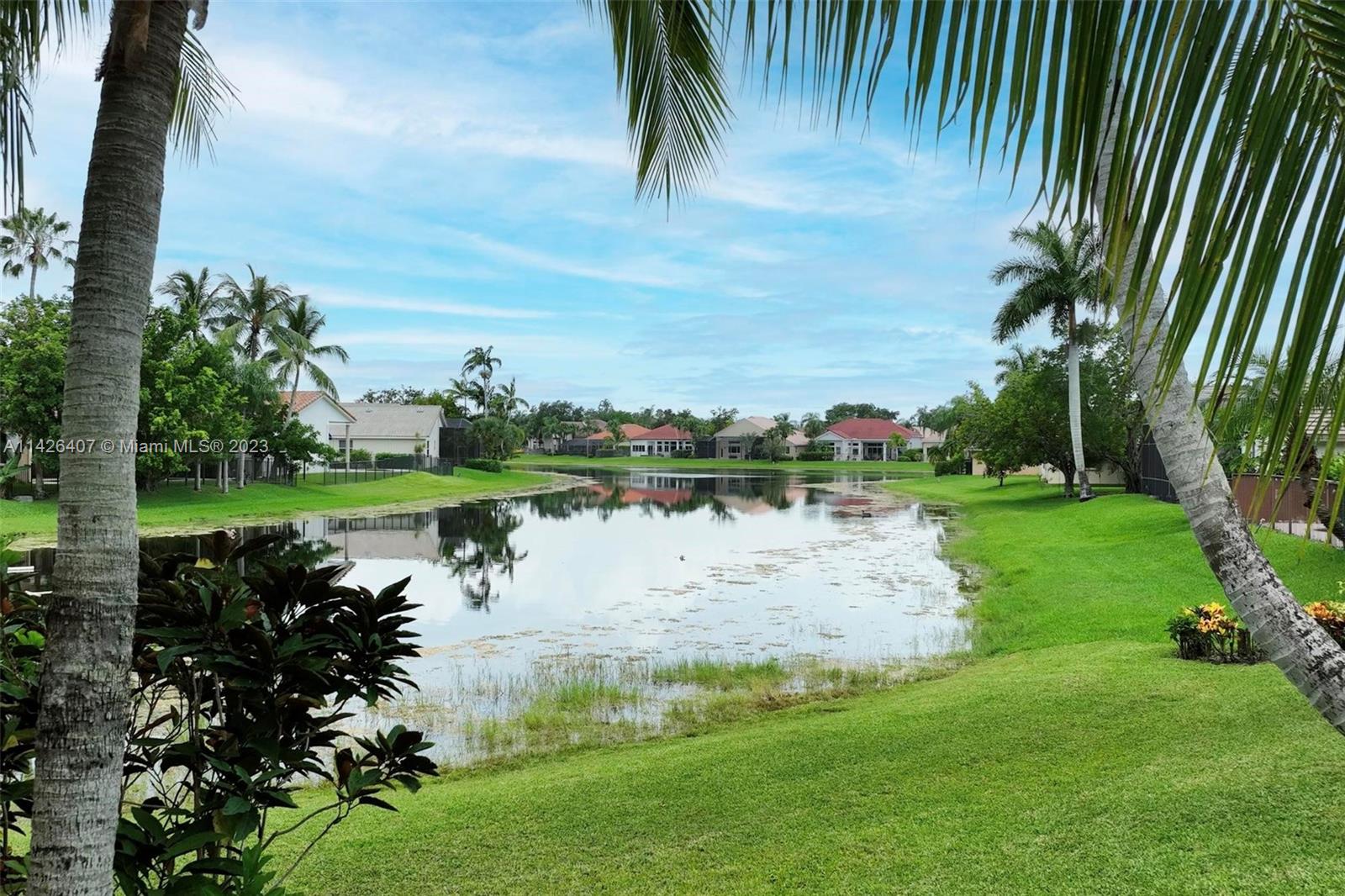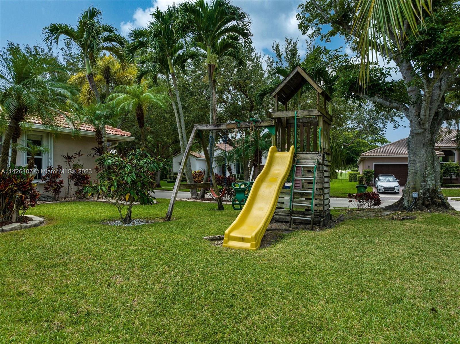 Discover your own private paradise in Weston Hills! This exquisite 5-bedroom, 2.5-bath home sits on an over 1/4 corner lot, providing privacy and a calming atmosphere. With the perfect blend of functionality with its inviting split floor plan and airy open kitchen Step outside to a beautifully landscaped front and backyard, complete with a kids' playground that comes with the house, offering endless fun for your little ones. Unwind by the screened pool and the breathtaking lake views, and as a bonus, a stunning golf view from your haven. Safety is assured with accordion shutters, security camera system in place and the bus stop to top-notch schools just a minute's walk away makes this home an absolute dream for families. Don't miss the chance to call this remarkable oasis yours!