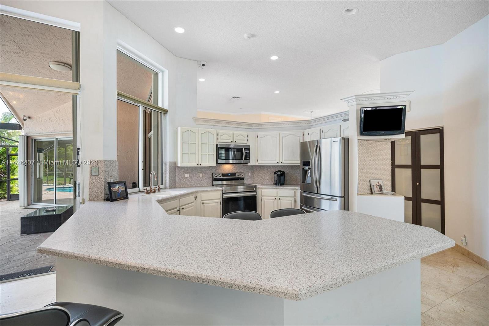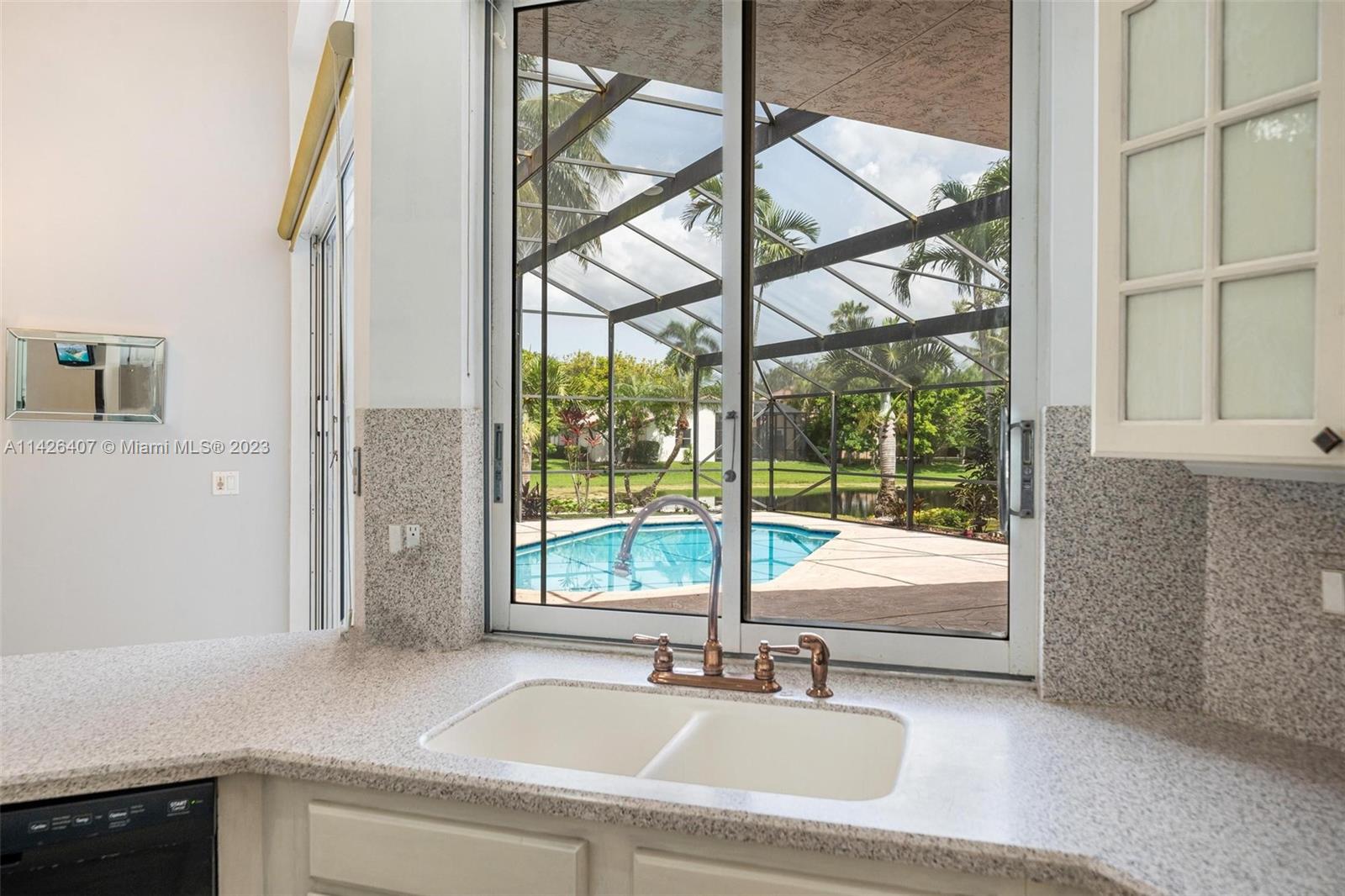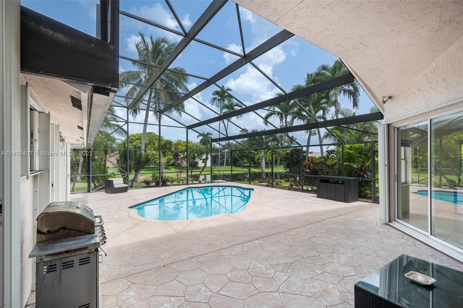 Discover your own private paradise in Weston Hills! This exquisite 5-bedroom, 2.5-bath home sits on an over 1/4 corner lot, providing privacy and a calming atmosphere. With the perfect blend of functionality with its inviting split floor plan and airy open kitchen Step outside to a beautifully landscaped front and backyard, complete with a kids' playground that comes with the house, offering endless fun for your little ones. Unwind by the screened pool and the breathtaking lake views, and as a bonus, a stunning golf view from your haven. Safety is assured with accordion shutters, security camera system in place and the bus stop to top-notch schools just a minute's walk away makes this home an absolute dream for families. Don't miss the chance to call this remarkable oasis yours!