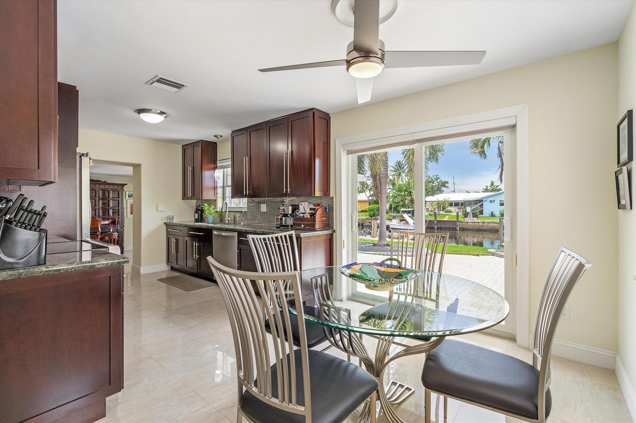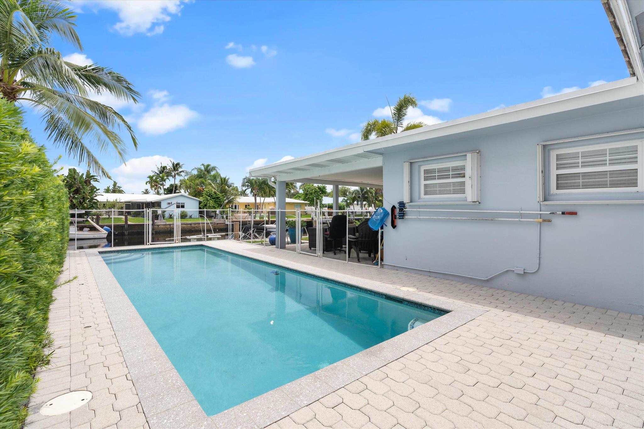 Outstanding waterfront home in Lake Estates! Mint condition 3 bedrooms, 2 bathrooms, sought after floor plan with a living room, dining room, Florida room, and a bonus room ideal for an office or large storage area, heated saline pool, 2 car garage, 75' of prime waterfront on a wide canal, 30' dock, South exposure, and so much more! Additional features and upgrades include: Full HURRICANE protection (combination of Impact doors installed in 2023 and shutters for all windows) Porcelain ceramic tile throughout, smooth ceilings throughout, remodeled kitchen, HVAC - 2020, Eco tankless hot water heater - 2023, gutters for front and back - 2023, the dock has new top boards and cement wrapped dock pilings in 2022, and a Heated pool installed in 2015 with saline salt system in 2020, Flat roof -