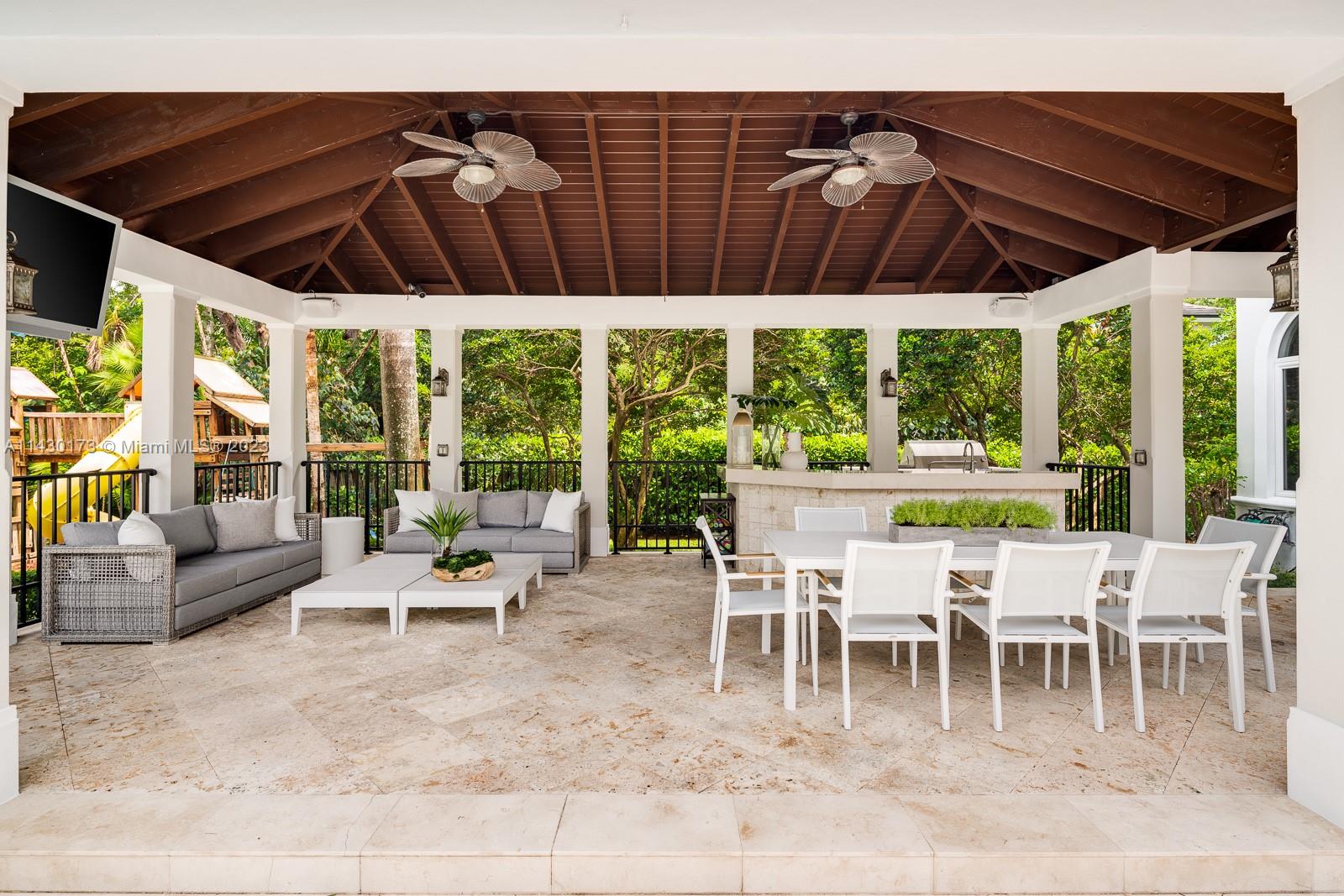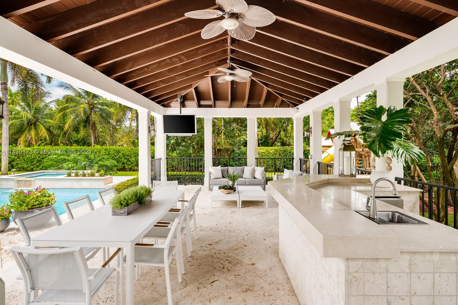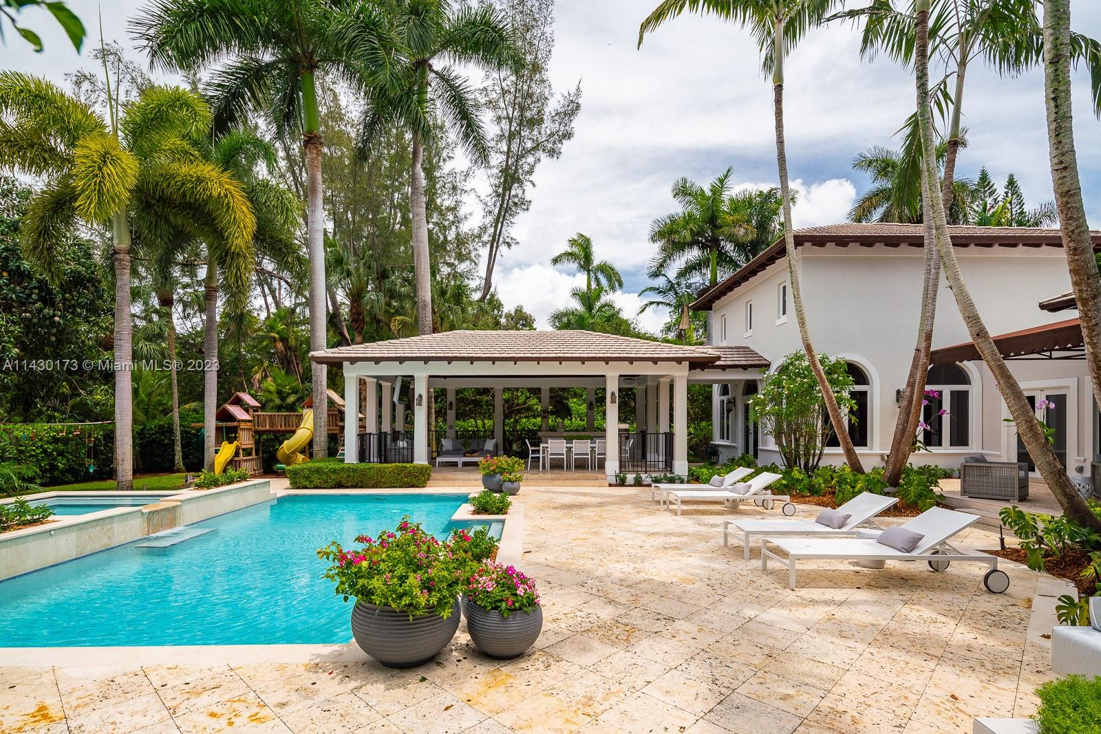 Fantastic opportunity to live on a private cul-de-sac in the exclusive, guard-gated community of Snapper Creek Lakes. Built in 2005, this 6 bed, 7.5 bath 6,528SF home was thoughtfully renovated in 2022, ensuring modern comforts and stylish living. This home boasts vaulted and beamed volume ceilings and abundant light throughout. A desirable layout features a primary suite on second level, formal living and dining rooms, an ample chef’s kitchen, and a spacious pool area with decks and gazebo perfect for entertaining. Ideal family home with basketball court, batting cage, playground, and ample yard. Snapper Creek Lakes provides amenities such as a private marina available to residents only, a clubhouse, and a 24/7 security patrol.