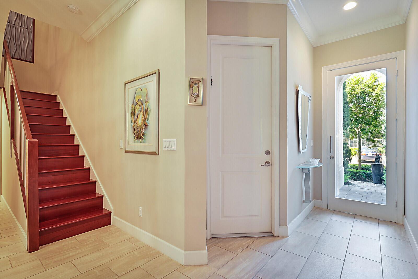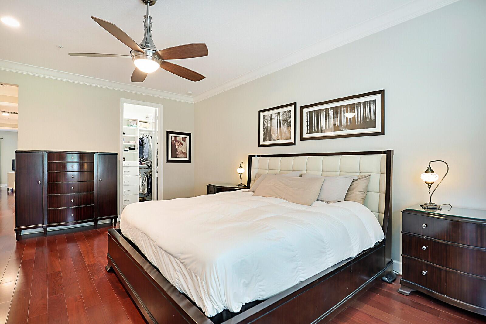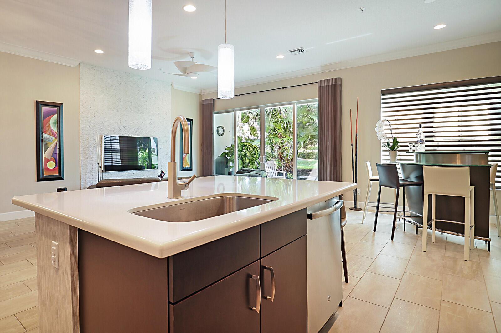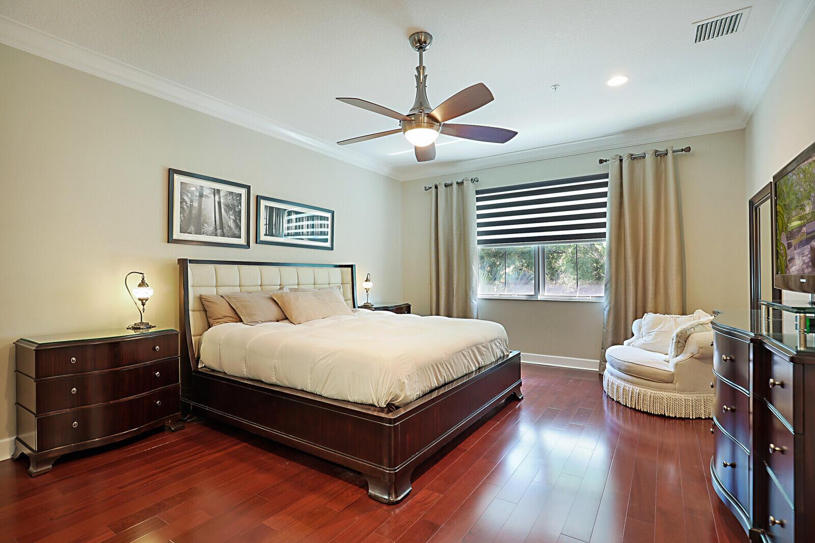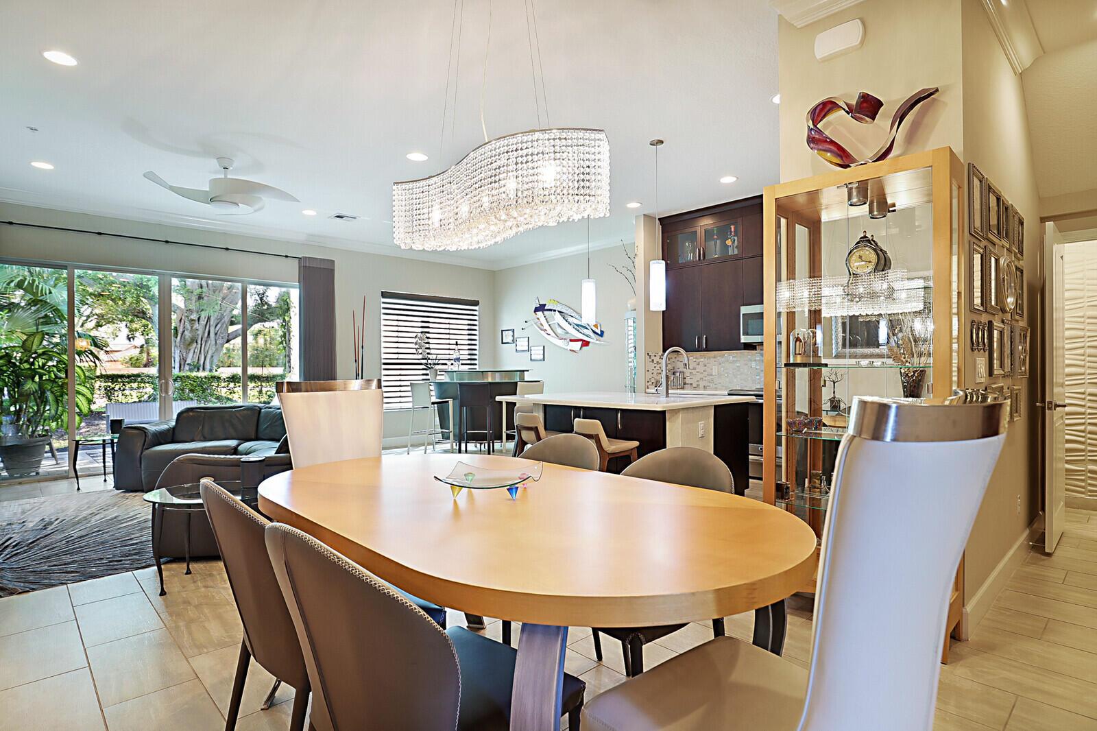 Mother nature is calling! Immaculate townhome in the newest Boca Pointe village of Pointe 100 has the most peaceful expanded patio/backyard with birds, butterflies + a canal behind with turtles & fish. Boca Pointe is an all ages, NON MANDATORY country club community w/all levels of membership available but NOT REQUIRED. This ''better than new'' home has many upgrades including the tile & wood flooring, kitchen cabinets & quartz counters, GE Profile stainless steel appliances, light fixtures, Jerusalem stone wall treatment surrounding the TV, crown molding +Brazilian Cherry wood floors on staircase & entire 2nd level. Upstairs Primary Suite has crown molding, customized walk-in closet, upgraded bathroom w/Toto commode/bidet, 2 vanities with quartz counters & beautiful water view.