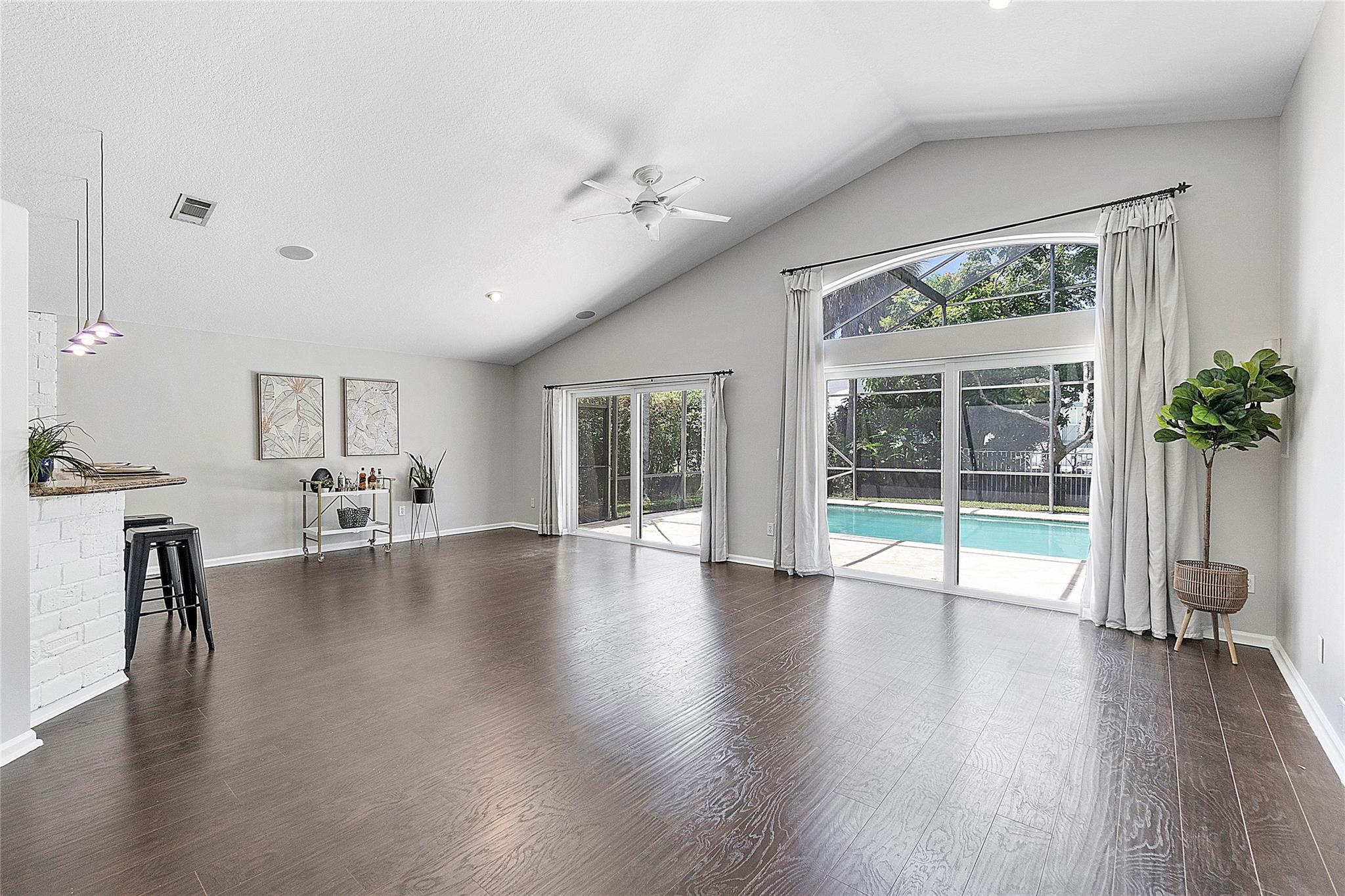 Spectacular, pool home with a NEW ROOF (2020) and FULL IMPACT PROTECTION and 2017 A/C. This 3-bedroom 2 bath home is in the highly sought after community of Coral Shores in Wyndham Lakes. This turnkey house will captivate you from the moment you enter, with vaulted ceiling and a bright open floor plan. The spacious kitchen has white shaker cabinets and granite countertops and stainless-steel appliances. The primary bath has a double vanity. The walk-in shower has two shower heads. Walk-in closet with built-ins. In addition to the pool, you have a fully screened pool enclosure to enjoy your backyard; perfect for barbecues and entertaining. Conveniently located near expressways, shopping, parks, and A+ Rated Schools.