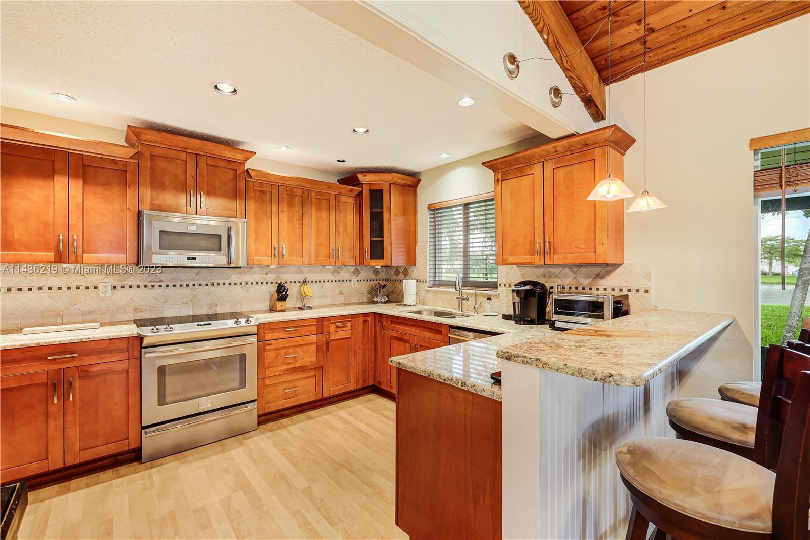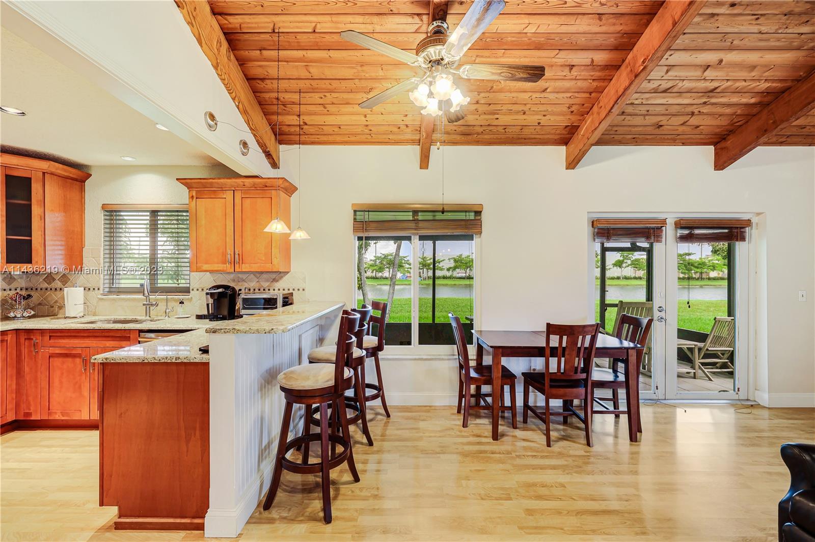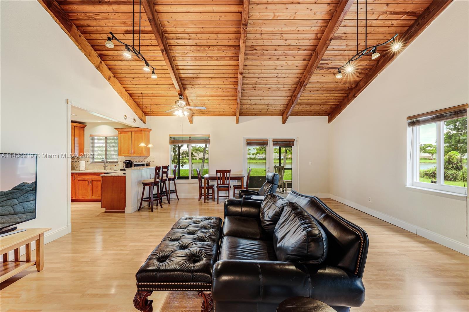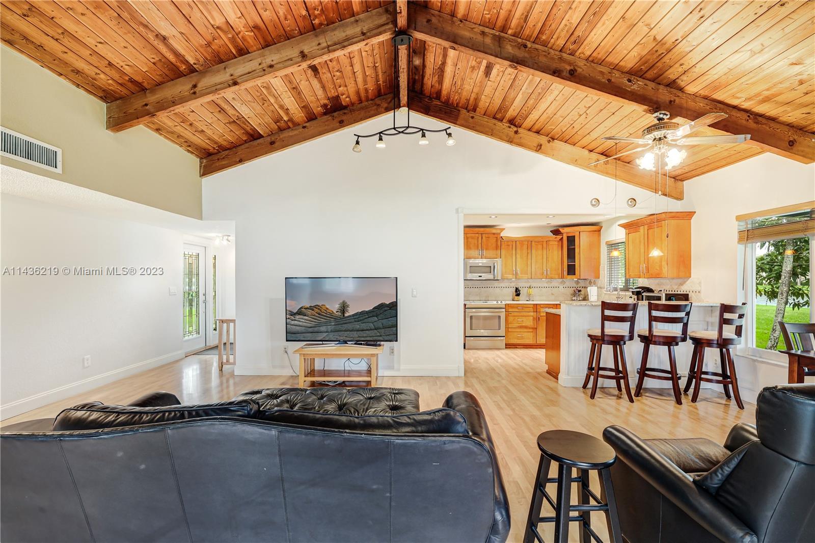 Welcome to your spacious 3/2 home in Davie, near restaurants, shopping & the university complex (Nova University, Broward College, etc.) Social area features beautiful wood vaulted ceilings & wood flooring. Bamboo floor in bedrooms. Kitchen remodeled +/- 10 yrs ago with lots of cabinet space & granite counters. A/C still under warranty (1 more yr). It features blue-tube UV to fight mold & contaminants. Screened patio features a relaxing view of the palm & mango trees & the water beyond. 2 closets in main bedroom, double sized linen closet in hall. All impact windows & doors. Garage has a secure bar for hurricane protection. Association fee covers lawn maintenance, community pool, kids playground, tennis & ½ basketball court. This lot enjoys the most private space away from neighbors.