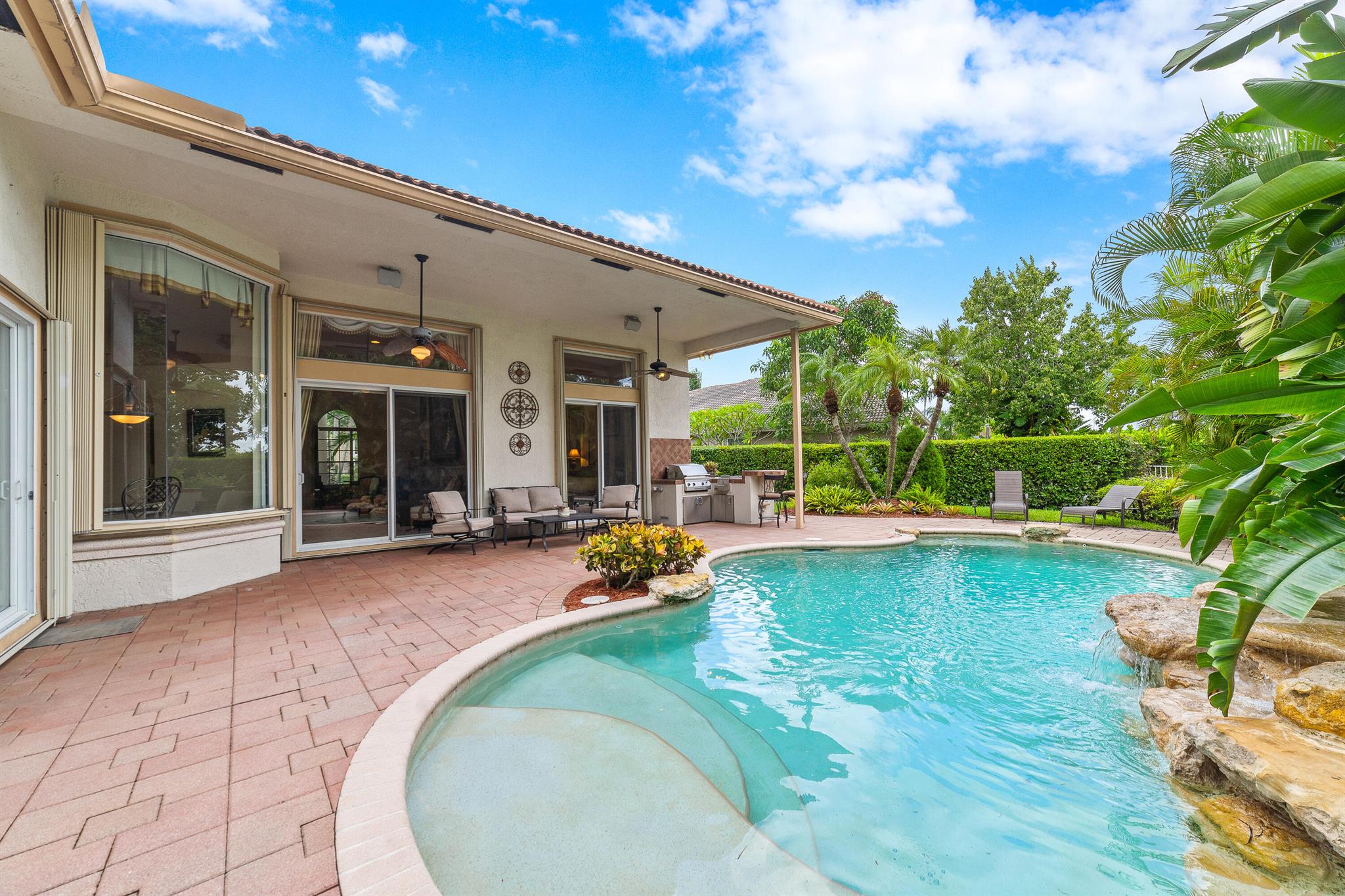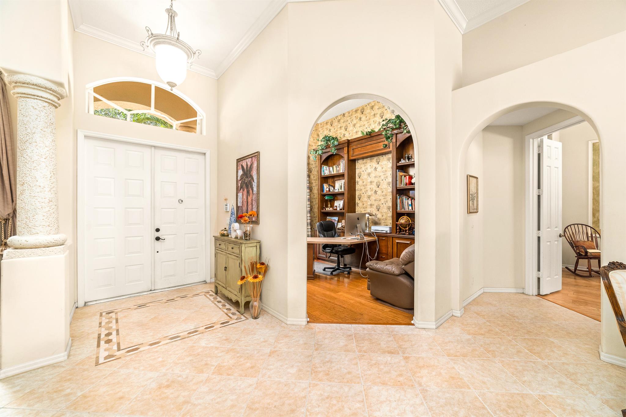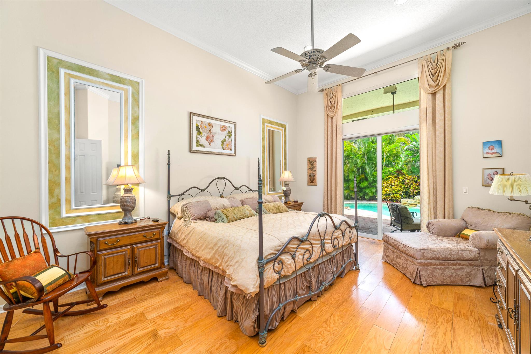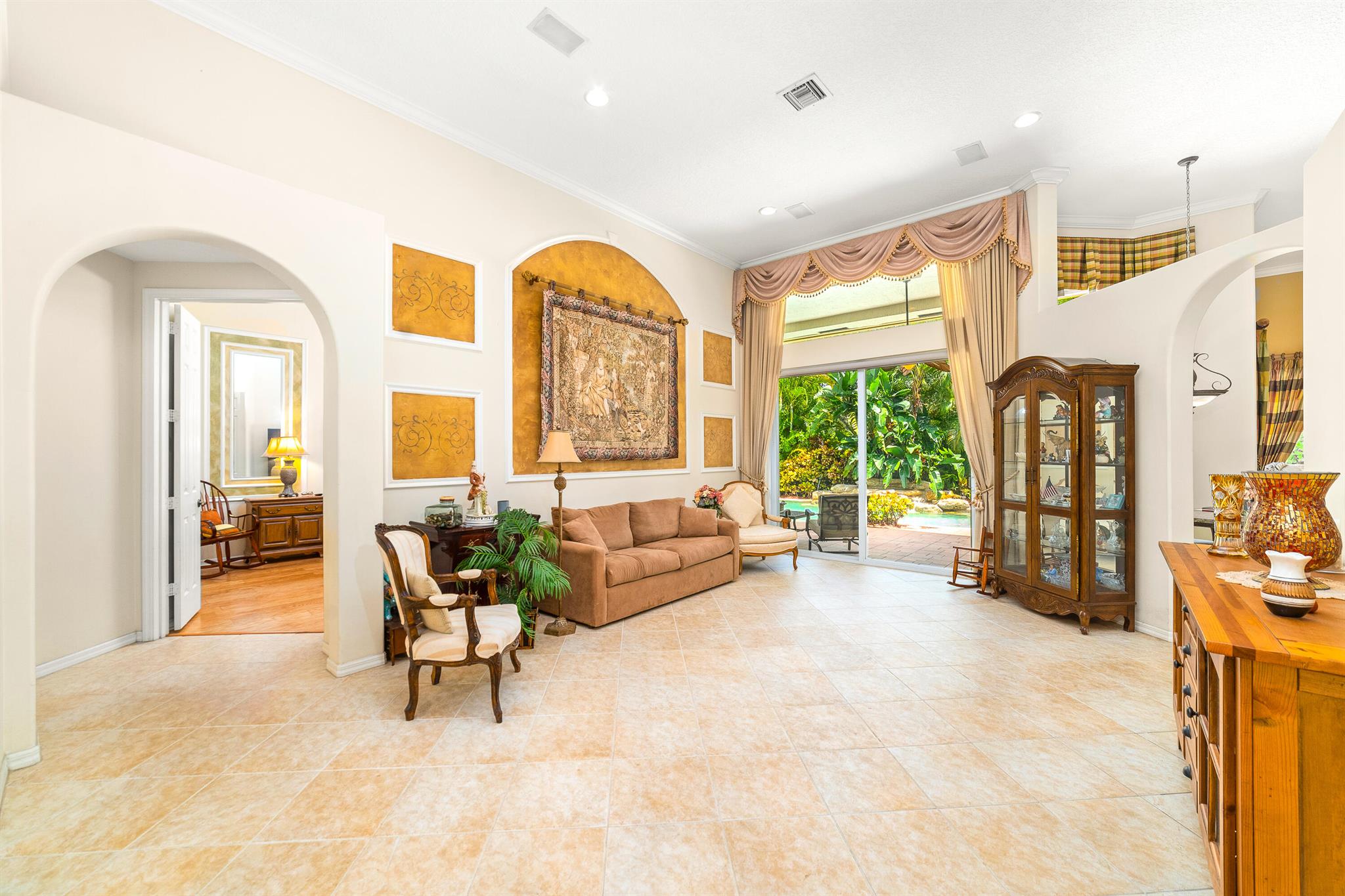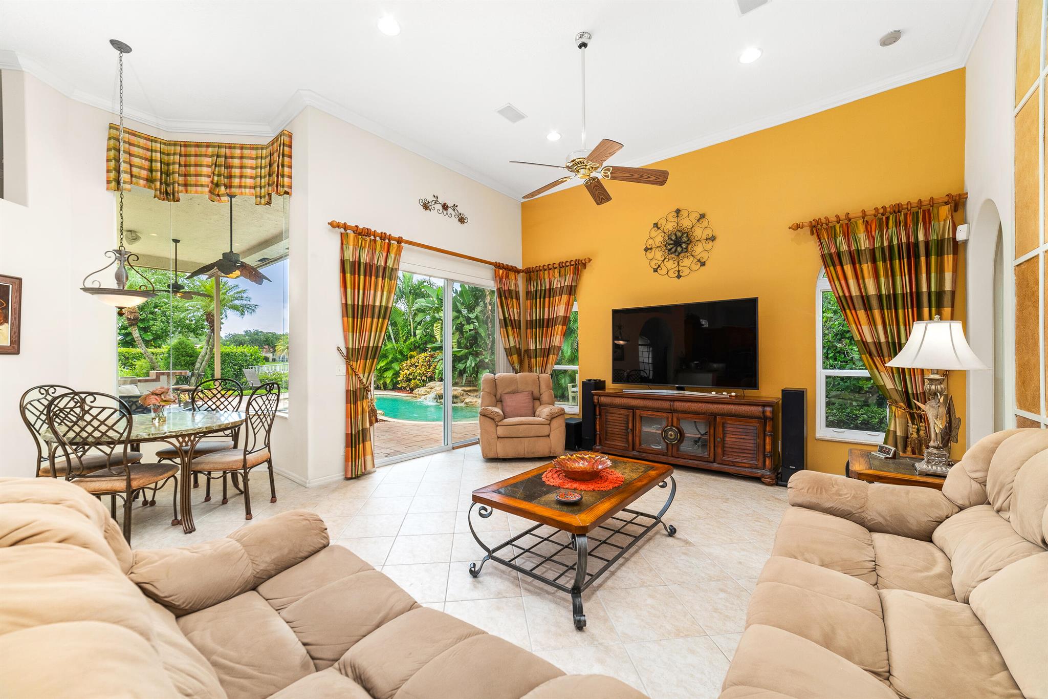 Welcome to this gorgeous 4-bedroom, 3 bathroom former Model Home located in the highly sought after Grand Reserve community of Coral Springs. As soon as you enter, you immediately notice the soaring high ceilings, custom crown molding and abundant natural light. All windows have accordion shutters, impact garage doors, full impact sliding doors and just recently installed ten impact windows. The home features a convenient triple split bedroom floor plan providing terrific privacy to both primary owner and guests. The property has tile-flooring throughout the living areas with engineered wooden flooring in the bedrooms. The Primary suite is enormous with a sizeable walk-in closet, offering custom built shelving and a beautiful view of the pool. The primary bathroom