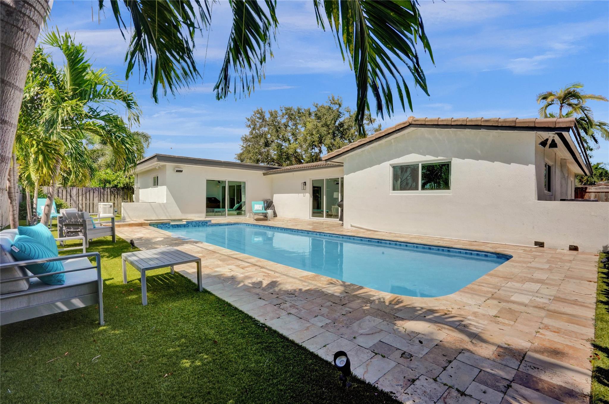 SELLER FINANCING AVAILABLE. Beautifully updated and spacious pool home features a split bedroom floor plan and two primary suites with wood-look porcelain tile throughout. Gorgeous, renovated kitchen with an expansive island, plenty of storage, quartz counter tops, stainless-steel appliances, tile back splash, and white shaker cabinets open to the spacious living and dining areas. All three bathrooms tastefully updated. This home also features impact windows and doors throughout, a whole house generator, a private fenced-in turf backyard with travertine patio surrounding the over-sized saltwater heated pool and spa, circular driveway and one car garage. This residence is ready for you to move in and enjoy! Great location just minutes to beach, shops, restaurants, schools and more!