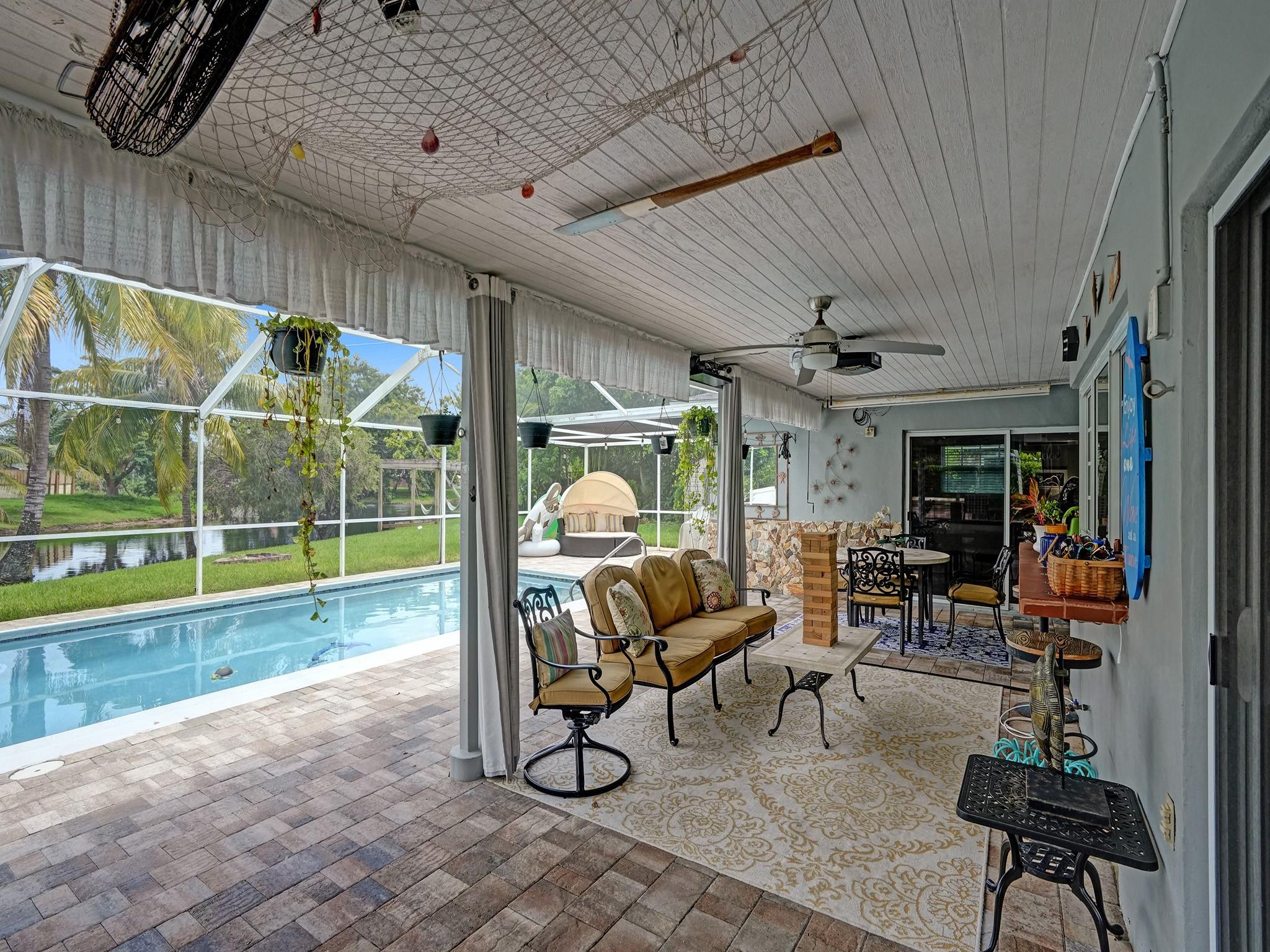 All your dreams just came true! As soon as you walk in you will fall in love! Enjoy your morning coffee on the inviting patio overlooking beautiful pool area, peaceful water views and expansive back yard. Ceramic tile throughout. Large master bedroom with walk in closet and extra A/C. 2nd bath features jacuzzi tub! Large open eat in kitchen, pantry and Newer appliances. Brand new roof (2 months), A/C 2 years old. Hurricane impact windows and doors throughout. Newer Washer and Dryer (2 years), Pool Diamond Brite 5 yrs old, New pool pump (2023). Patio and pool are screened with gorgeous pavered patio. Hot tub and some exterior lighting included! Sprinkler system feeds from the lake. Garage is partially converted with A/C. Can be 3rd bedroom, office, gym ect. Hurry before this one is gone!