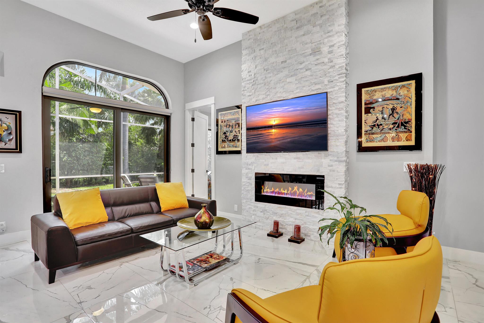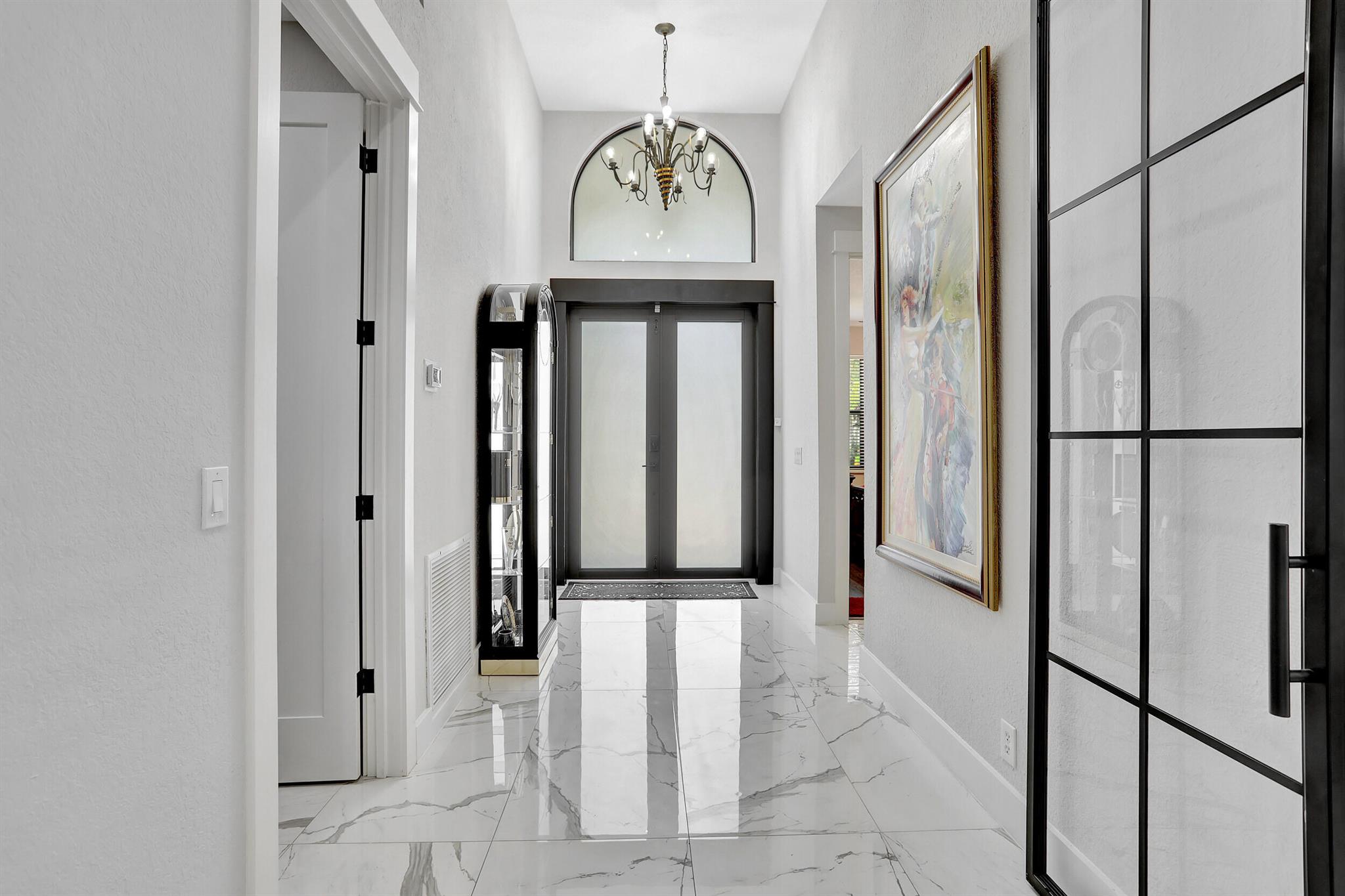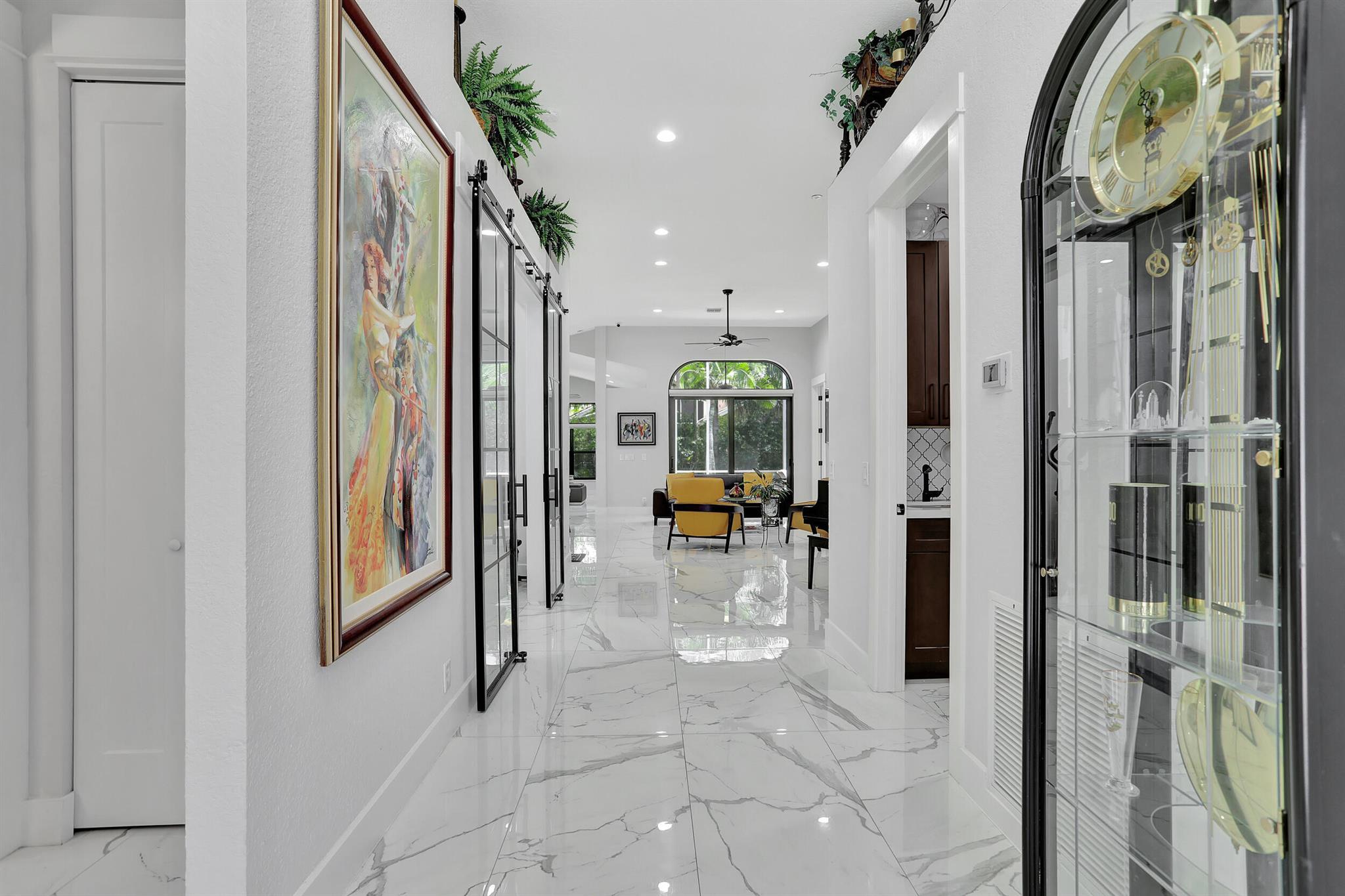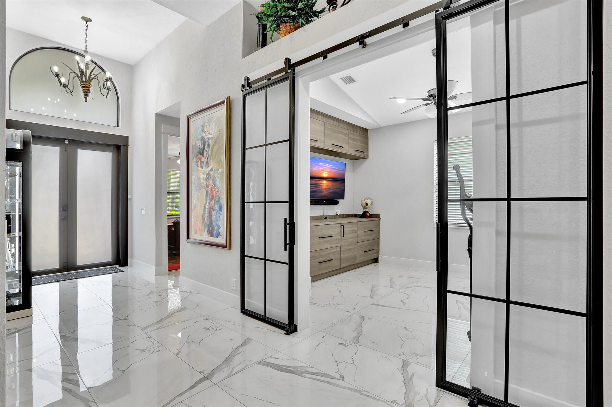Situated behind the guarded gates of Eagle Trace you will find this exquisitely appointed home that has been remodeled with elegance and sophistication! Tucked in to a culdesac you will approach your new home thru updated impact double glass doors! Once opened the pristine marble floors catch your eye and lead you thru the foyer to the main living and entertaining area, featuring custom wall and electric fireplace! Enjoy cooking dinners in your updated kitchen area complete with an oversized island! Your CONVERTIBLE den/3rd bedroom has custom glass barn doors and a brand new vanity/valet drawers built in! This home is complete with all solid surface and tile flooring, IMPACT WINDOWS, solid core interior doors, central vac and motion and camera surveillance. Come tour this gem today!