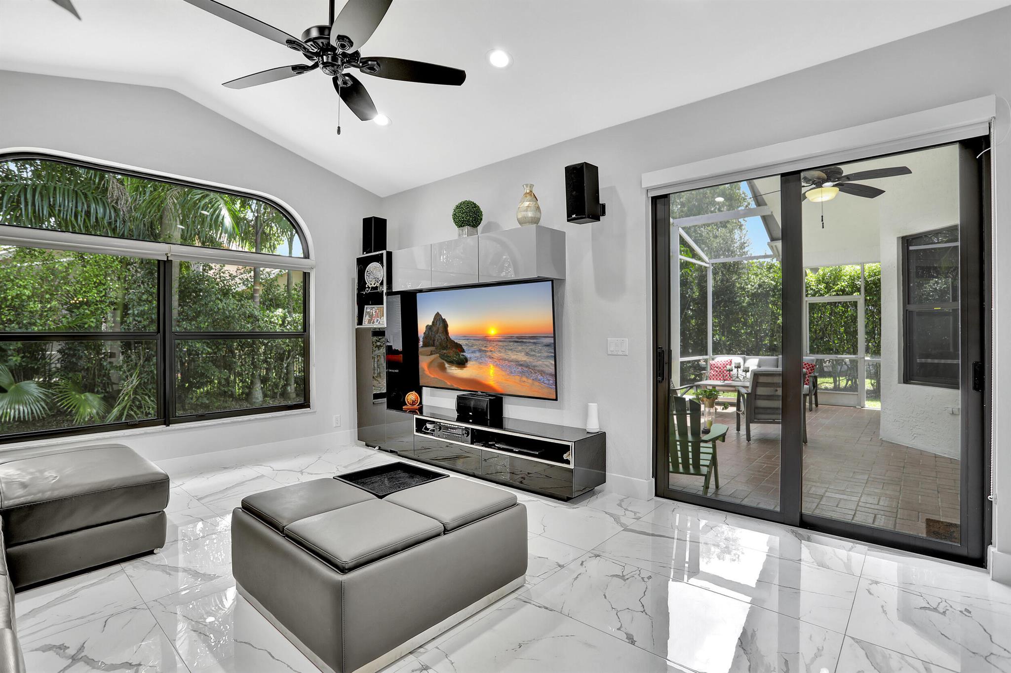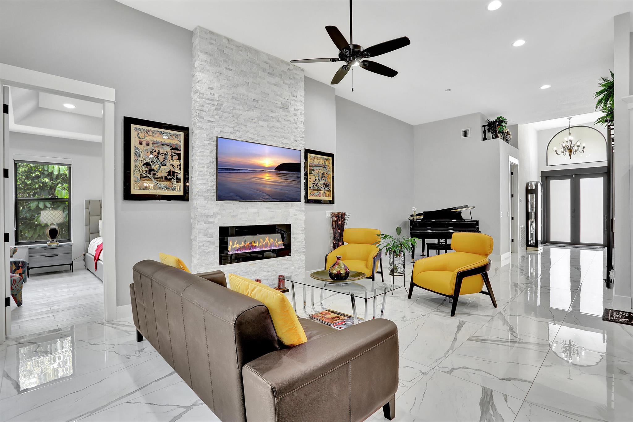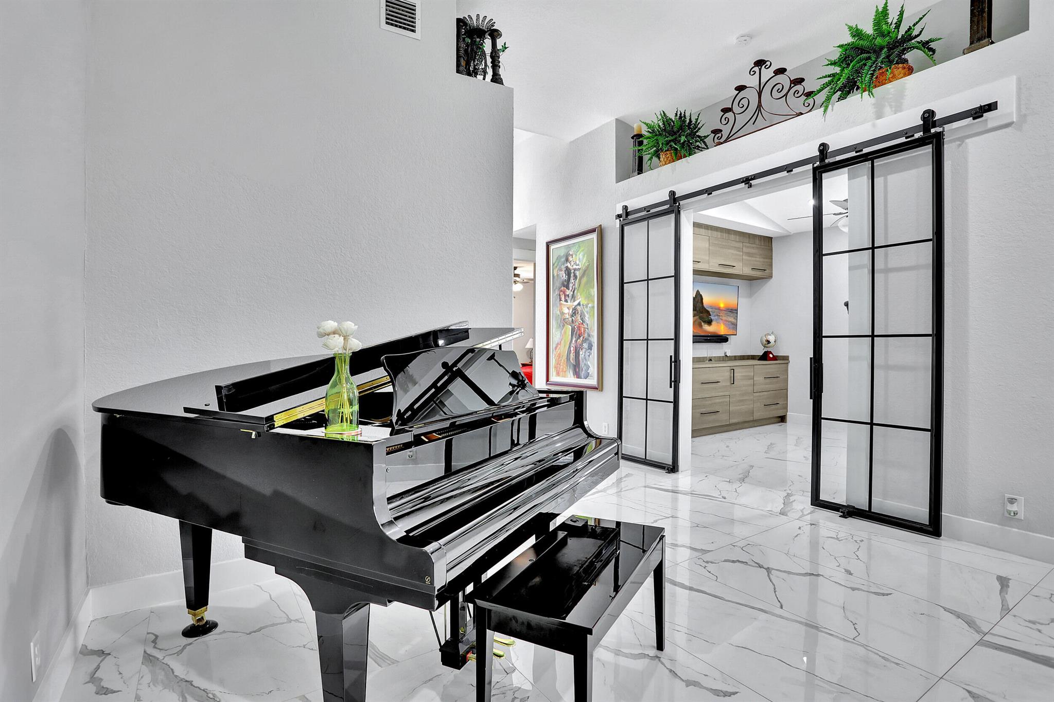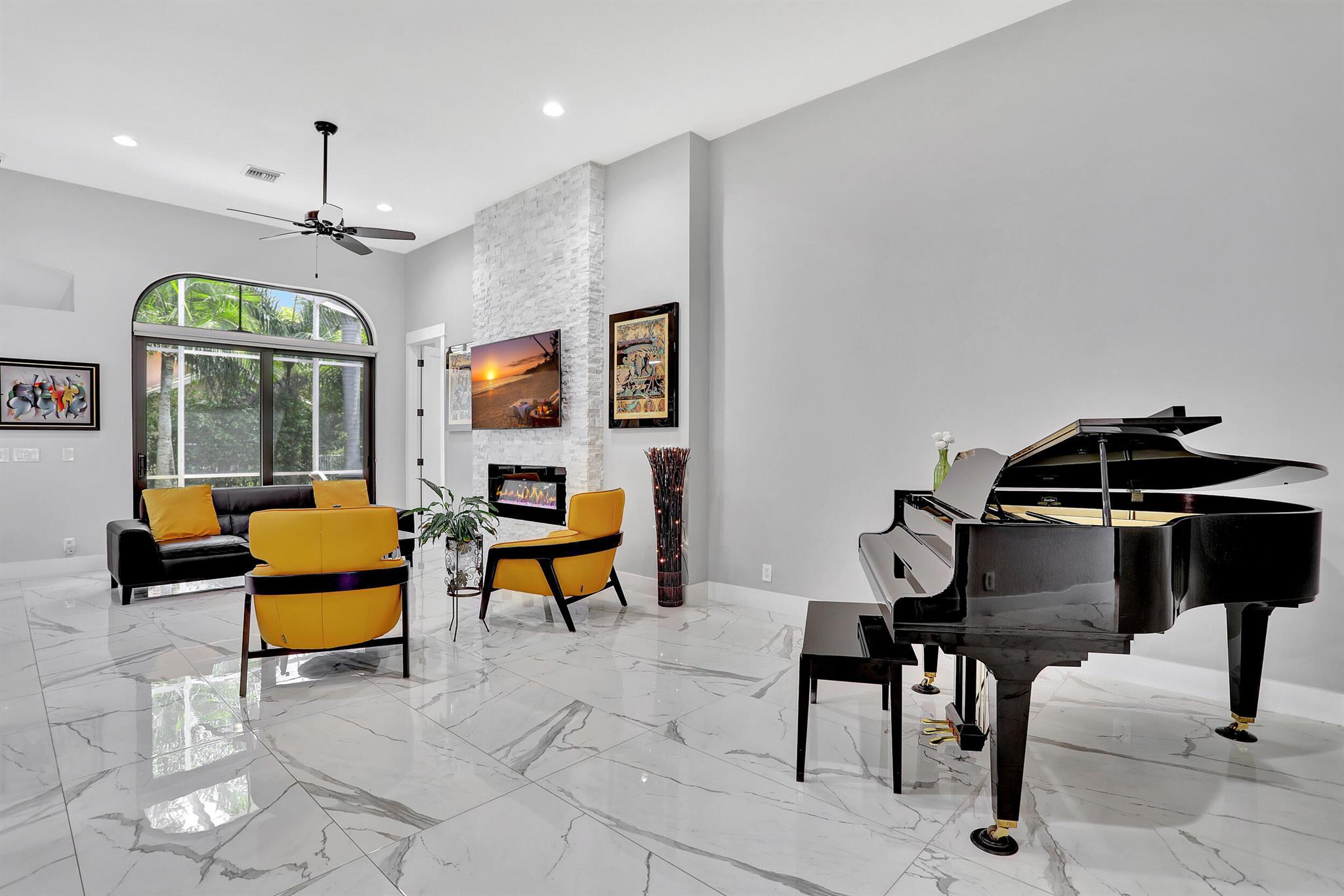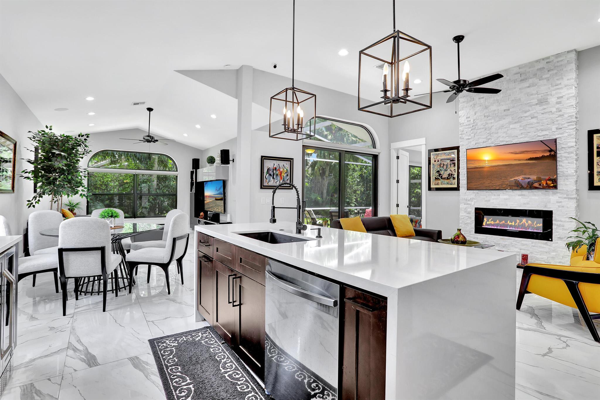Situated behind the guarded gates of Eagle Trace you will find this exquisitely appointed home that has been remodeled with elegance and sophistication! Tucked in to a culdesac you will approach your new home thru updated impact double glass doors! Once opened the pristine marble floors catch your eye and lead you thru the foyer to the main living and entertaining area, featuring custom wall and electric fireplace! Enjoy cooking dinners in your updated kitchen area complete with an oversized island! Your CONVERTIBLE den/3rd bedroom has custom glass barn doors and a brand new vanity/valet drawers built in! This home is complete with all solid surface and tile flooring, IMPACT WINDOWS, solid core interior doors, central vac and motion and camera surveillance. Come tour this gem today!