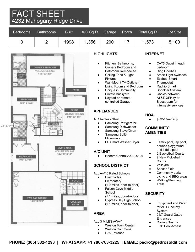 Stunning modern home located in The Ridges, one of Weston's most desirable gated communities. Fully renovated with modern upgrades. Kitchen equipped with stainless steel appliances. Smart home technology: Wi-Fi-enabled light switches, thermostat, doorbell, washer/dryer. High-efficiency AC 5 years old. Wall-mounted TV outlets in living area & bedrooms. Close to top-rated schools (under 1 mile) & Weston Town Center (3 miles). Amazing community amenities: pool, volleyball/soccer areas, pickleball/basketball courts. No flood insurance needed (Zone X). Perfect for families seeking exceptional living.