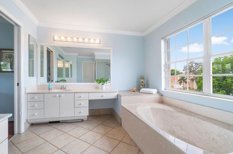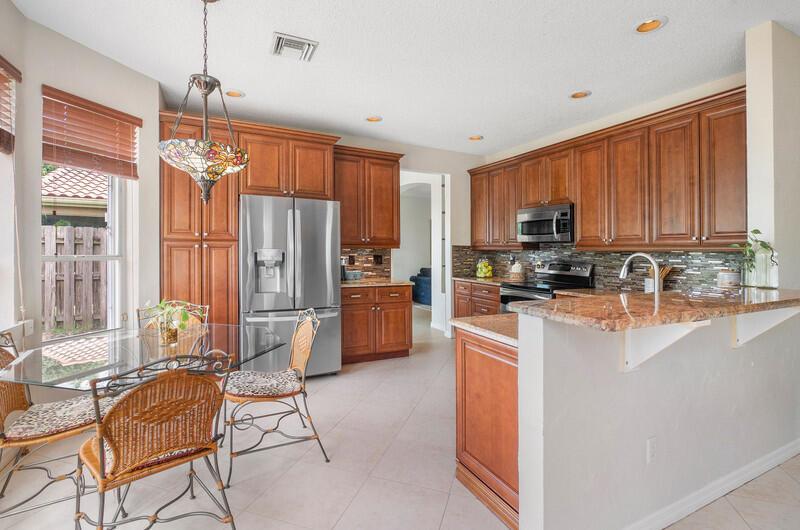 Beautiful and spacious 4 bedroom, 2.5 bath, single family home in highly desirable Port Cayman, a subdivision of Lakes at Boca Raton. This home with a freshly painted exterior features a remodeled kitchen w/ wood cabinets, granite countertops, & stainless steel appliances. The first floor features a separate living room, family room, dining room and half bath. Upstairs has four spacious bedrooms & two full baths, including a remodeled guest bathroom. Huge patio & backyard makes this home a great house for entertaining. Add'l upgrades include crown molding, newer a/c unit, new washer and dryer, & accordion shutters. Large paved outdoor patio with a huge open common greenspace area behind. Beautiful pool, BBQ & clubhouse within walking distance from house. Zoned for A rated schools.