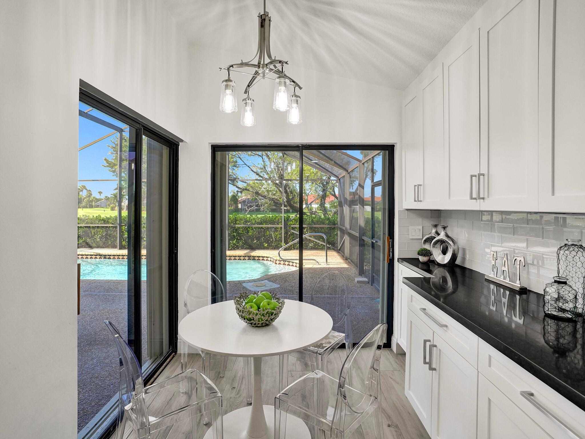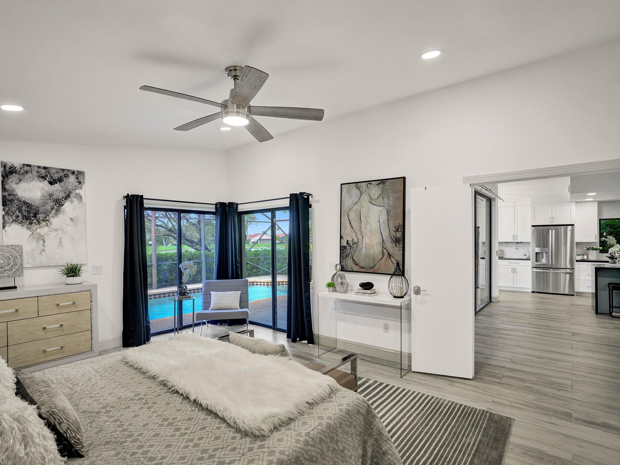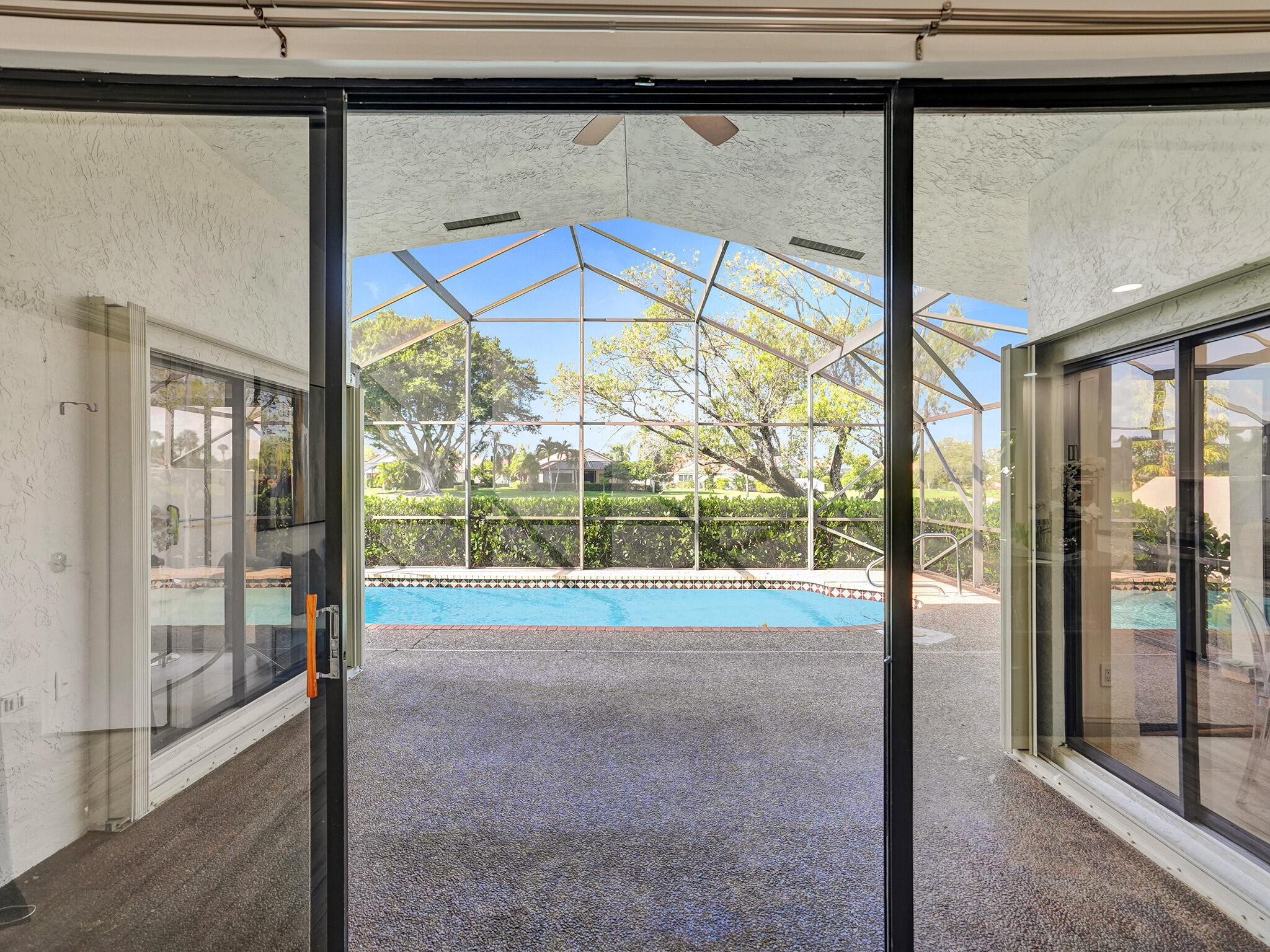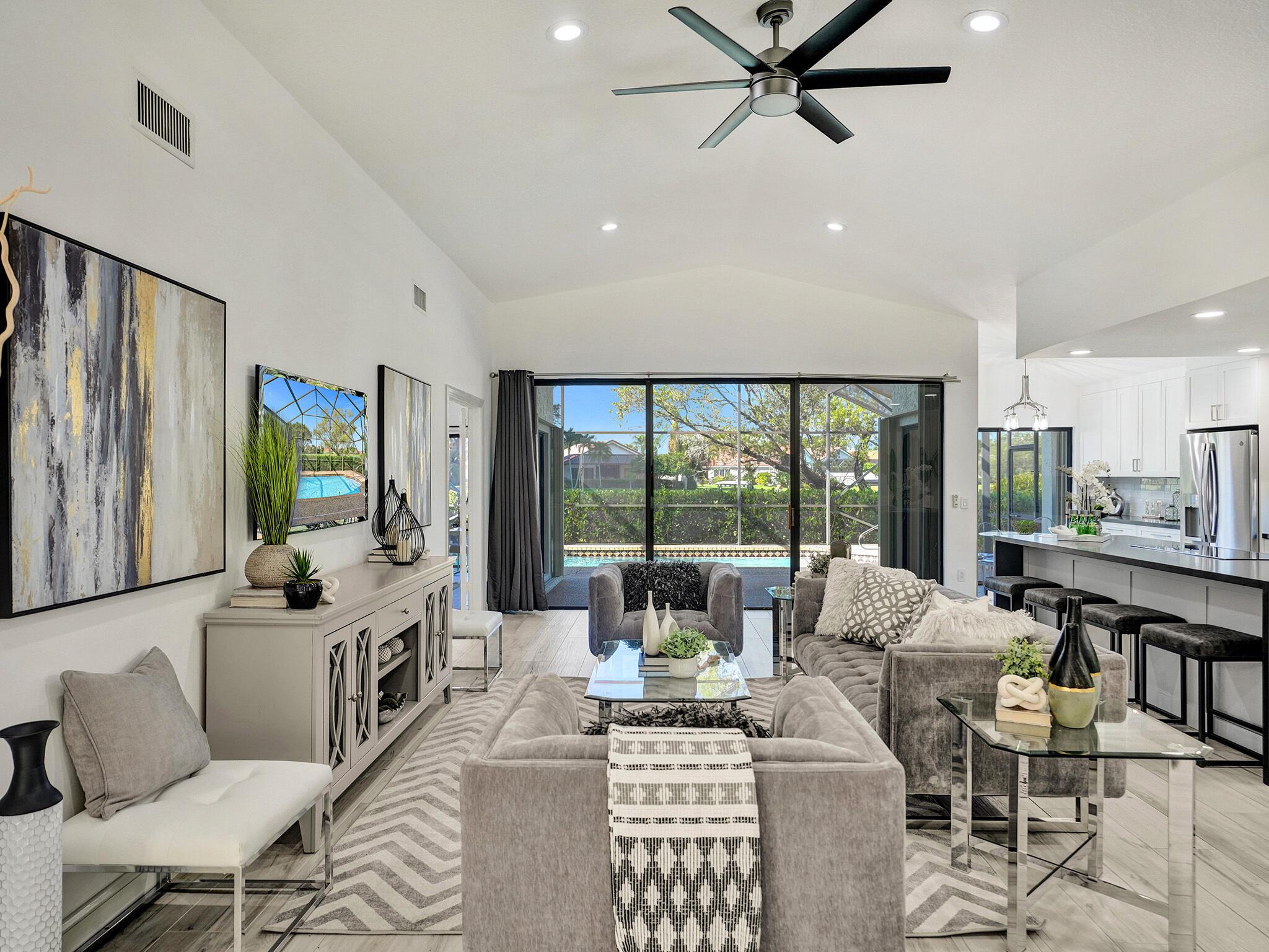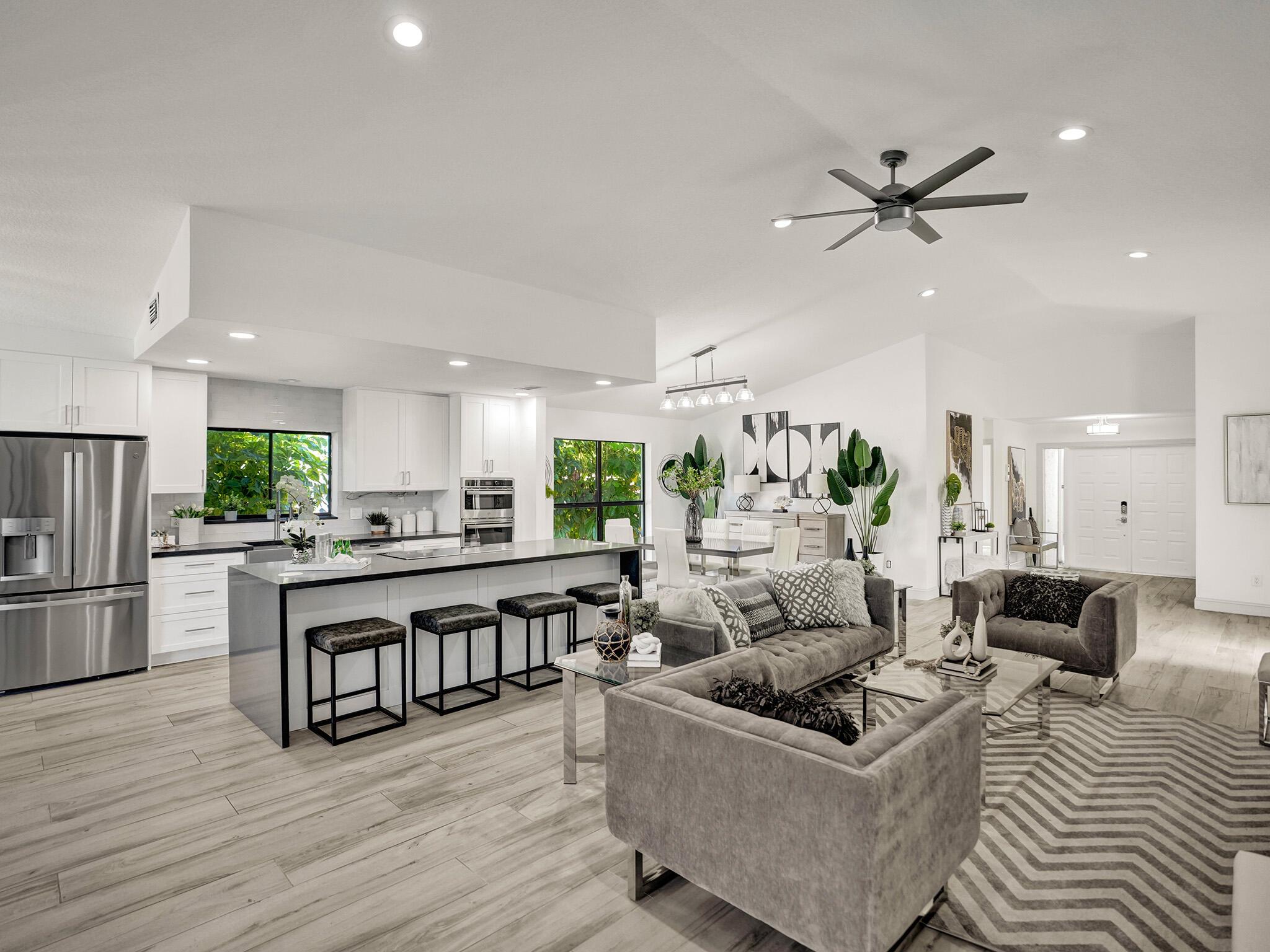 Stunning 2 bedroom PLUS den with golf view in prestigious Boca Woods Country Club. Elegantly remodeled with sleek and bright finishes. 11.5' ceilings in the great room and atrium. Natural light is abundant. Gourmet kitchen features stainless steel appliances, gorgeous white cabinets with gray quartz countertops, a large 9' x 3' island with enough seating for 4 at the bar plus a breakfast area. Master suite with a view of the pool has 2 completely outfitted walk-in closets and a luxury bath with skylight, large shower and vanity. Enjoy the view of your pool and the lush green golf course from your living room, kitchen, breakfast area and dining room. Seller is offering a $25,000 credit towards Boca Woods Golf Membership to enjoy the stunning newly renovated clubhouse and tennis courts.