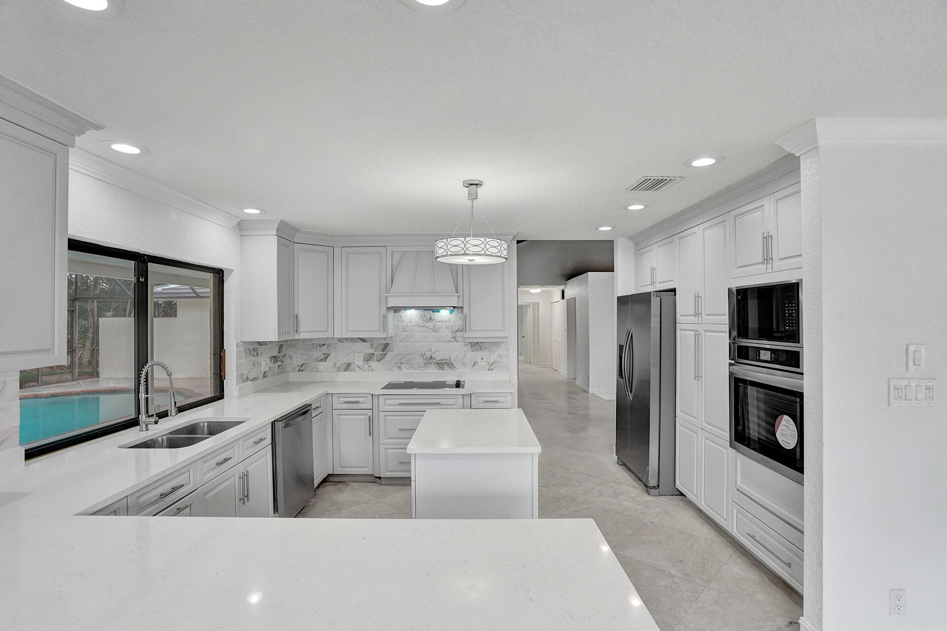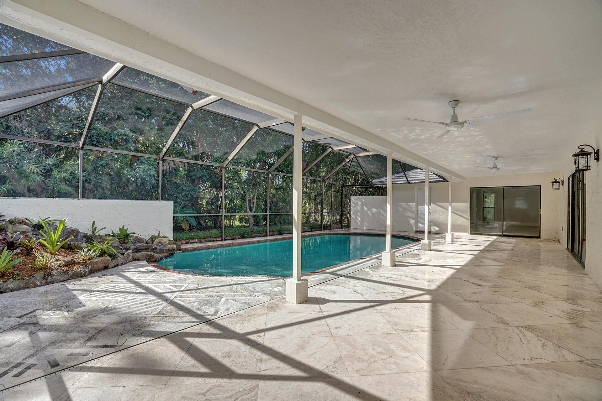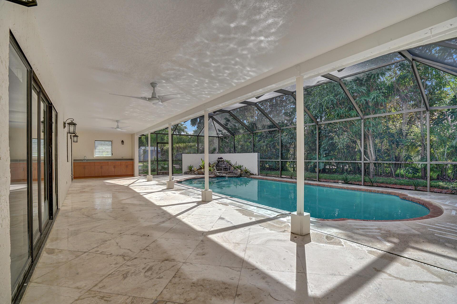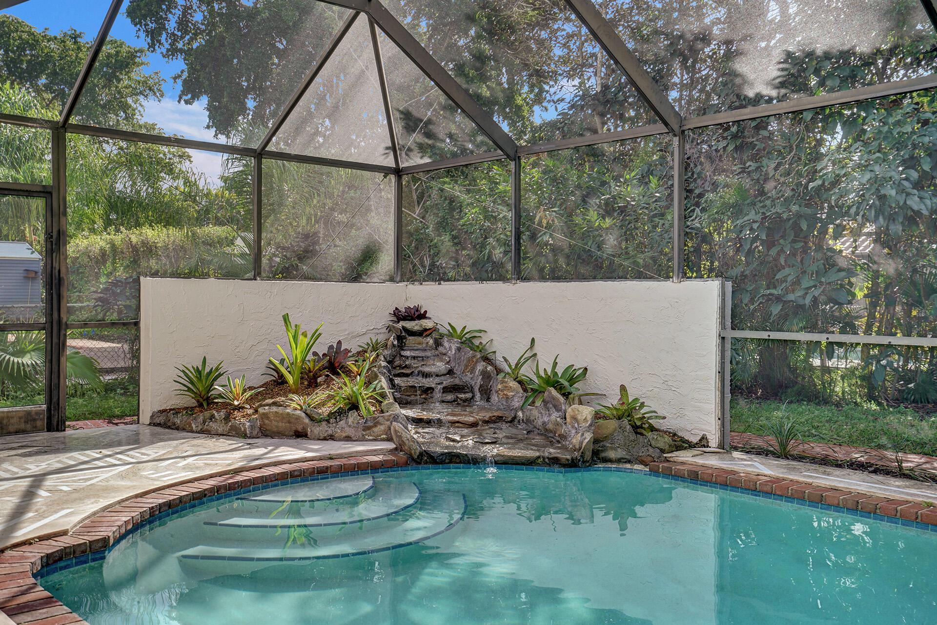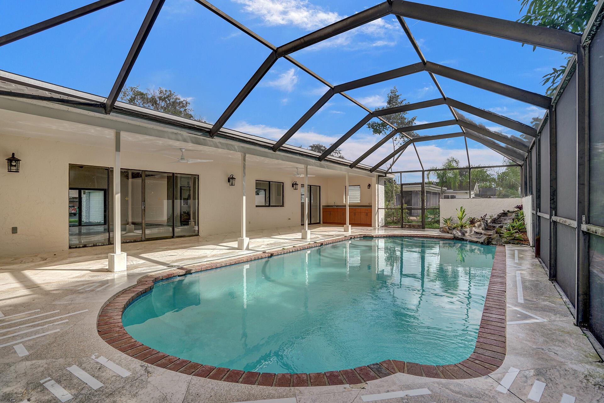 Seize the chance to view this recently renovated 4-bedroom, 2.5-bathroom home, nestled on an expansive lot, flaunting a generous circular driveway and a two-car garage. The newly installed flat tiled roof (April 2022) and partial impact windows and doors cannot be overlooked. Throughout, marble floors lead to stylish wooden cabinets in a contemporary layout, and the bathrooms feature dual sinks and modern touches. The refreshed kitchen boasts trendy paint tones, stainless steel appliances, and a breakfast nook adjacent to the formal dining area. An atrium off the kitchen offers an ideal space for a gym. Step outside to the vast pool deck, screened lanai, and serene waterfall adorning the pool patio.