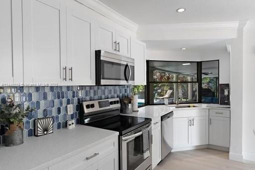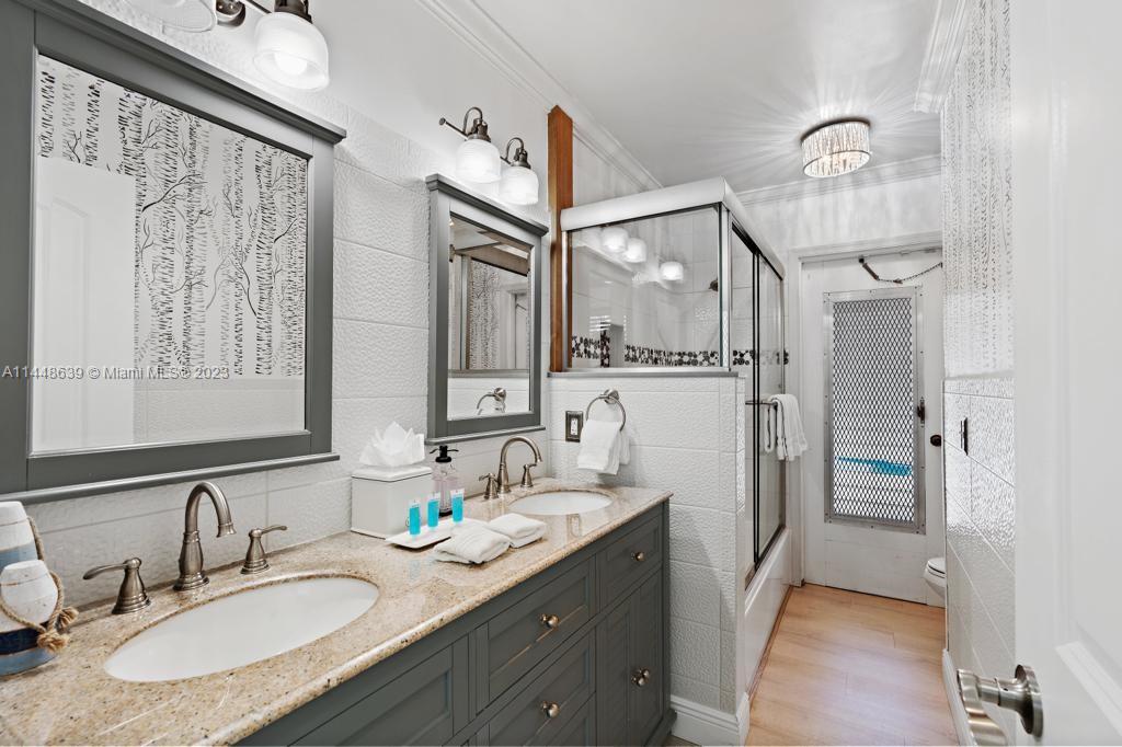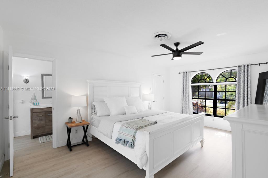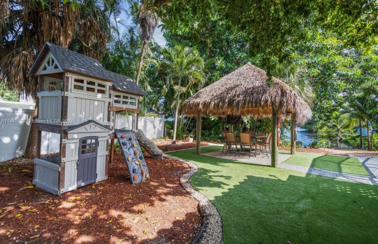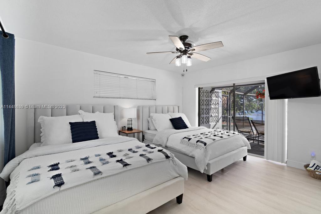 Beautiful, upgraded, lakefront mini resort. located in the heart of east Boca. Charming cathedral ceiling and grand sliding doors, incredible 1500 SF screened entertainment area, heated pool with two cabana baths. Convenient outside access from all rooms. Newly refinished kitchen, 12-seat island, artistic touches & creative storage. plenty of space for entertaining family and friends. Outside lake view which can be enjoyed from fire pit or custom-made 14x14 tiki hut (2020) or mini-golf area. low-maintenance synthetic turf, planting areas fitted with sprinkling system. Double garage, shed in the back yard with storage for hobbies. Inviting feel is reflected in all rooms. Primary bedroom suite features custom built-ins.1/3-acre lot. New roof 2019. AC 2014. Minutes to downtown and beach.