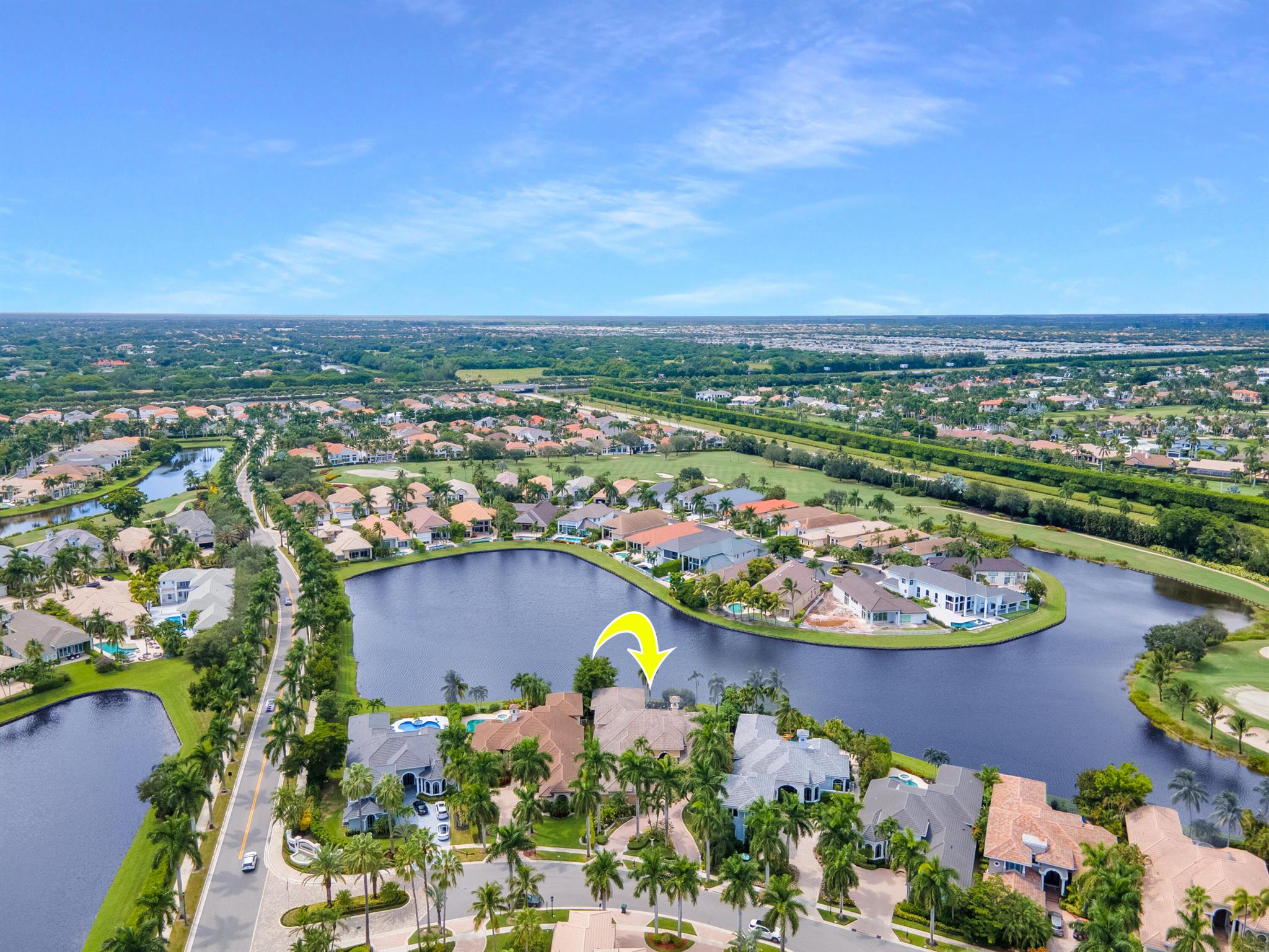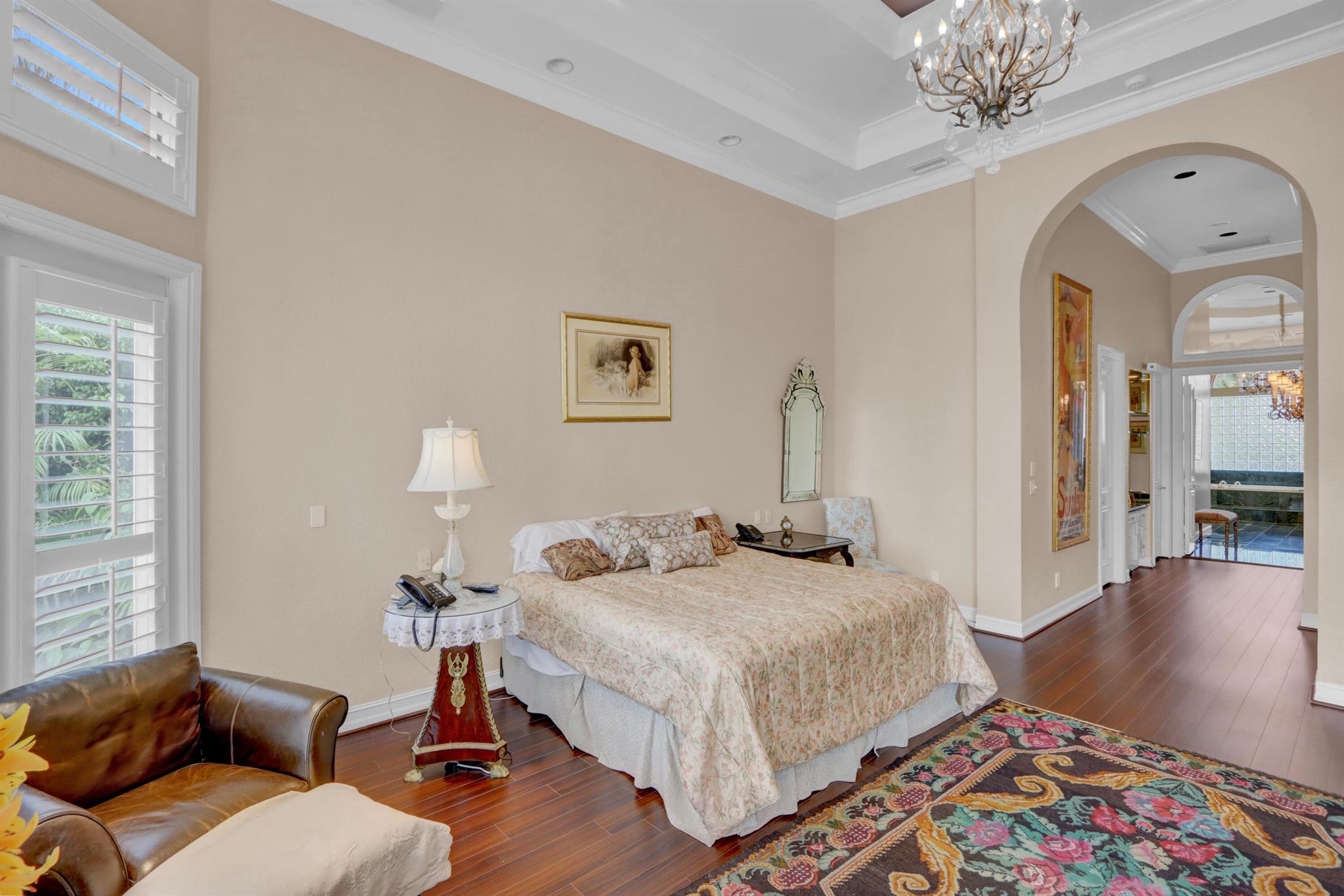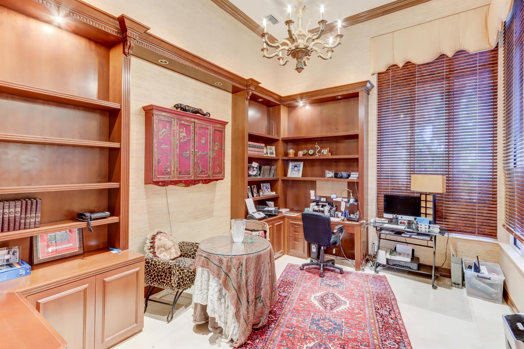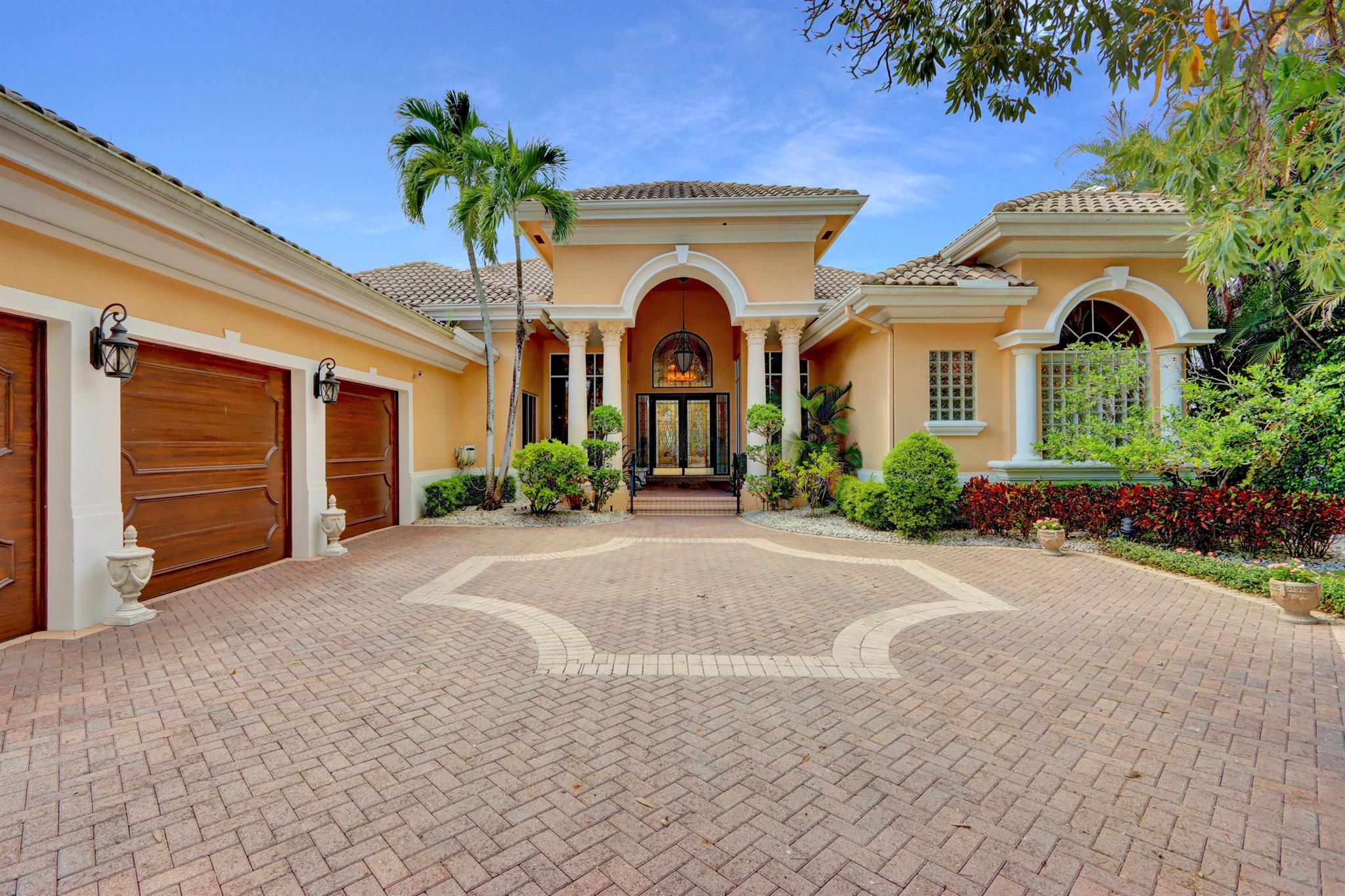 GOLF MEMBERSHIP TRANSFERABILITY! Don't miss this opportunity to play golf immediately! Lake views fill this sprawling custom one-story estate of Mediterranean old-world charm with 4 bedrooms plus an office,hobby room, 3-car garage & circular driveway featuring volume ceilings with crown moldings; Saturnia marble, hardwood & luxury vinyl floors; plantation shutters, wood blinds & custom shades; spacious Living Room with a fireplace & wet bar; elegant built-in library; island kitchen with white 42' cabinetry,black granite countertops & backsplash & a lovely breakfast nook overlooking the pool area & lake. The rear patio offers spacious open, covered & phantom screened areas with an oversized pool & spa and beautiful lake vistas!