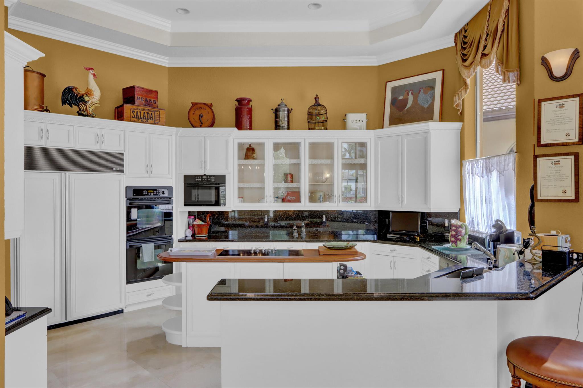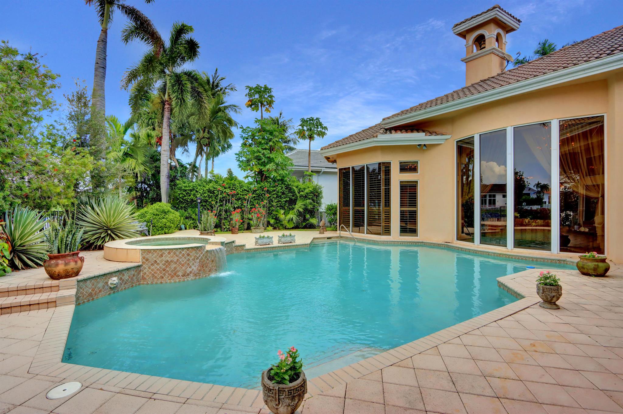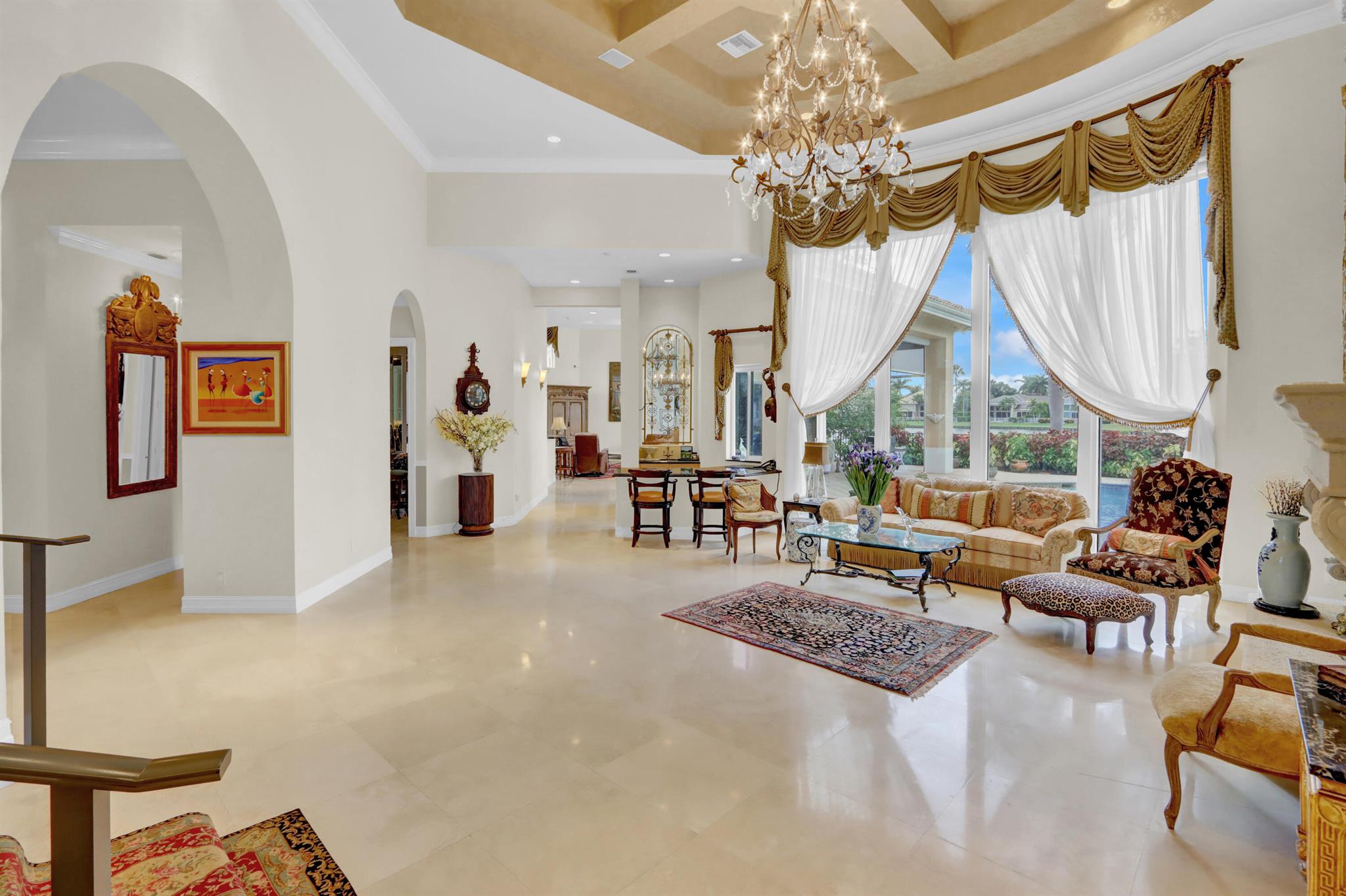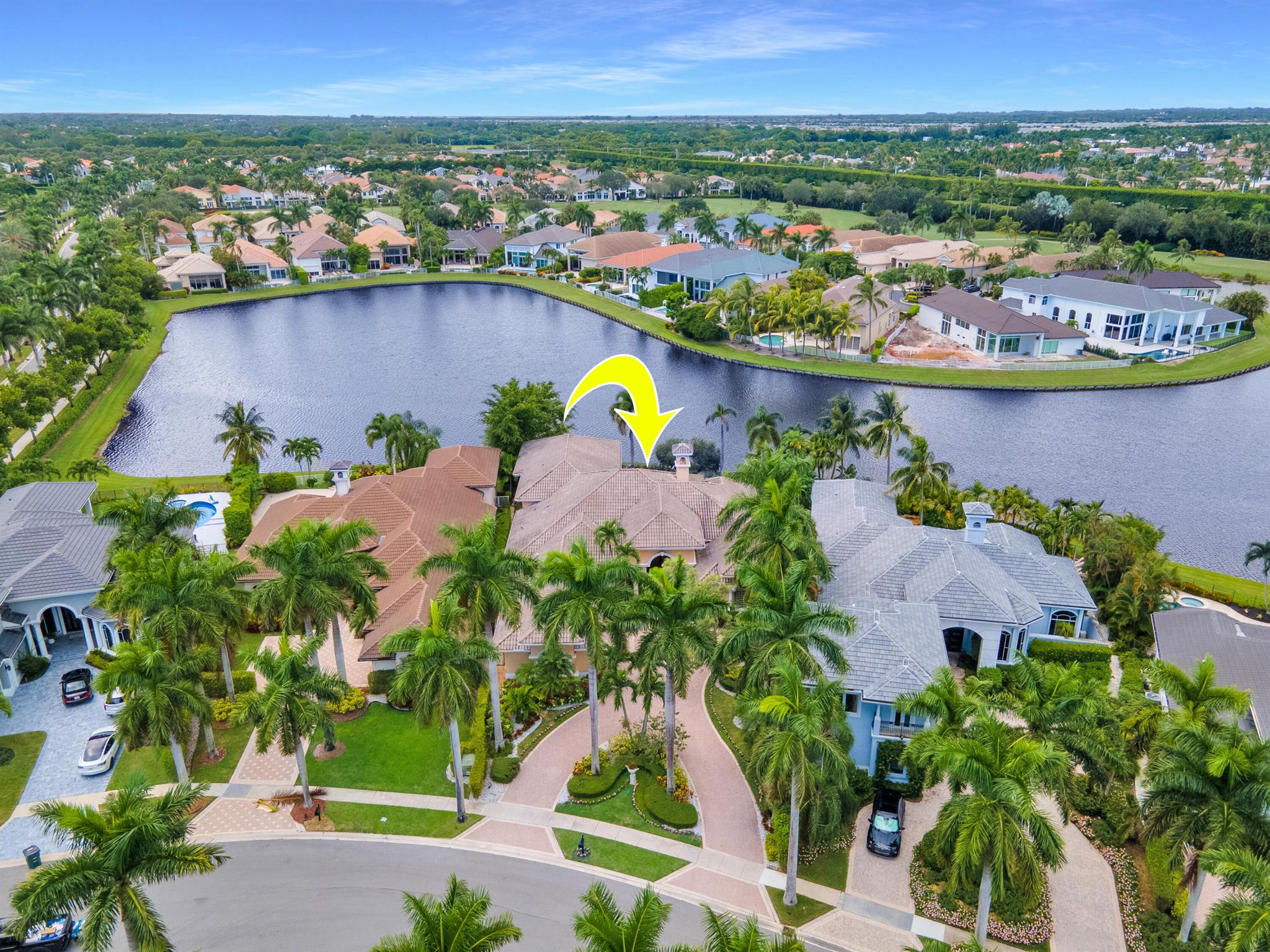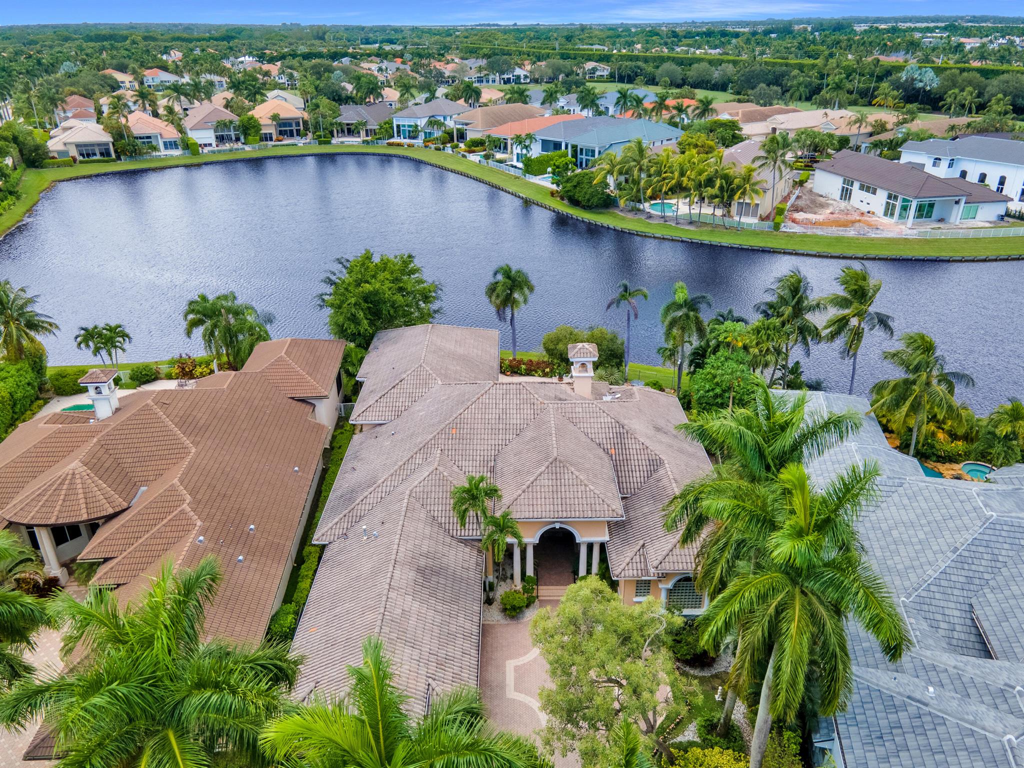 GOLF MEMBERSHIP TRANSFERABILITY! Don't miss this opportunity to play golf immediately! Lake views fill this sprawling custom one-story estate of Mediterranean old-world charm with 4 bedrooms plus an office,hobby room, 3-car garage & circular driveway featuring volume ceilings with crown moldings; Saturnia marble, hardwood & luxury vinyl floors; plantation shutters, wood blinds & custom shades; spacious Living Room with a fireplace & wet bar; elegant built-in library; island kitchen with white 42' cabinetry,black granite countertops & backsplash & a lovely breakfast nook overlooking the pool area & lake. The rear patio offers spacious open, covered & phantom screened areas with an oversized pool & spa and beautiful lake vistas!