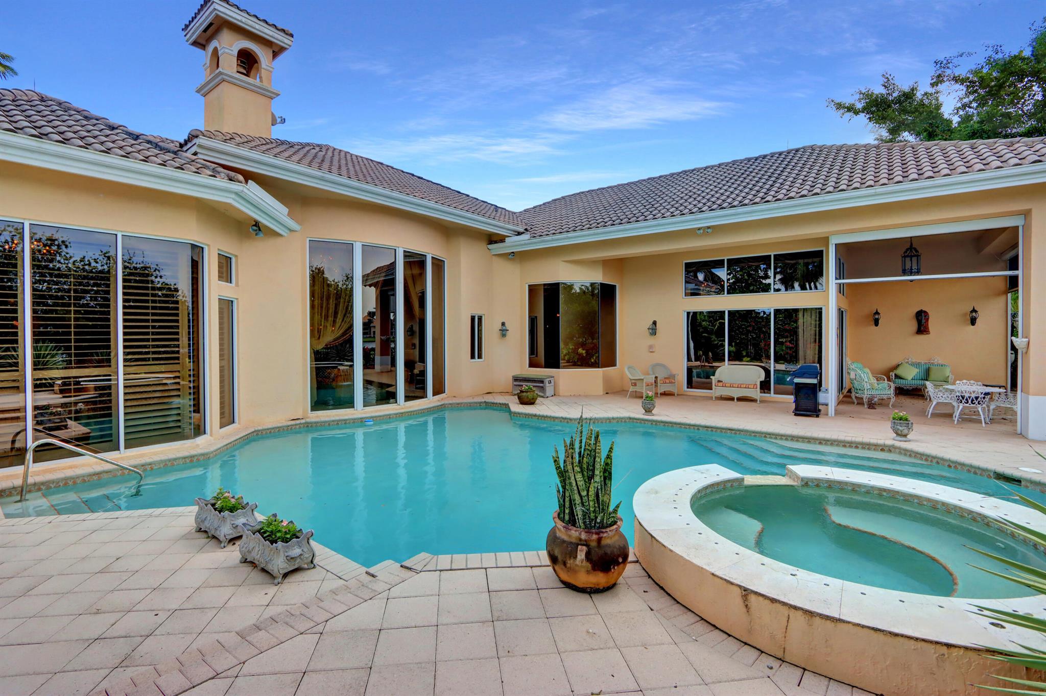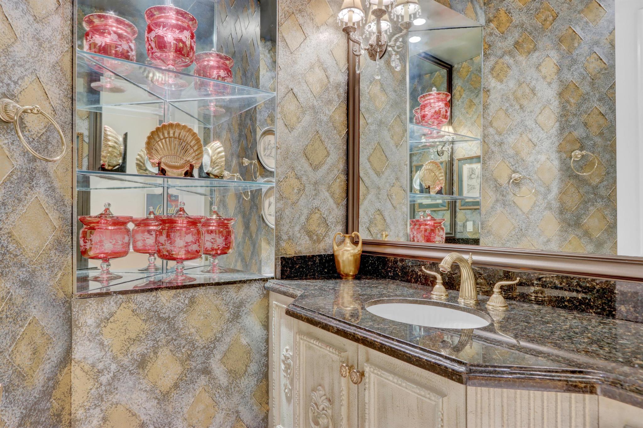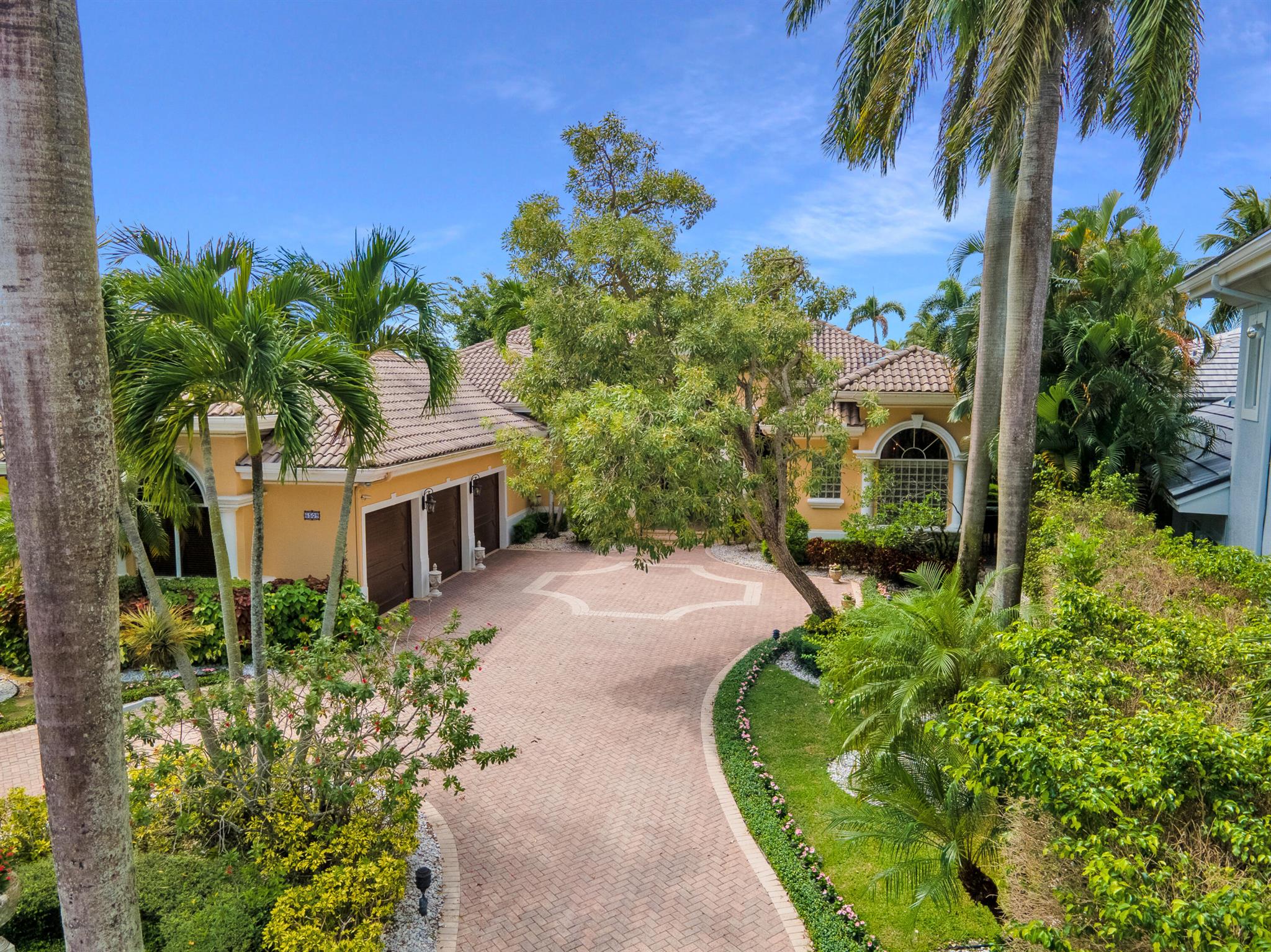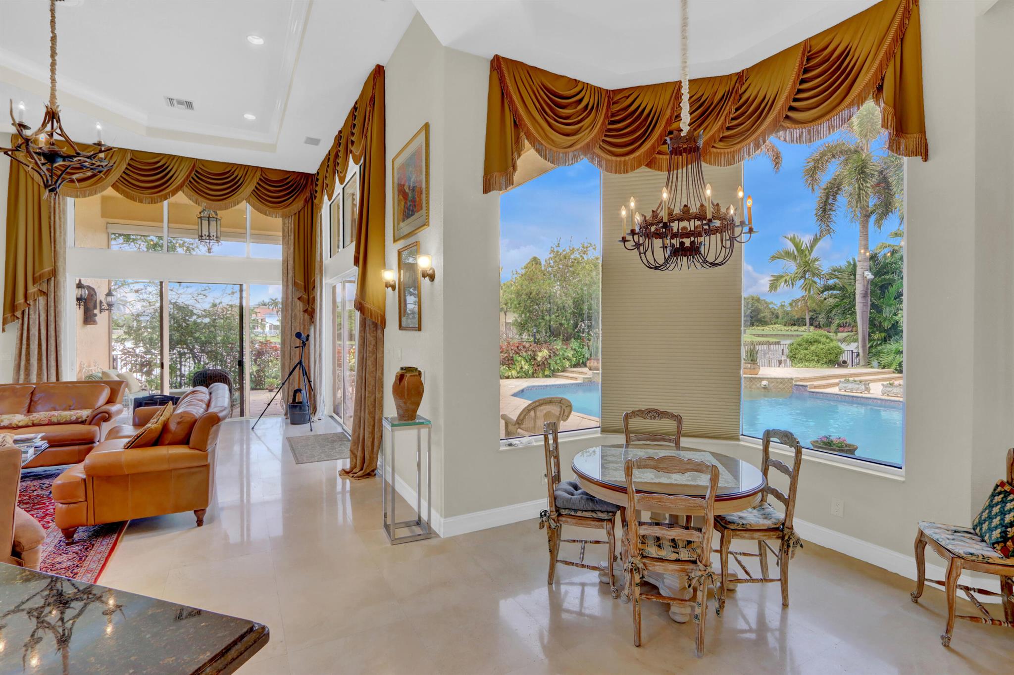 GOLF MEMBERSHIP TRANSFERABILITY! Don't miss this opportunity to play golf immediately! Lake views fill this sprawling custom one-story estate of Mediterranean old-world charm with 4 bedrooms plus an office,hobby room, 3-car garage & circular driveway featuring volume ceilings with crown moldings; Saturnia marble, hardwood & luxury vinyl floors; plantation shutters, wood blinds & custom shades; spacious Living Room with a fireplace & wet bar; elegant built-in library; island kitchen with white 42' cabinetry,black granite countertops & backsplash & a lovely breakfast nook overlooking the pool area & lake. The rear patio offers spacious open, covered & phantom screened areas with an oversized pool & spa and beautiful lake vistas!