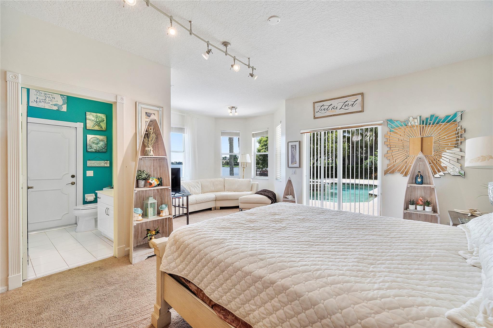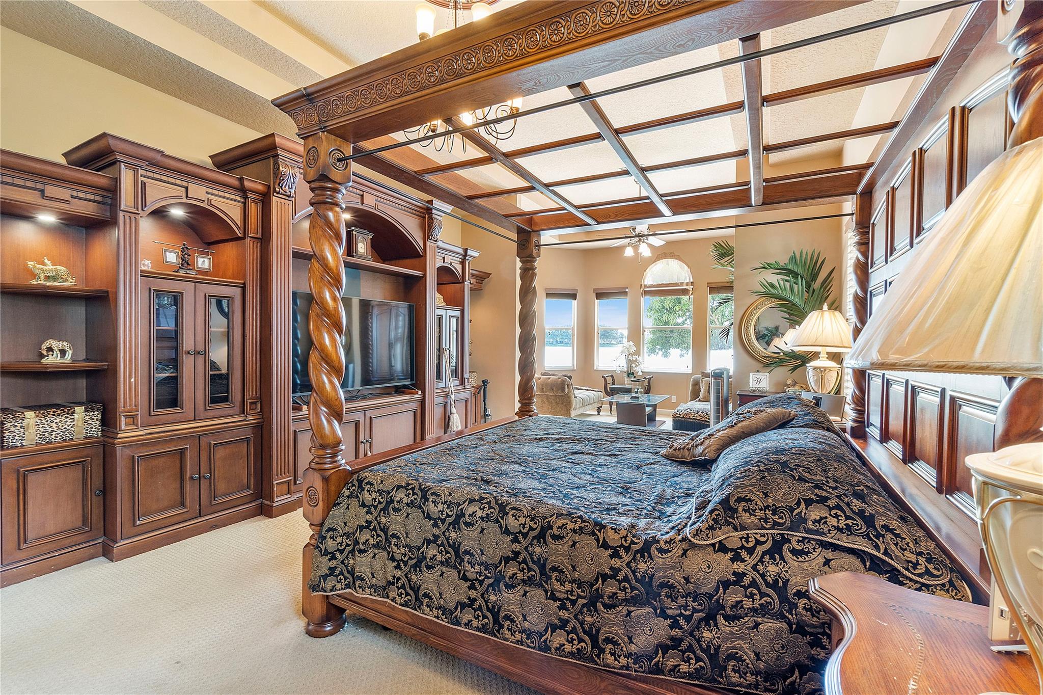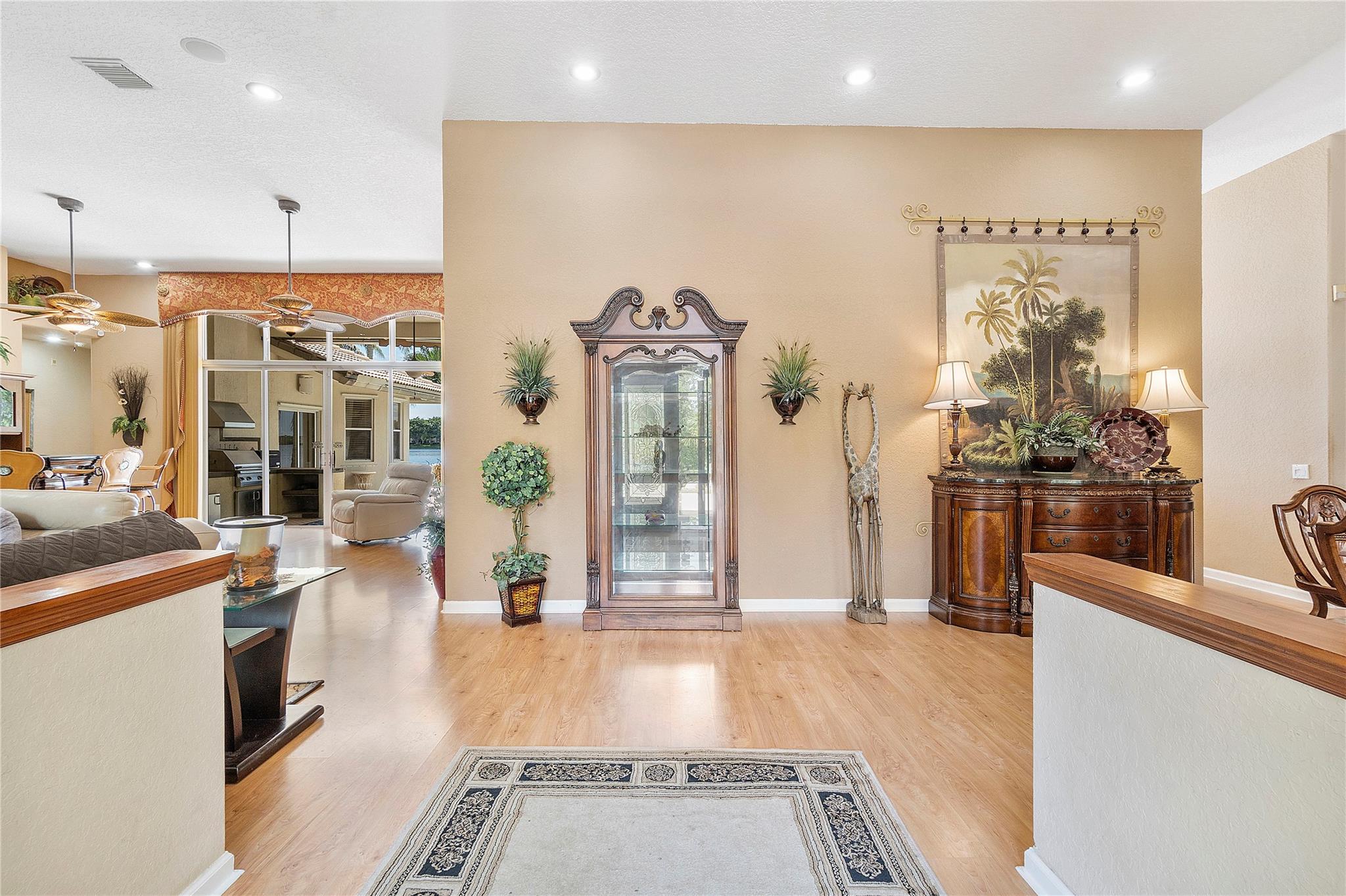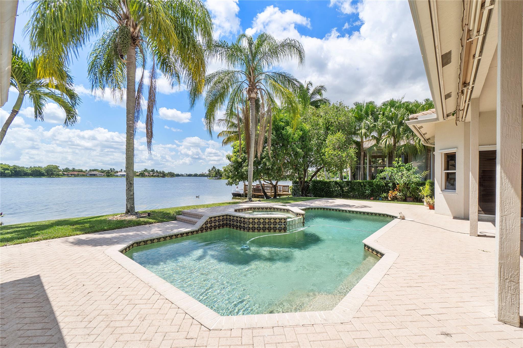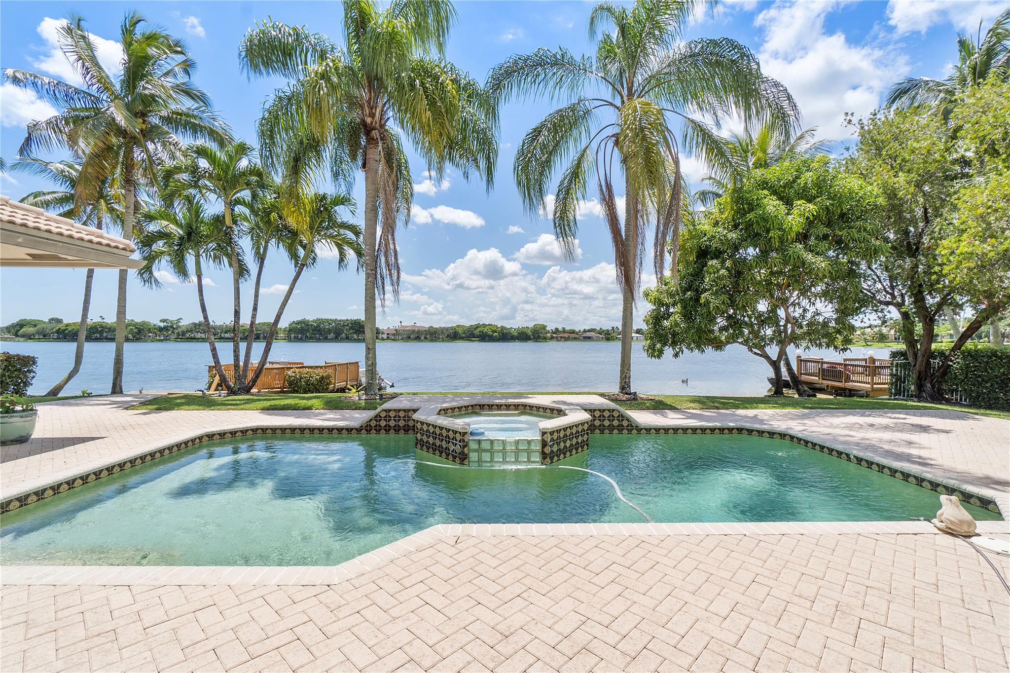 This 4 bedroom, 3.5 bathroom oasis has breathtaking views of 125 acre Lake. Boasting a circular driveway and 3 car garage, this spacious home features laminate floors throughout and carpeted bedrooms, recessed lights, surround sound speakers, and a bar with wine cooler. The kitchen is adorned with granite counters, a center cooking island, breakfast area, pantry and wood cabinets. With a spacious dining and living room, this triple split floor plan offers privacy and comfort. Relax in the large primary bedroom with sitting area and indulge in luxury with a large built-out walk-in closet. This tropical paradise also features a pool and hot tub in the backyard overlooking a huge lake perfect for boating. Enjoy the summer kitchen for BBQs with delicious mango and avocado trees.