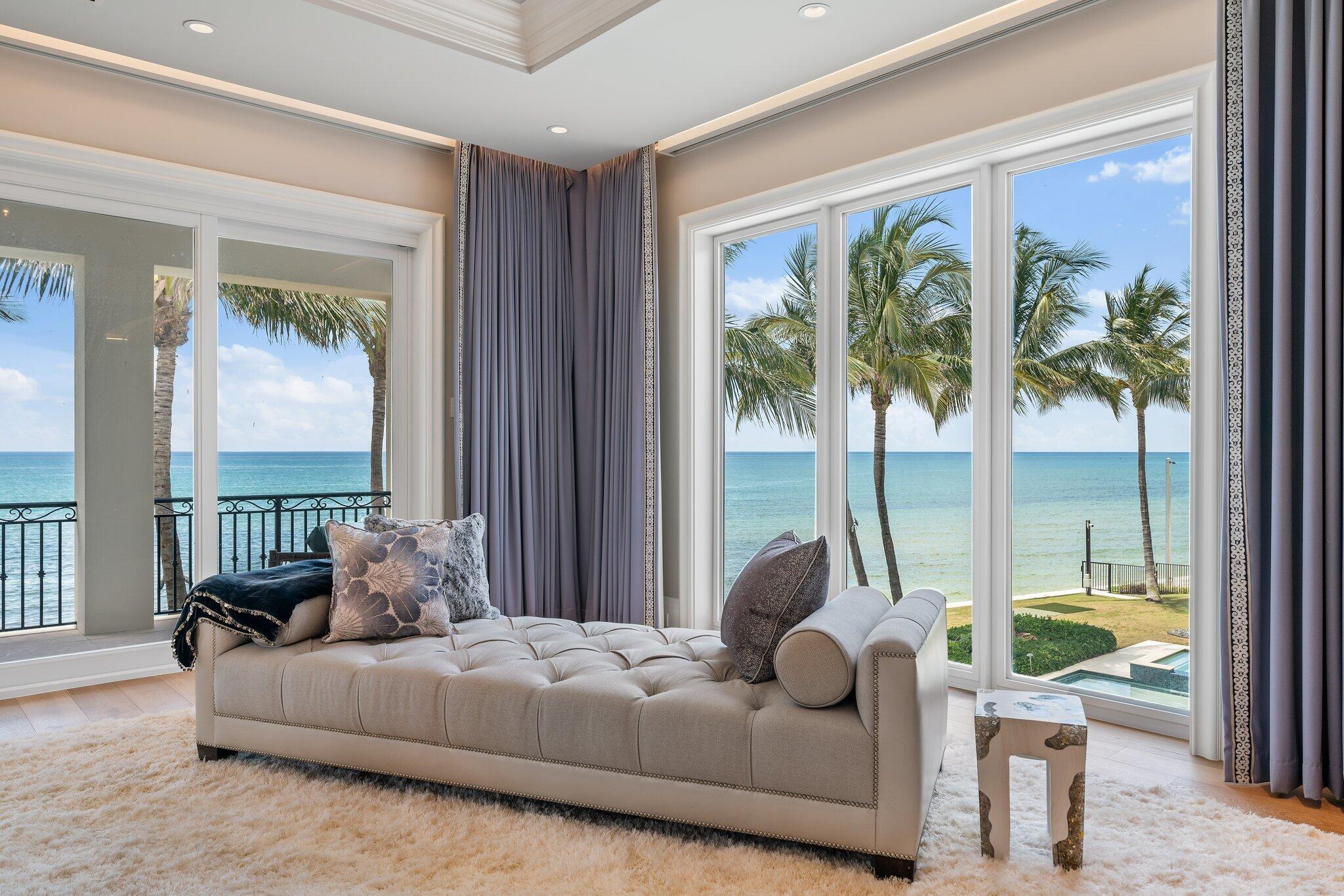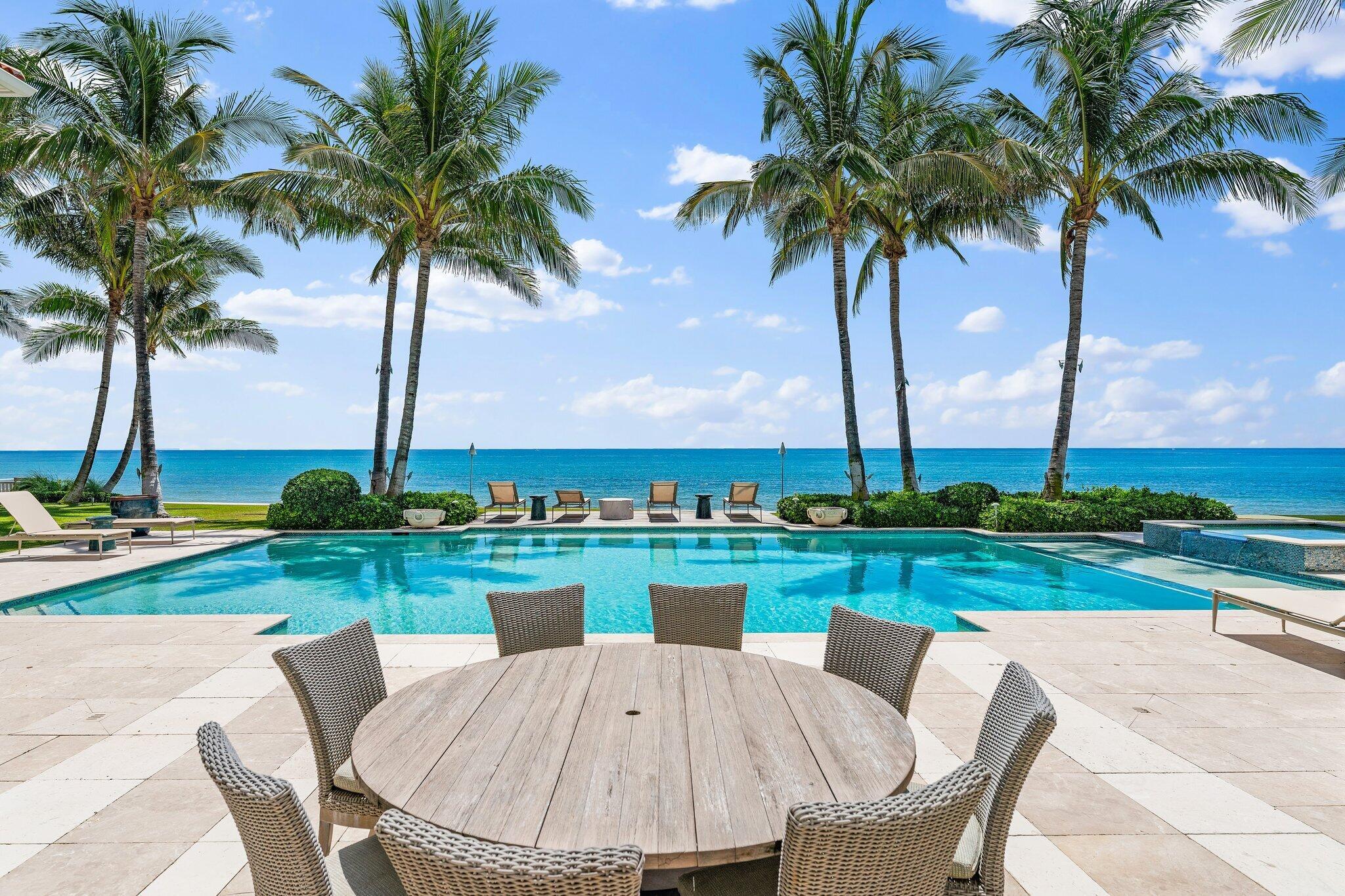 ''Villa Oceano Azul'' -1400 S Ocean Blvd. Manalapan, Florida. This magnificent estate residence is situated between the Atlantic Ocean and the Intracoastal Waterway in the exclusive estate section of Manalapan. As its name implies, this extraordinary property totals nearly 2 acres with over 200 feet of direct oceanfront and an accompanying 200 feet on the Intracoastal Waterway equipped with a full-service concrete dock. Offered fully furnished and turnkey with transitional coastal inspired interiors by Marc-Michaels Interior Design, this stunning European-inspired Villa creates graciously proportioned rooms in a grand total of 20,712 square feet with seven bedrooms, nine full and four half baths, including a guest house.