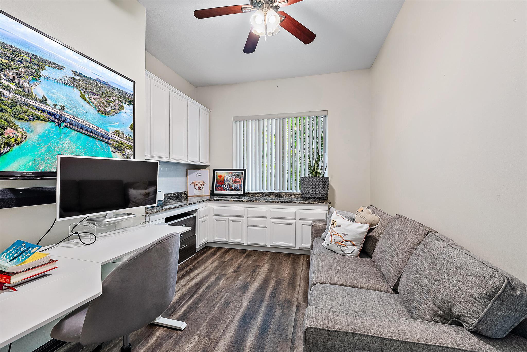 This upgraded and renovated great room home offers private water vistas and one of the most open floor plans in Ibis. The architecturally exciting ''Briarcliff'' model boasts soaring ceilings, and a versatile layout. The kitchen and both bathrooms were renovated six years ago and feature replaced, upgraded stainless appliances, granite counter tops, designer back splashes and more. The HVAC, washer and dryer are two years new. The extended back patio fence is four years new. Wood flooring in both bedrooms and the office. The main bedroom sliders are impact glass, and the house features panel shutters for protection. Built-ins in the dining room, great room and office. Extensive crown molding, designer fans and fixtures throughout.