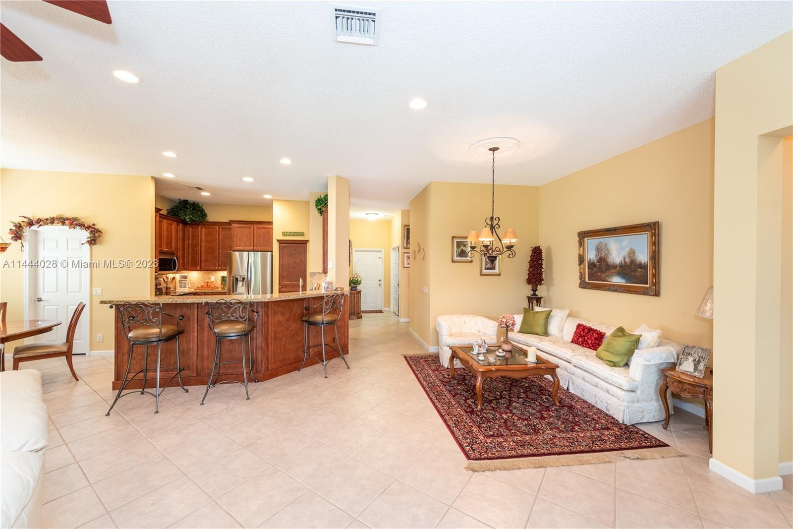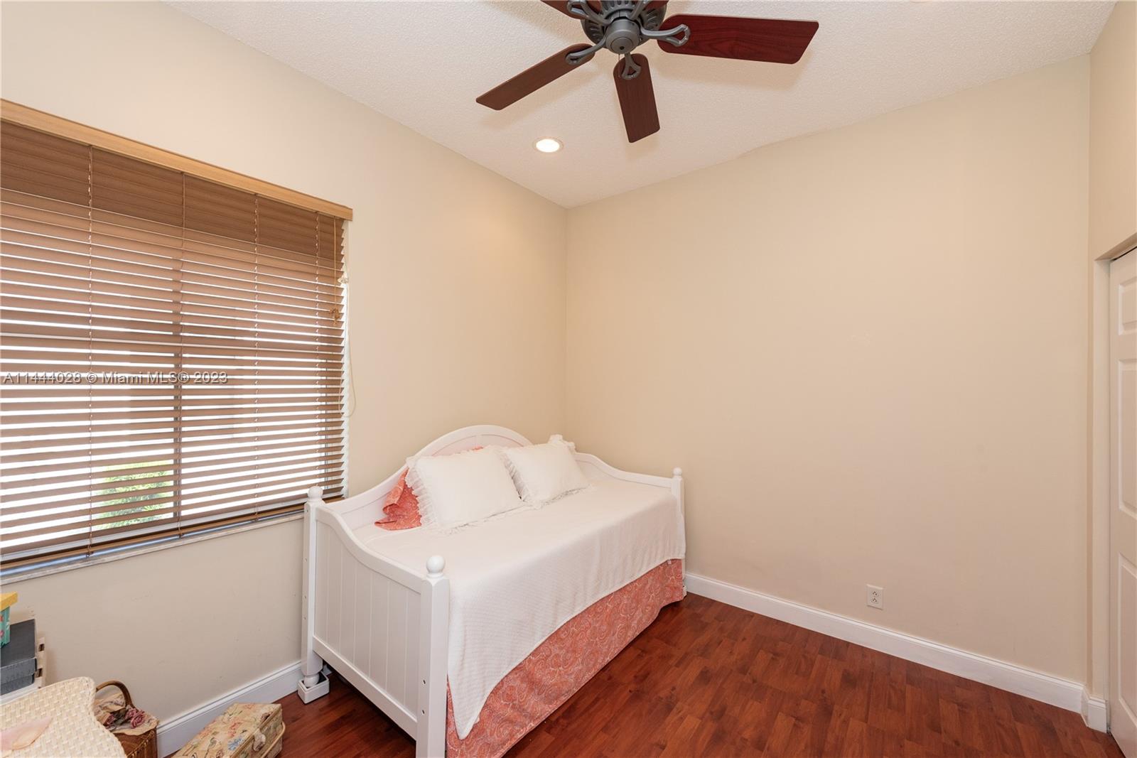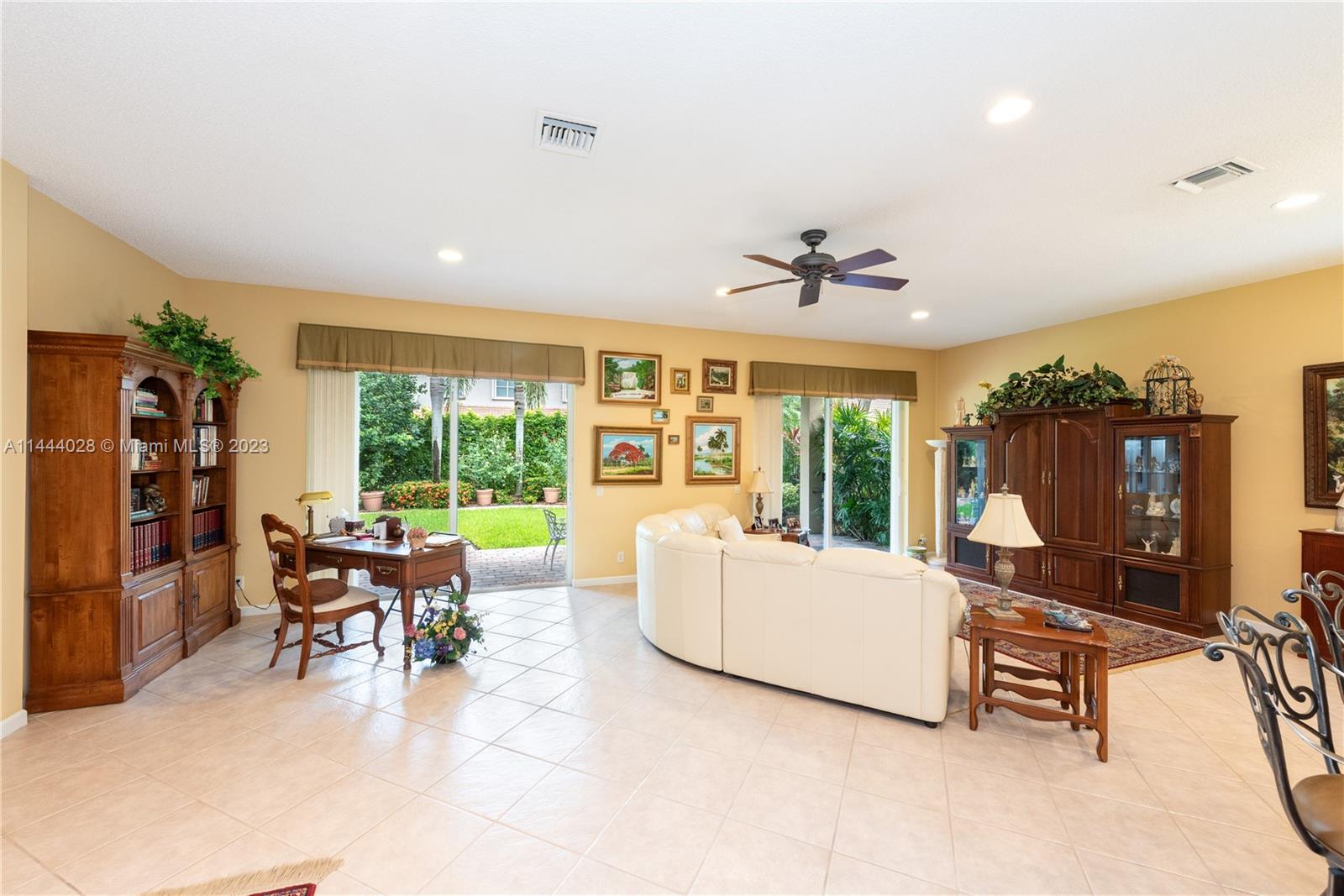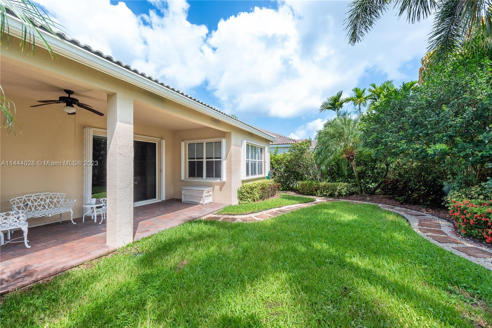Savanna is one of Weston's highly desirable gated communities. This impeccable home is move-in ready, with a superb layout for entertaining. The living, kitchen, and family rooms are all integrated with bright, ample areas facing the beautifully landscaped backyard, which you can access through two different sliding doors. The backyard features a large overhang paved area with fan. The house has a split floor plan with 2 AC's, lots of light and a 4th bedroom that has been converted into an office. The kitchen has solid wood cabinets, granite counter tops, and stainless steel appliances. The laundry room is under AC with a utility sink. Accordion shutters. A+ Schools, some of the best in Broward County.No Association Approval required.