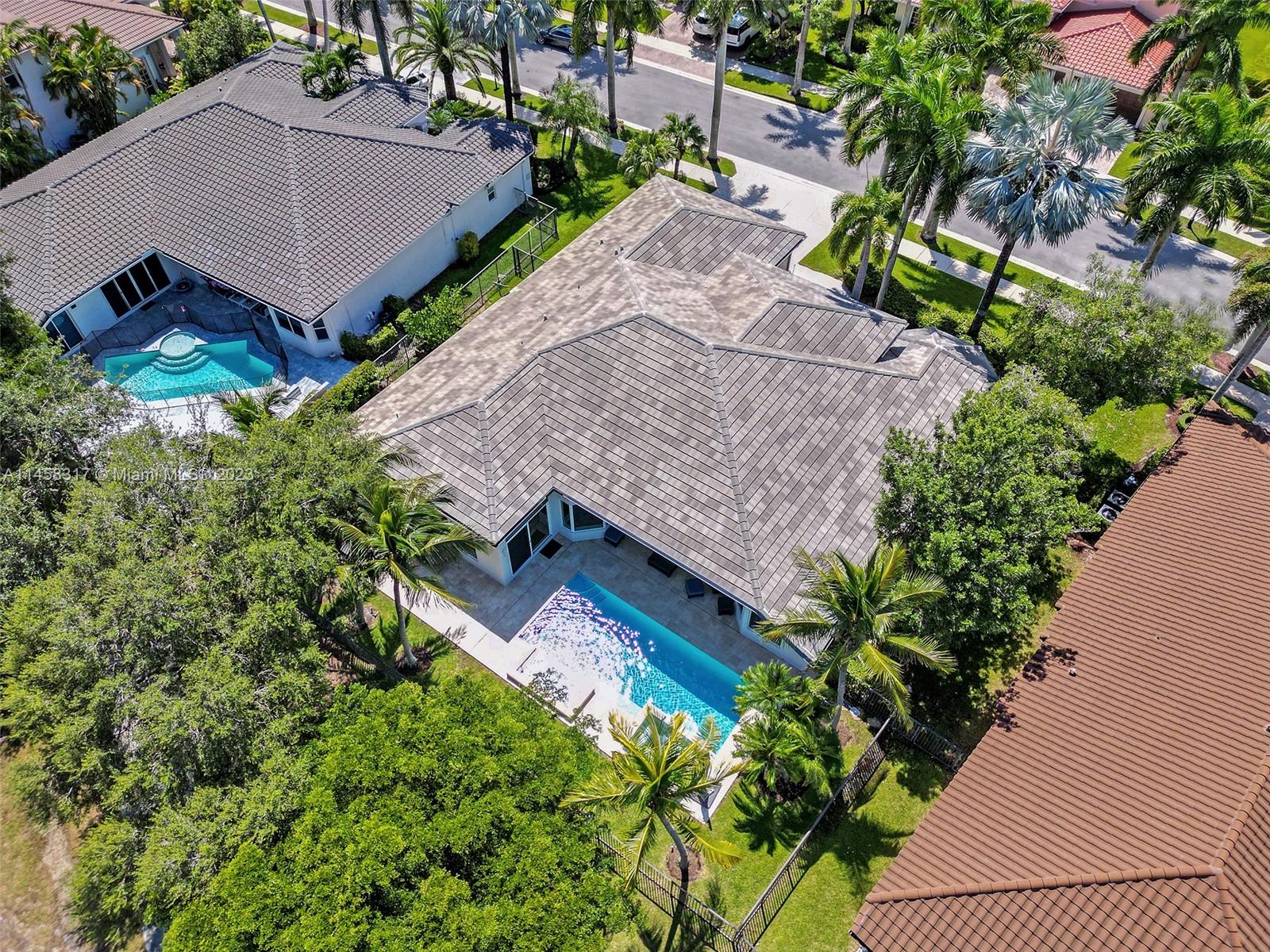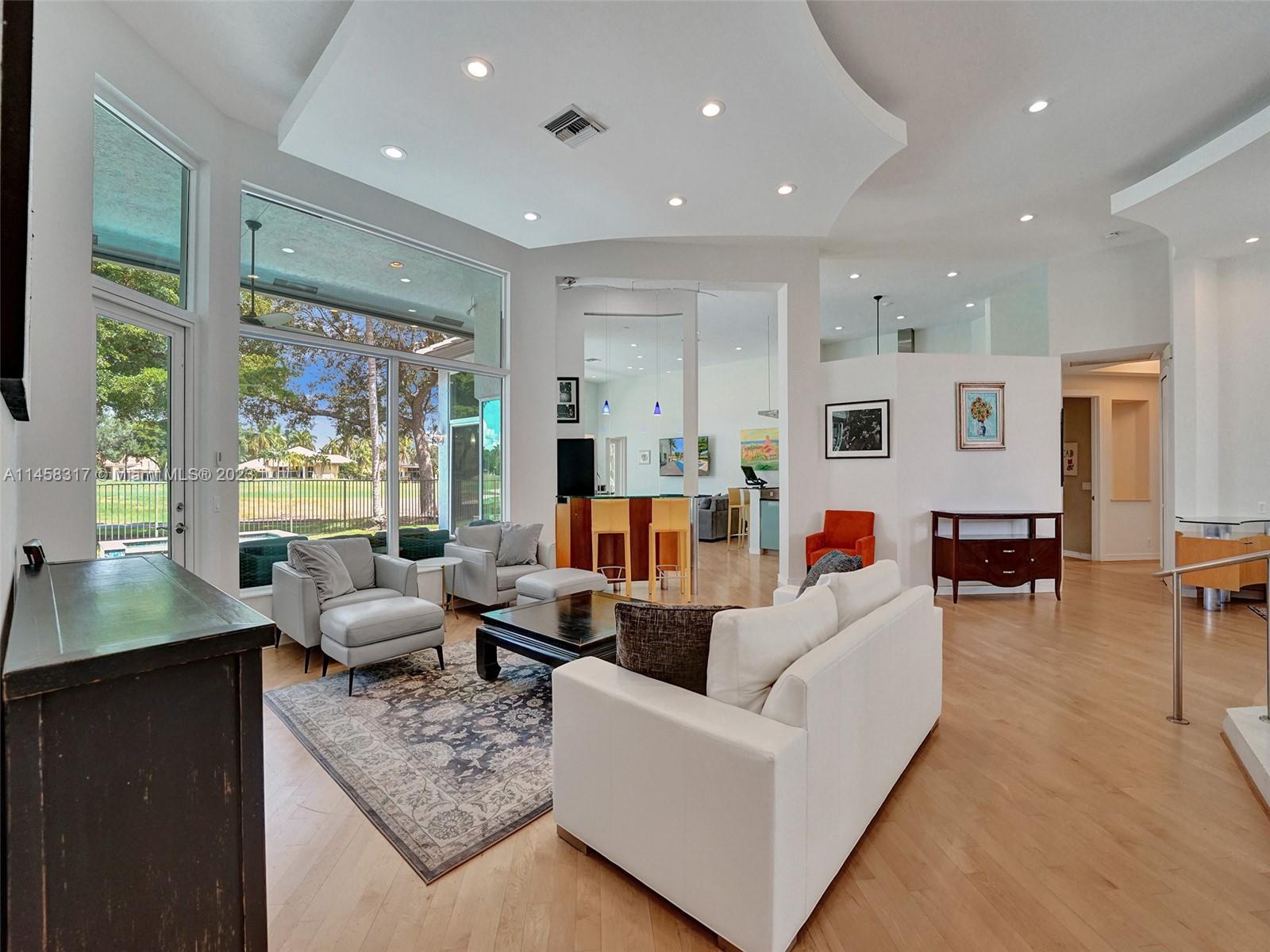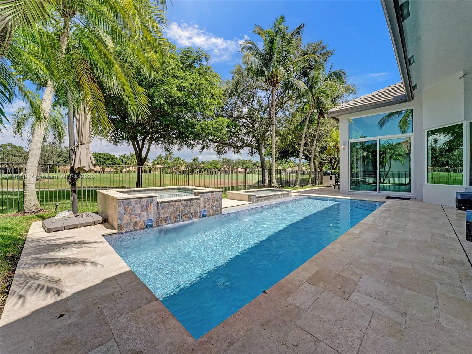 Modern Luxury Living in the exclusive gated community of Weston Hills CC, this residence overlooks the 3rd hole of the Players Course. BRAND NEW ROOF and FULL IMPACT windows and doors. Solid oak wood floors in the living areas, high-detailed ceilings, LED lighting, and abundant natural light. The primary suite offers a tranquil retreat, dual walk-in closets, a NEWLY RENOVATED OWNERS BATH with porcelain finishes, a vessel tub, a shower, and dual sinks. MODERN KITCHEN outfitted with high-end stainless steel appliances—Miele cooktop, double wall oven, and Subzero refrigerator. Secondary bedrooms boast new laminate flooring and walk-in closets. NEWLY RENOVATED TRAVERTINE POOL DECK surrounds the resurfaced, heated saltwater pool and spa—a private oasis with picturesque golf course vistas.