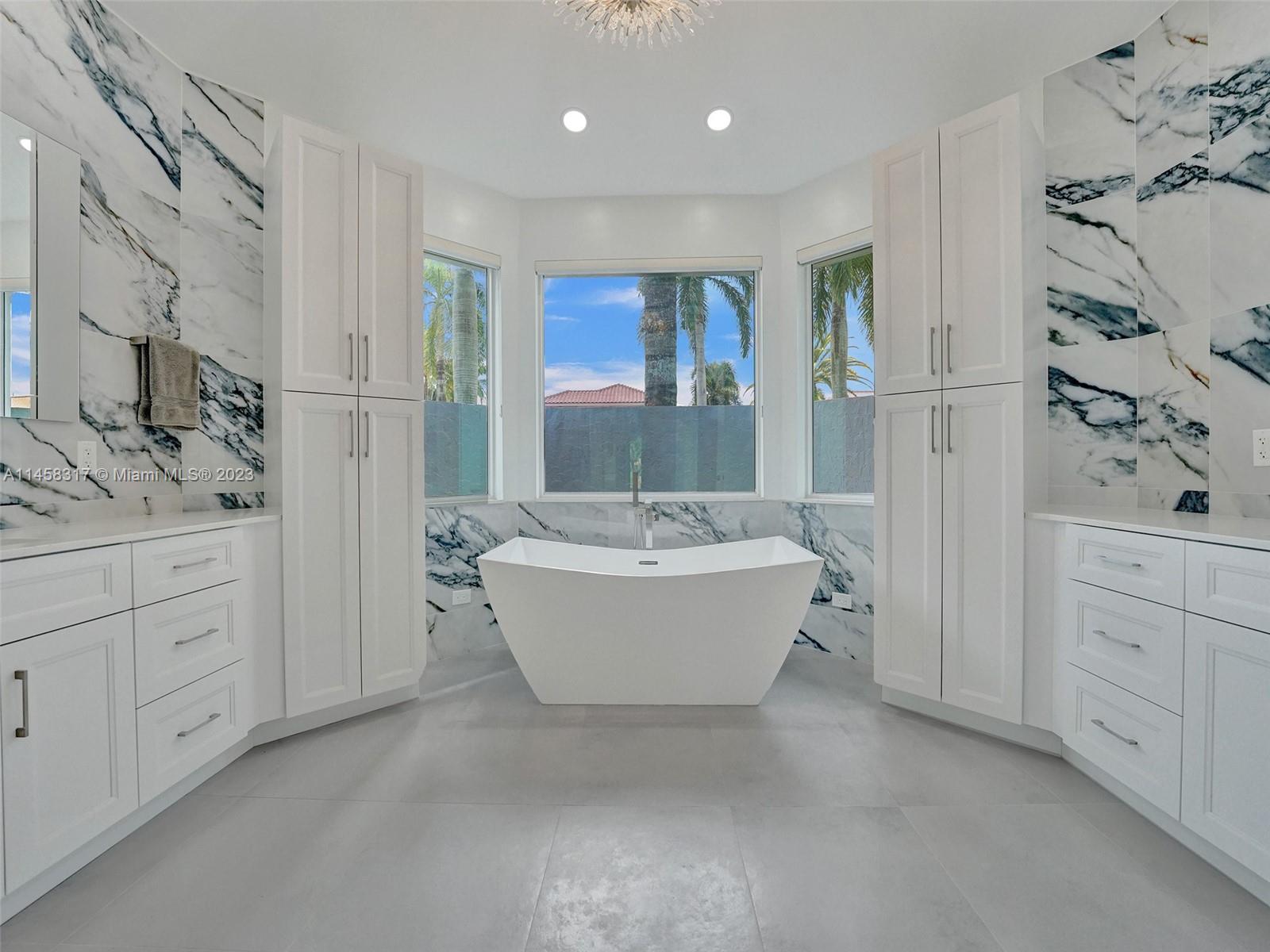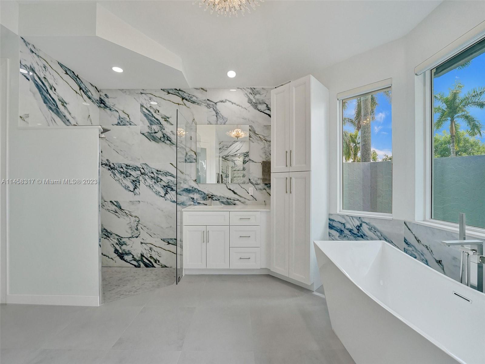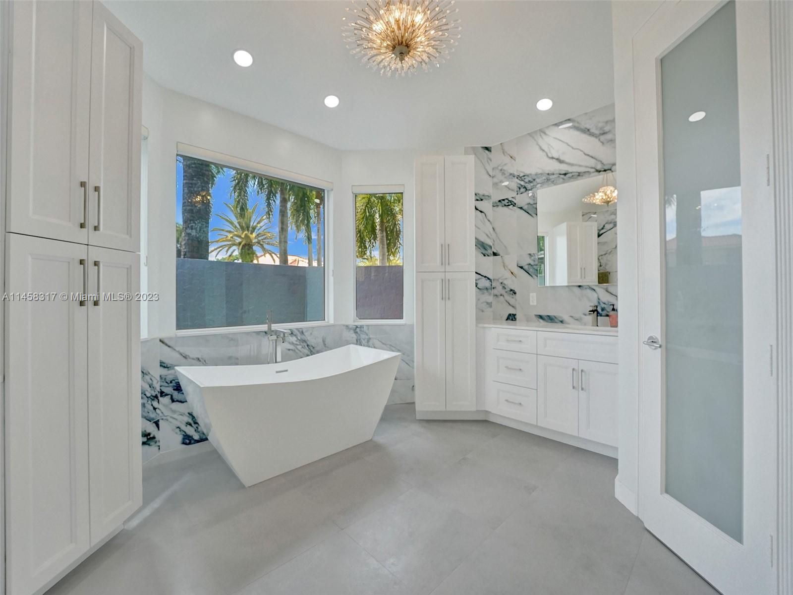Modern Luxury Living in the exclusive gated community of Weston Hills CC, this residence overlooks the 3rd hole of the Players Course. BRAND NEW ROOF and FULL IMPACT windows and doors. Solid oak wood floors in the living areas, high-detailed ceilings, LED lighting, and abundant natural light. The primary suite offers a tranquil retreat, dual walk-in closets, a NEWLY RENOVATED OWNERS BATH with porcelain finishes, a vessel tub, a shower, and dual sinks. MODERN KITCHEN outfitted with high-end stainless steel appliances—Miele cooktop, double wall oven, and Subzero refrigerator. Secondary bedrooms boast new laminate flooring and walk-in closets. NEWLY RENOVATED TRAVERTINE POOL DECK surrounds the resurfaced, heated saltwater pool and spa—a private oasis with picturesque golf course vistas.