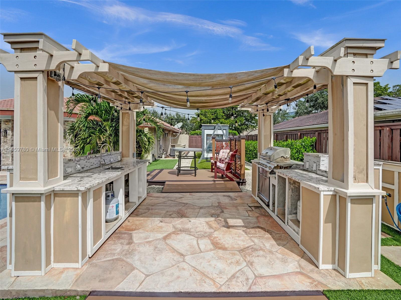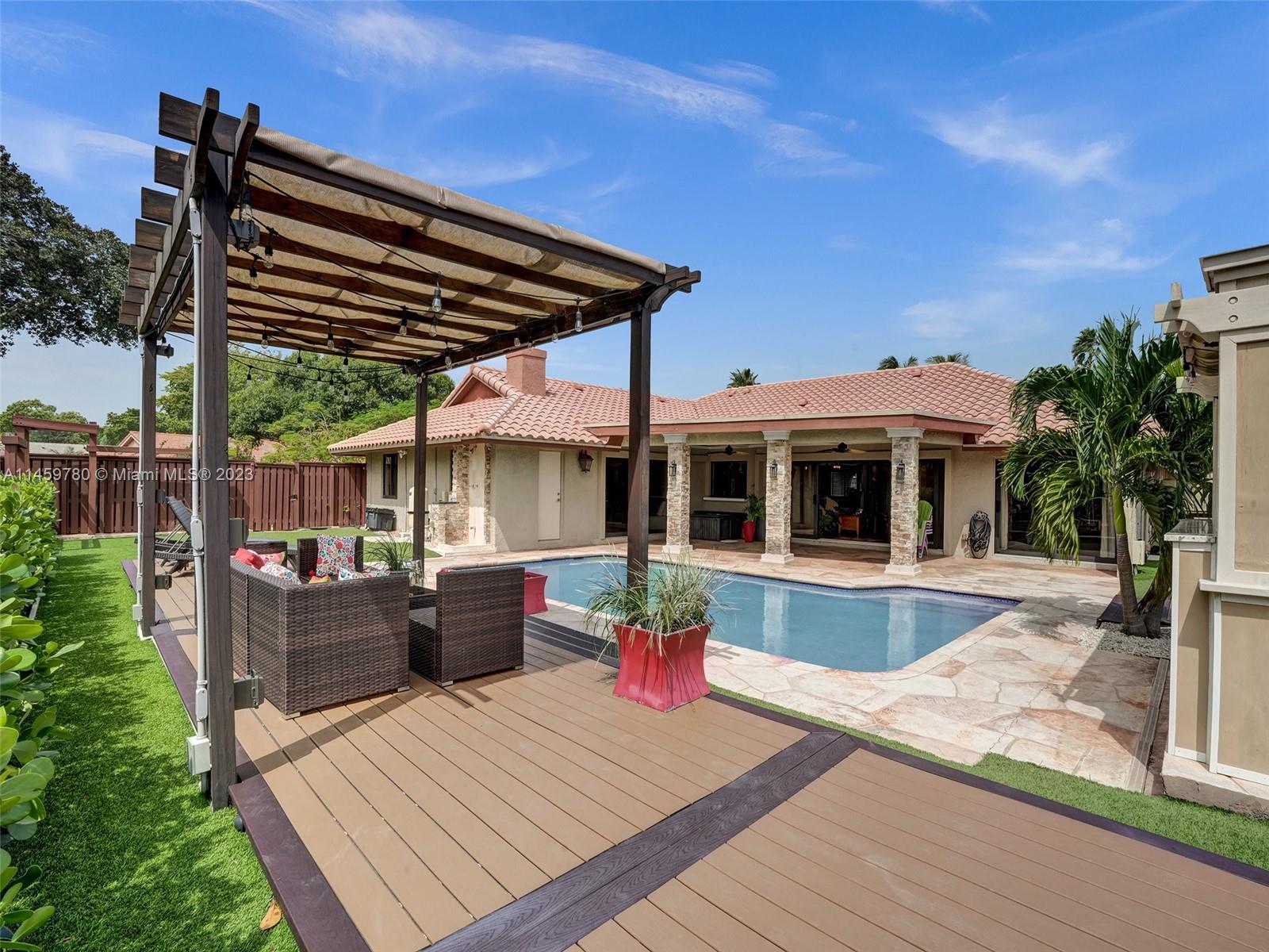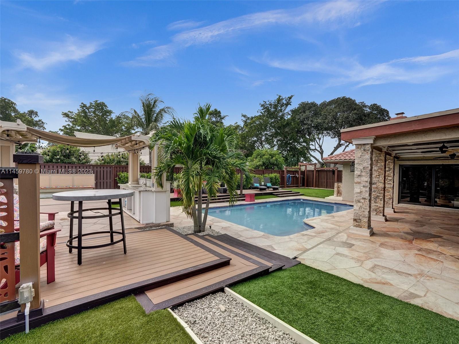 Welcome to your dream home! This spacious updated 4/3 property is nestled on a generous corner lot, boasting a captivating circular driveway and a two-car garage with an extra side driveway. The exterior is an oasis featuring a large terrace, a sparkling pool surrounded by lush synthetic grass, an outdoor kitchen, and a convenient outdoor shower. Step inside to discover a 3-way split floor plan that offers both privacy and functionality. The expansive kitchen is a chef's delight, complete with dual wall ovens, abundant counter and pantry space, and dining area. Enjoy the cozy fireplace in the family room, perfect for creating a warm ambiance. This home also features a separate family room & living room, providing ample space for relaxation and entertainment. A-rated schools and NO HOA.